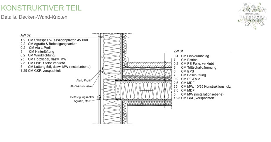 Der zeitgemäße Neubau bietet Platz für weitere 100 Kinder und wird in Holzbauweise errichtet. Das Projekt wird aus baukonstruktiver, bauphysikalischer und gestalterischer Sicht betrachtet und bearbeitet.