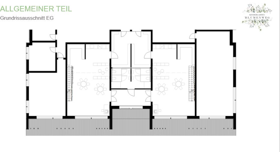 Der Kindergarten bietet auf der Nord-, Ost- und Südseite des Gebäudes Zugänge in den Garten. Der Zugang liegt auf der Westseite des Grundstücks. Die beiden Bewegungsräume und der Speiseraum mit integrierter Küche sind auf der Ostseite situiert, die Gruppenräume jeweils auf der Nord- und Südseite. Weitere Räume für das Personal und der Multifunktionsraum sind auf der Westseite angeordnet.