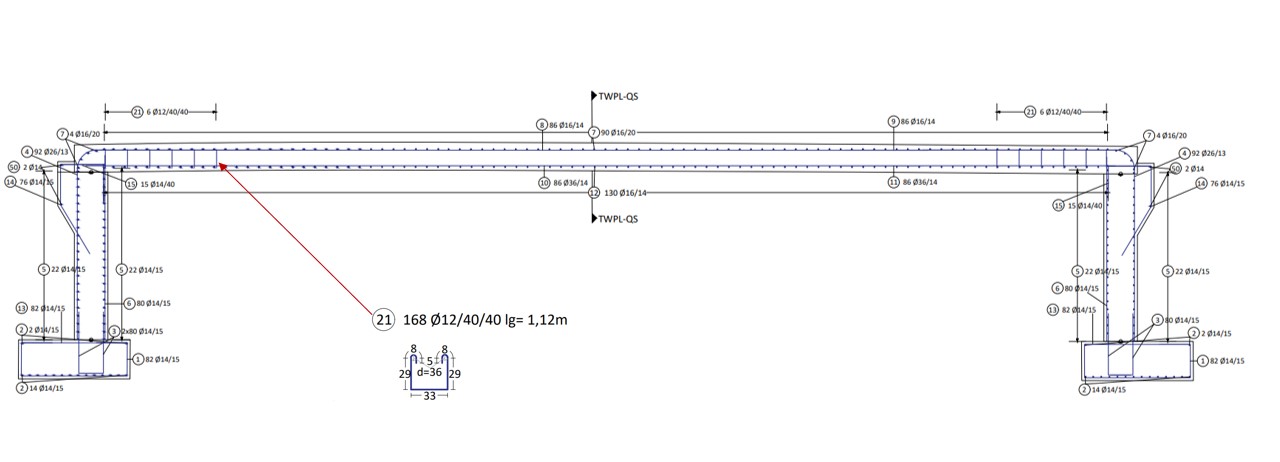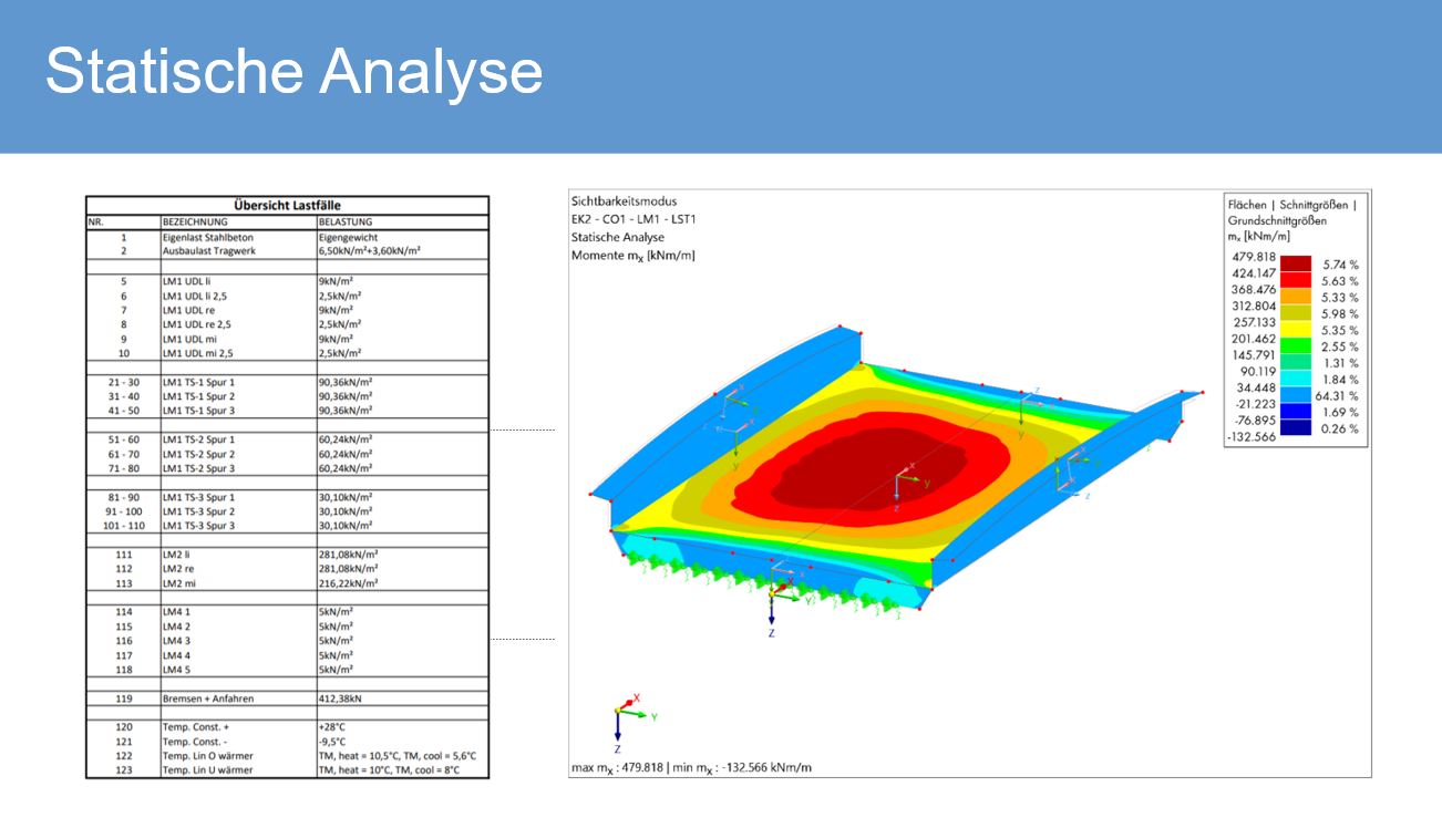 During the design phase, two different reinforced concrete variants of the bridge were agreed. The bridge superstructure was pre-measured with various calculation software and described constructively in the further course of this work. In addition, a possible underpass was planned. As a basis for the design of the structure, the static analysis of all effects on the bridge was required.