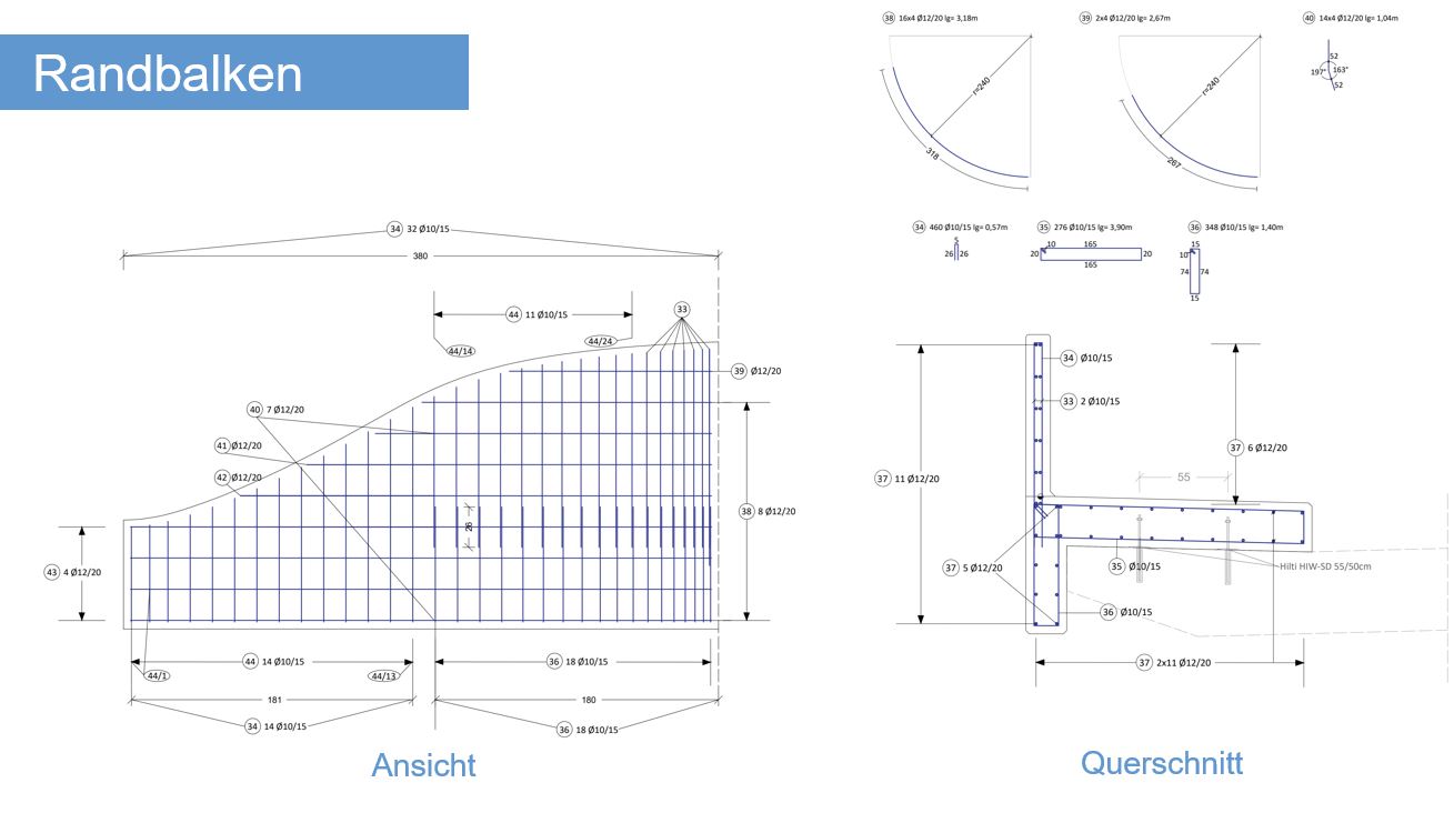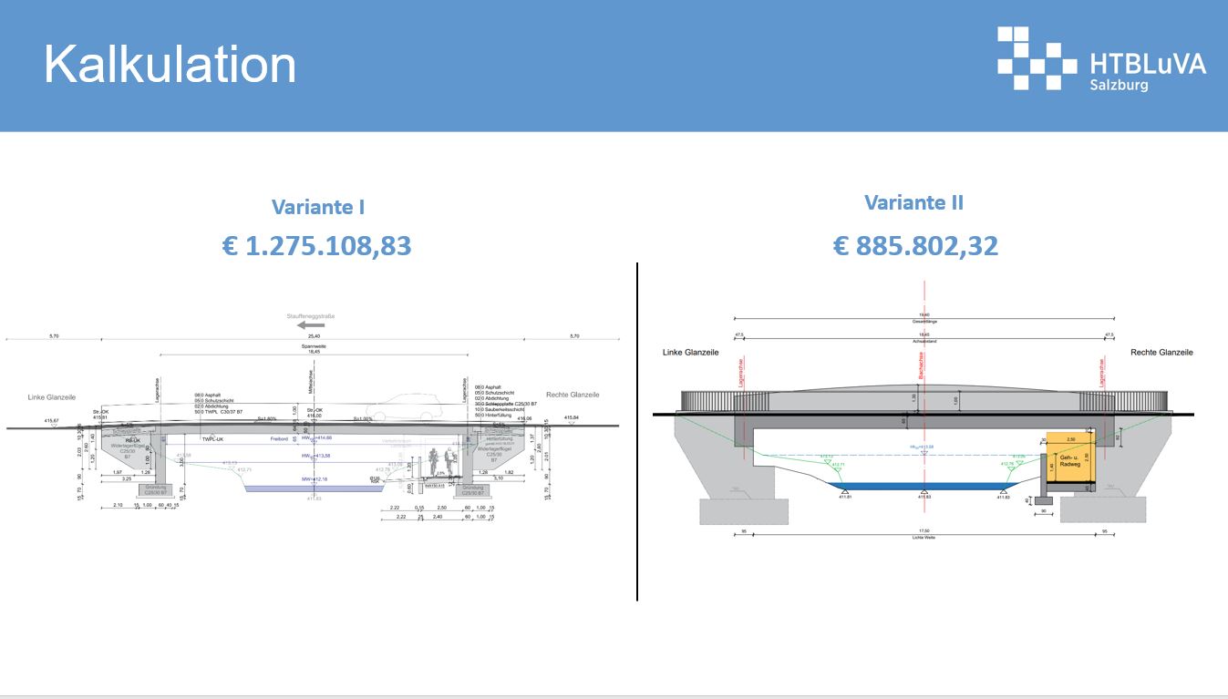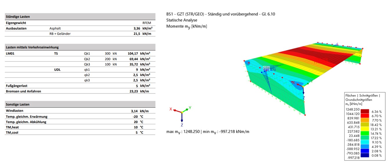 In der Entwurfsphase einigte man sich auf zwei verschiedene Stahlbeton-Varianten der Brücke. Mit diversen Berechnungssoftwares wurde der Brückenoberbau vorbemessen und im weiteren Verlauf dieser Arbeit konstruktiv beschrieben. Zusätzlich wurde eine mögliche Unterführung geplant. Als Grundlage für die Bemessung des Tragwerks war die statische Analyse aller Einwirkungen auf die Brücke erforderlich.