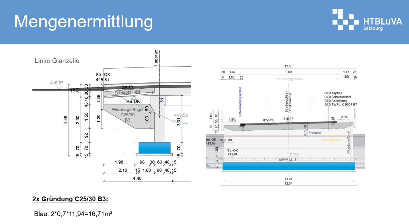 Um die Brücke zu planen, war eine detaillierte Grundlagenermittlung erforderlich. Es wurden der Schichtenverlauf des vorhandenen Untergrunds, die vorhandenen Einbauten in der Brücke und im Untergrund sowie die Hochwasserkoten des 100-jährlichen und 30-jährlichen durch den Gefahrenzonenplan und vorhandene Pläne ermittelt. Das Bachprofil sowie die Bestandspläne wurden durch eigenständige Vermessung erstellt.