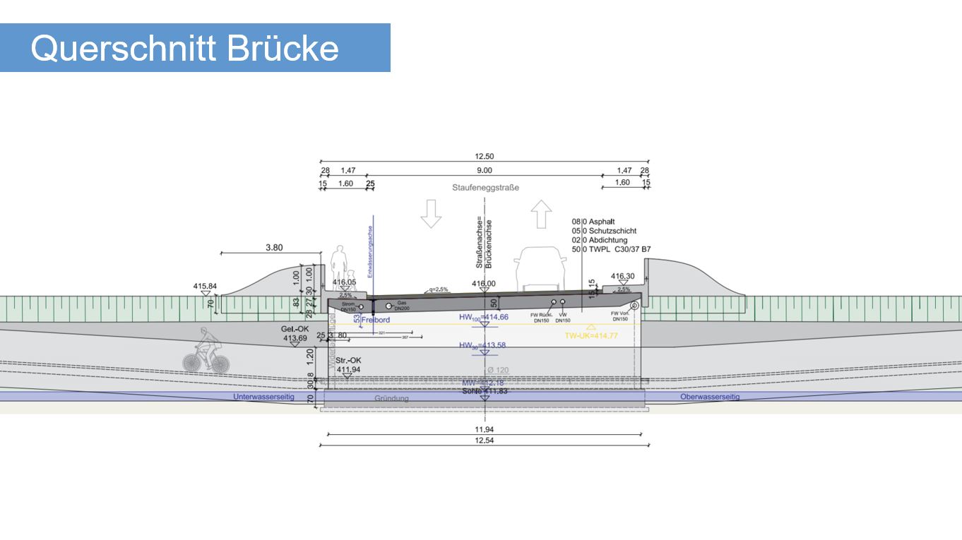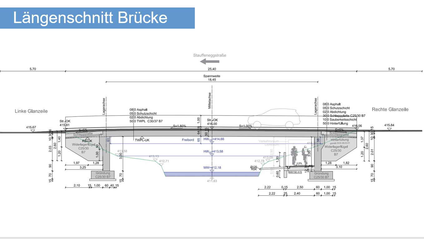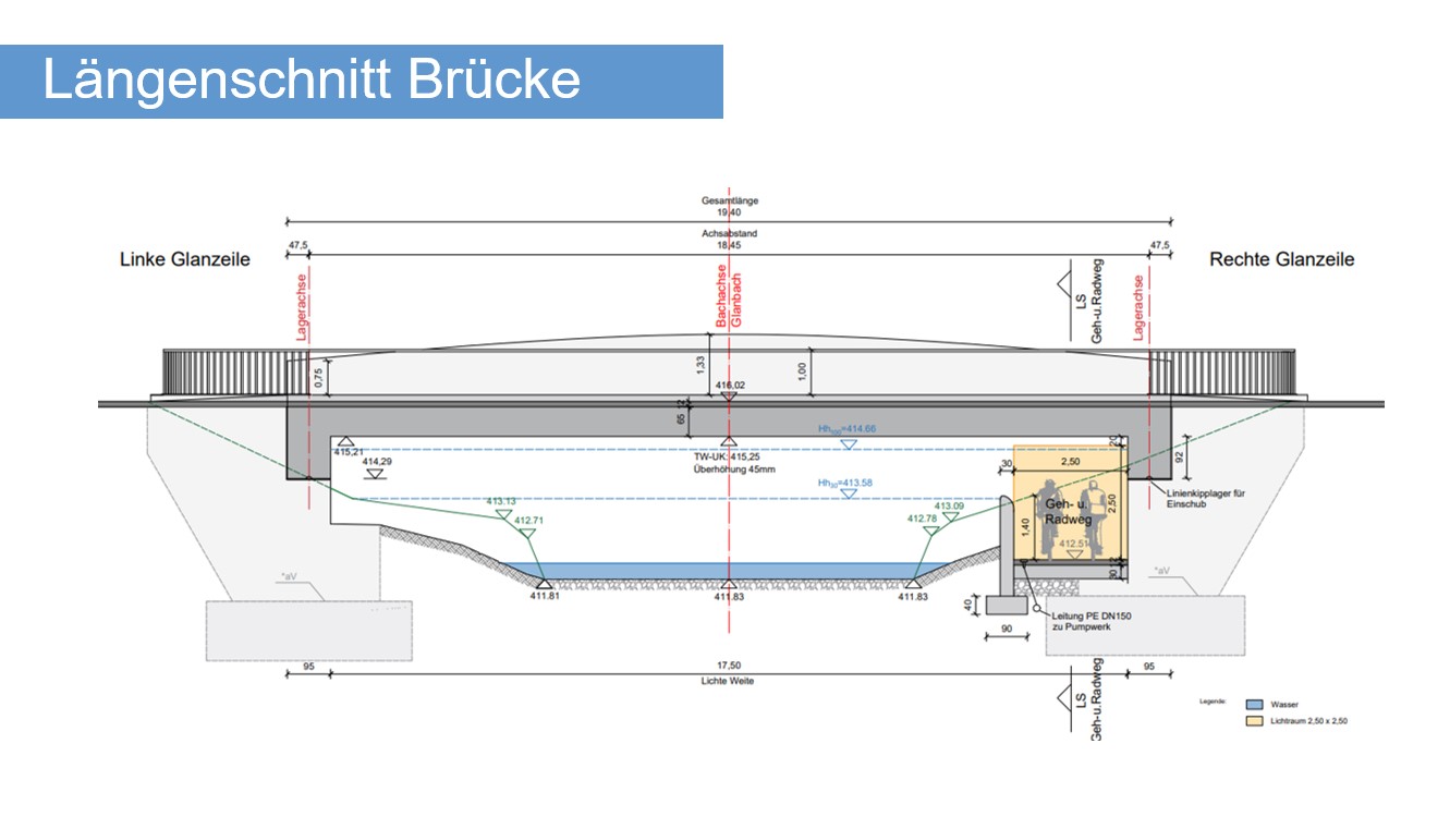In order to plan the bridge, a detailed analysis of the foundations was required. The stratification of the existing subsurface, the existing installations in the bridge and in the subsurface both the 100-year and 30-year floods were determined by the hazard zone plan and existing plans. The creek profile as well as the stock plans were compiled by independent surveying.