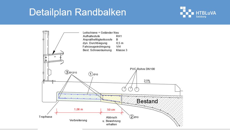 A separate pedestrian and cycle path is to be created to enable pedestrians and cyclists to safely reach the affected junction area and the cycle path along the B1. A pedestrian crossing is to lead across the junction, which will be additionally secured by a traffic island in the centre of the carriageway. From there, the path leads to a bridge over the B1. In consultation with the "Neumarkt" building authority, a variant of the footpath and cycle path layout and bridge widening, in which the speed limit is reduced from 60 to 50 km/h, was selected and examined in more detail. By widening the bridge, the bridge can also be crossed safely.