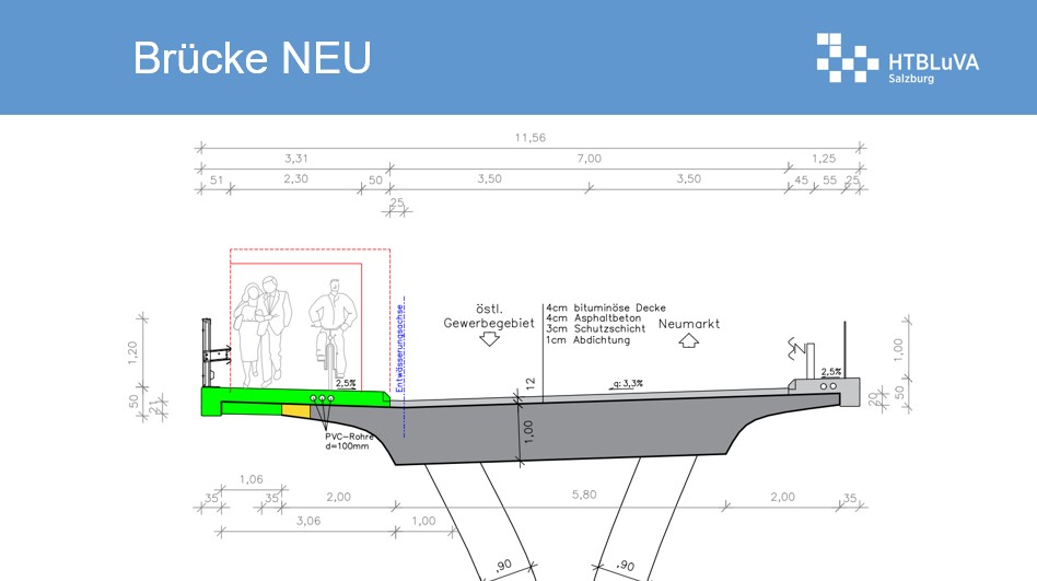 As part of the planned extension of the footpath and cycle path in the "Neumarkt am Wallersee" area, this diploma thesis deals with closing the gap between the town centre of "Neumarkt" and the industrial estate to the east of the B1. The aim of the work is to revitalise pedestrian and cycle traffic in this area.