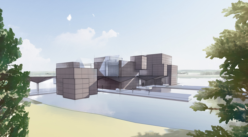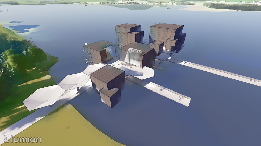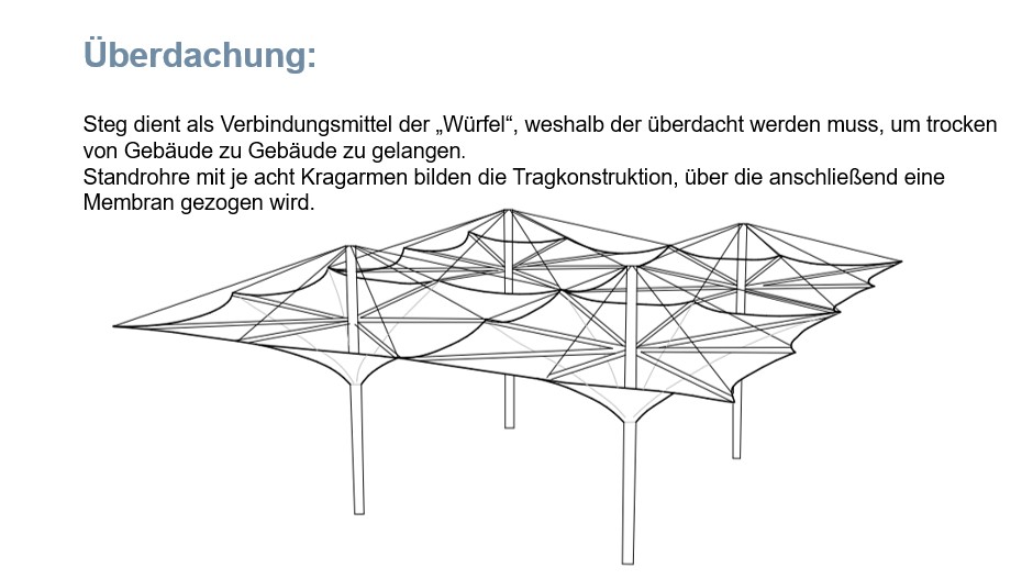 In unserem Entwurf spiegeln sich die vielen Freiheiten wider, die wir in der Gestaltung durch unsere Betreuer hatten, um dem Thema der alpinen Küche gerecht werden zu können. Durch den Einsatz von kristallinen Formen entstand ein sehr extravagantes Bauwerk, das durch seine moderne Gestaltung und seine Lage im Wasser einen hohen Wiedererkennungswert aufweist.