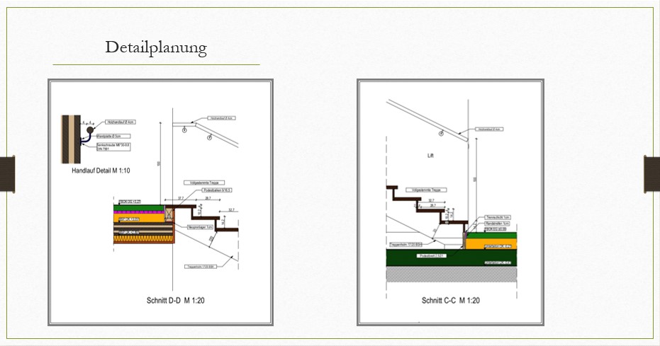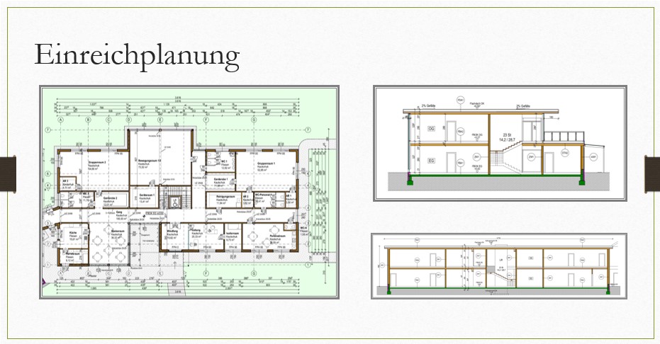 Im Rahmen des planerischen Teils der Diplomarbeit wurden ein Entwurfs-, ein Einreich- und ein Polierplan erstellt. Darüber hinaus wurden verschiedene Details und Fassadenschnitte ausgearbeitet. Bei der gestalterischen Ausarbeitung lag der Fokus auf der Raumgestaltung, die das Raumkonzept und die Außenanlagen umfasst. Der abschließende Teil dieser Diplomarbeit umfasst die statische Ausarbeitung des Kindergartenneubaus. Diese basiert auf der ersten Entwurfsvariante.