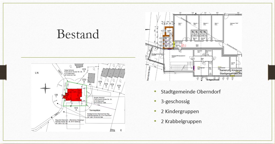 The goal of this project is to meet the growing needs and population growth in the Oberndorf community. The existing kindergarten is located in the municipality of Oberndorf. This town is located in Flachgau with a connection to the Salzburg local railway. The expansion of the existing kindergarten is intended to create additional capacity to ensure early childhood education, support and care for the children.