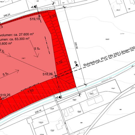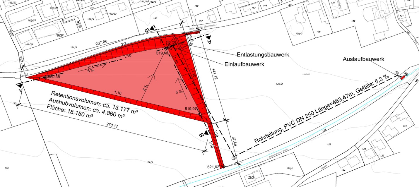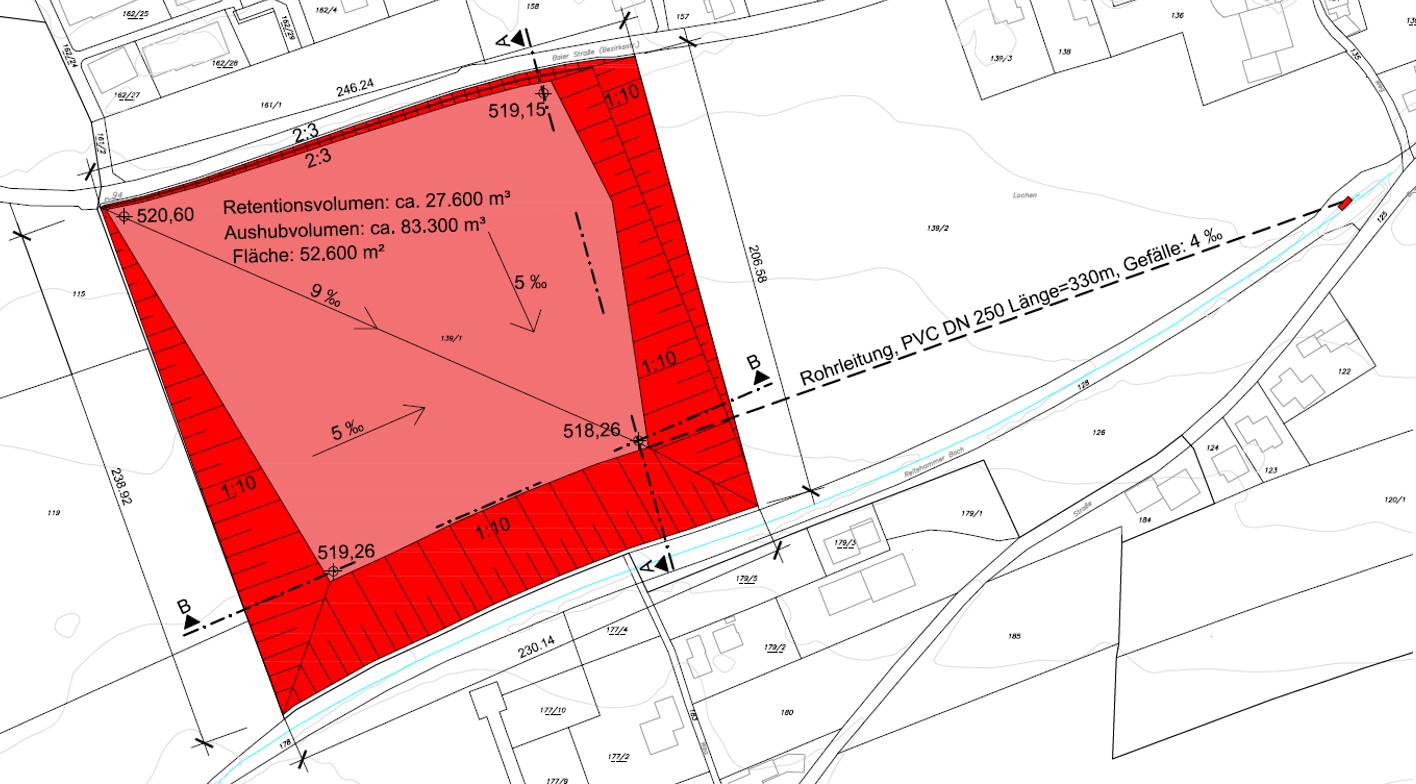 Mit diesen Rechenergebnissen wurden in einer ersten Runde dem Bürgermeister und der Amtsleiterin der Gemeinde Lochen Lösungsvorschläge vorgestellt und die Machbarkeit diskutiert. Auf Basis dieser Ergebnisse erfolgte die Ausarbeitung der Detaillösungen, dargestellt in Lageplänen, Längsschnitten und hydraulischen Berechnungen. Nach der Fertigstellung des Projektes ist eine Präsentation vor der gesamten Gemeindevertretung vorgesehen.