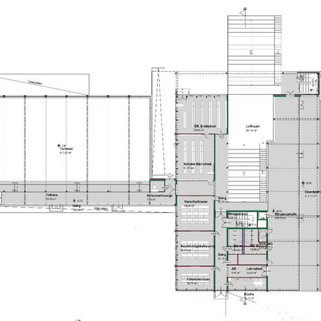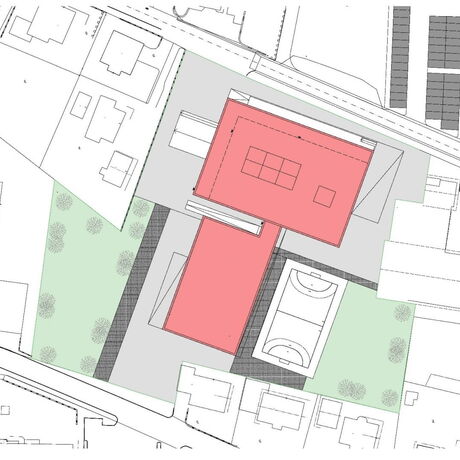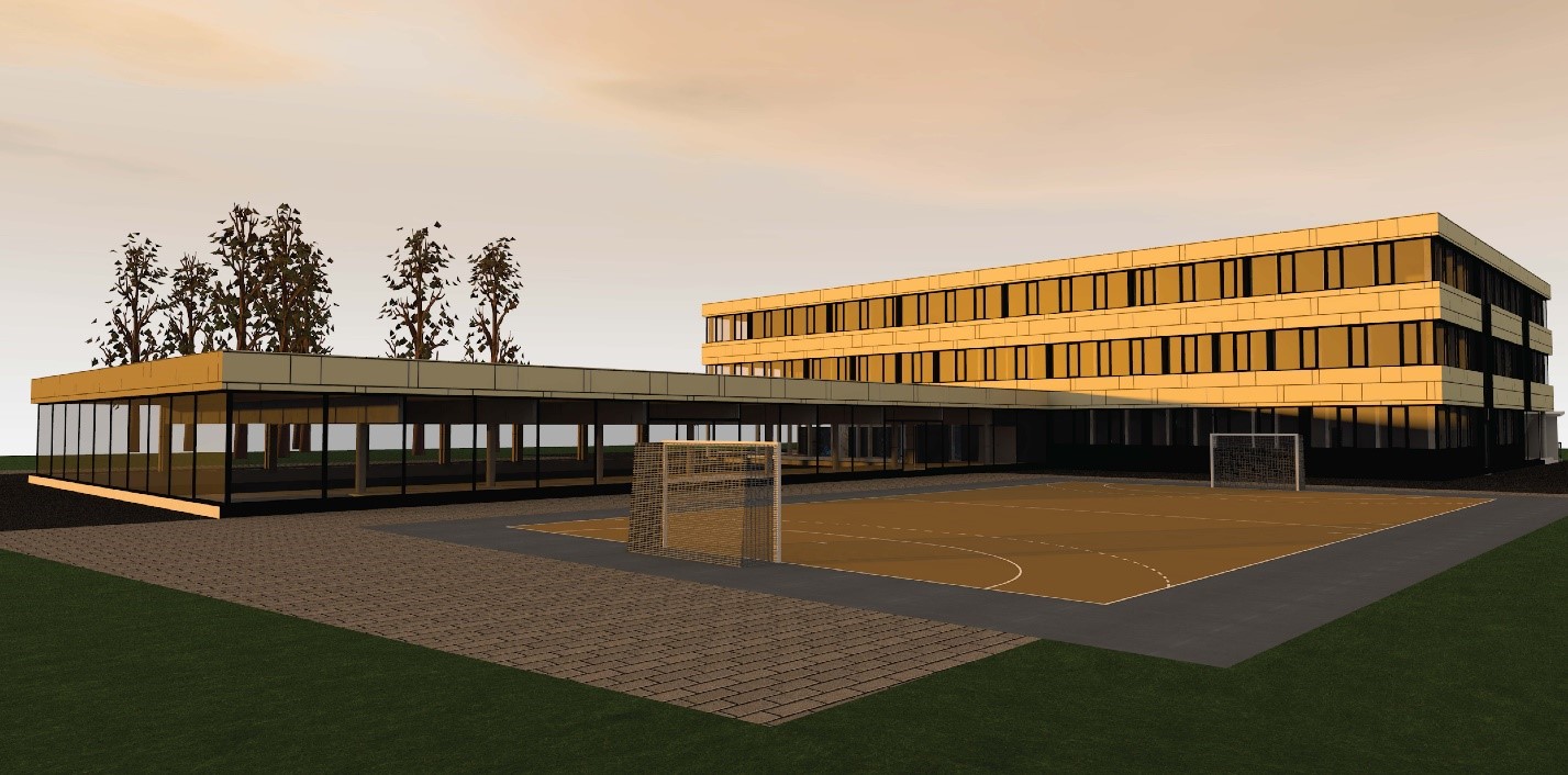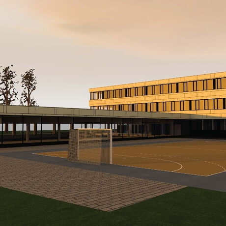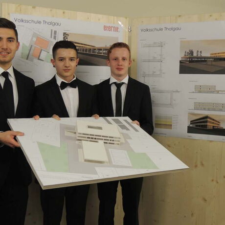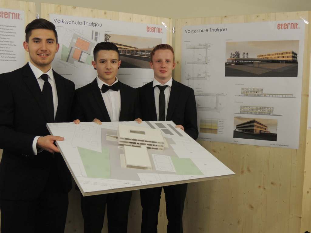 Zur bestehenden Volksschule in Thalgau wurde eine Neuplanung entwickelt. Der Entwurf basiert auf dem Raumprogramm des Architekten-Wettbewerbes von 2010. Hierbei sollten 13 Klassen, 6 Gruppenräume und die dazugehörigen Sonderunterrichtsräume entstehen. In jedem Geschoss befinden sich Sanitäreinrichtungen und Pausenbereiche. Im Keller- und Erdgeschoss ist die zweigeschossige Bühne mit der dazugehörigen Innen- und Außentribüne situiert, die für schulische und externe Veranstaltungen genutzt wird. Weiters wird der Schützenverein im Untergeschoss der Schule untergebracht, das über einen eigenen Zugang erreichbar ist. Zusätzlich wurde eine Dreifachturnhalle geplant, die als eigener Baukörper an die Schule angrenzt und oberirdisch nur eingeschossig wahrgenommen wird, da sie zur Hälfte unterirdisch liegt. Durch das winkelförmige Anschließen des Turnsaales ergibt sich ein geschützter Bereich für Sport- und Pausenflächen. Das Schulgebäude und der anschließende Turnsaal wurden in Massivbauweise mit hinterlüfteter Fassade aus Eternittafeln geplant.