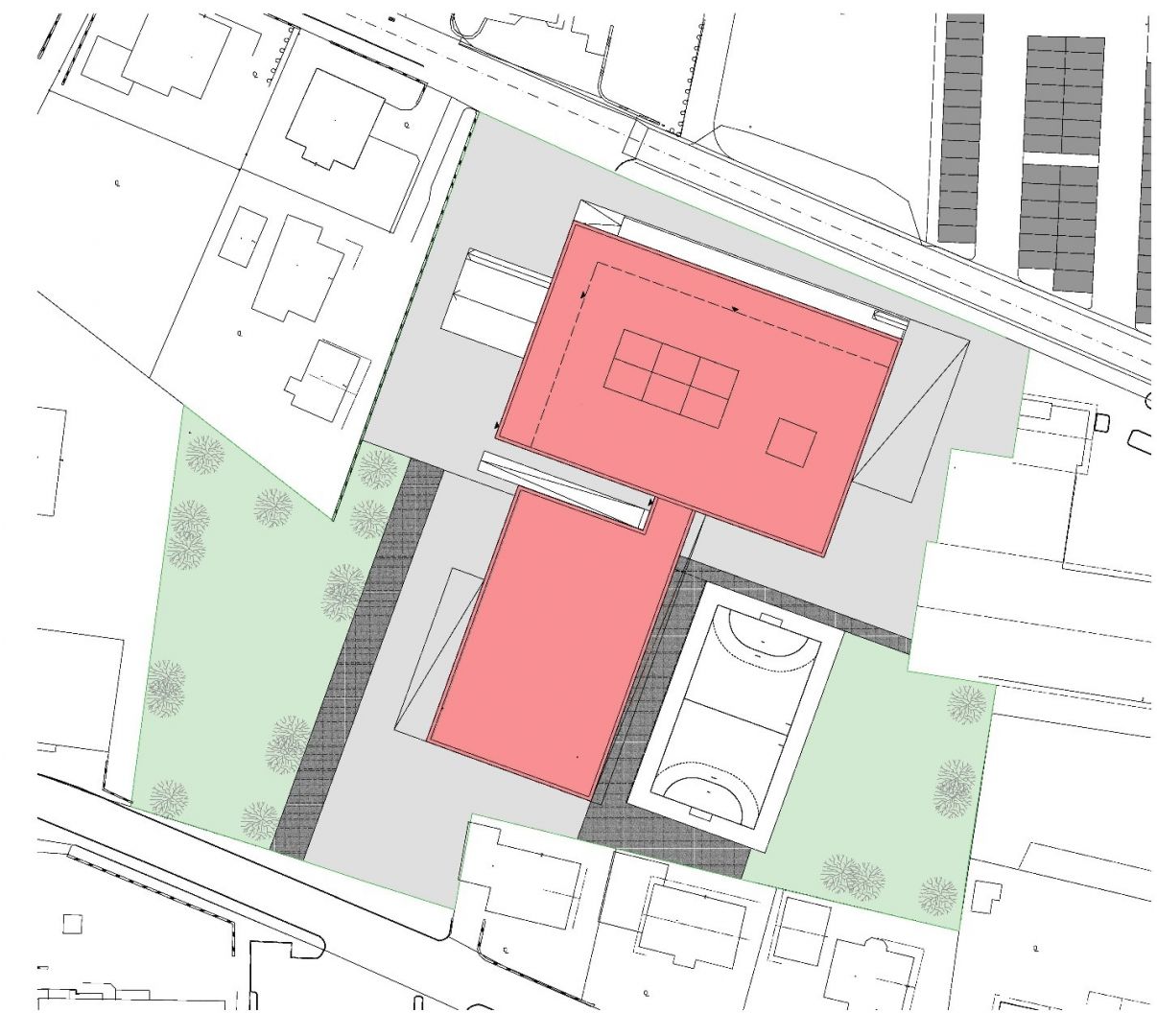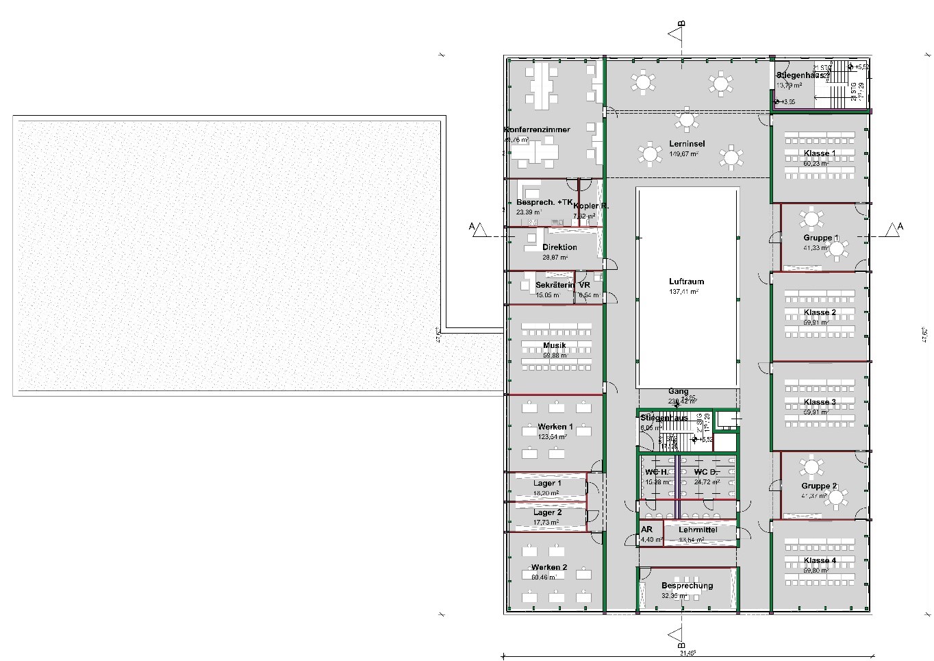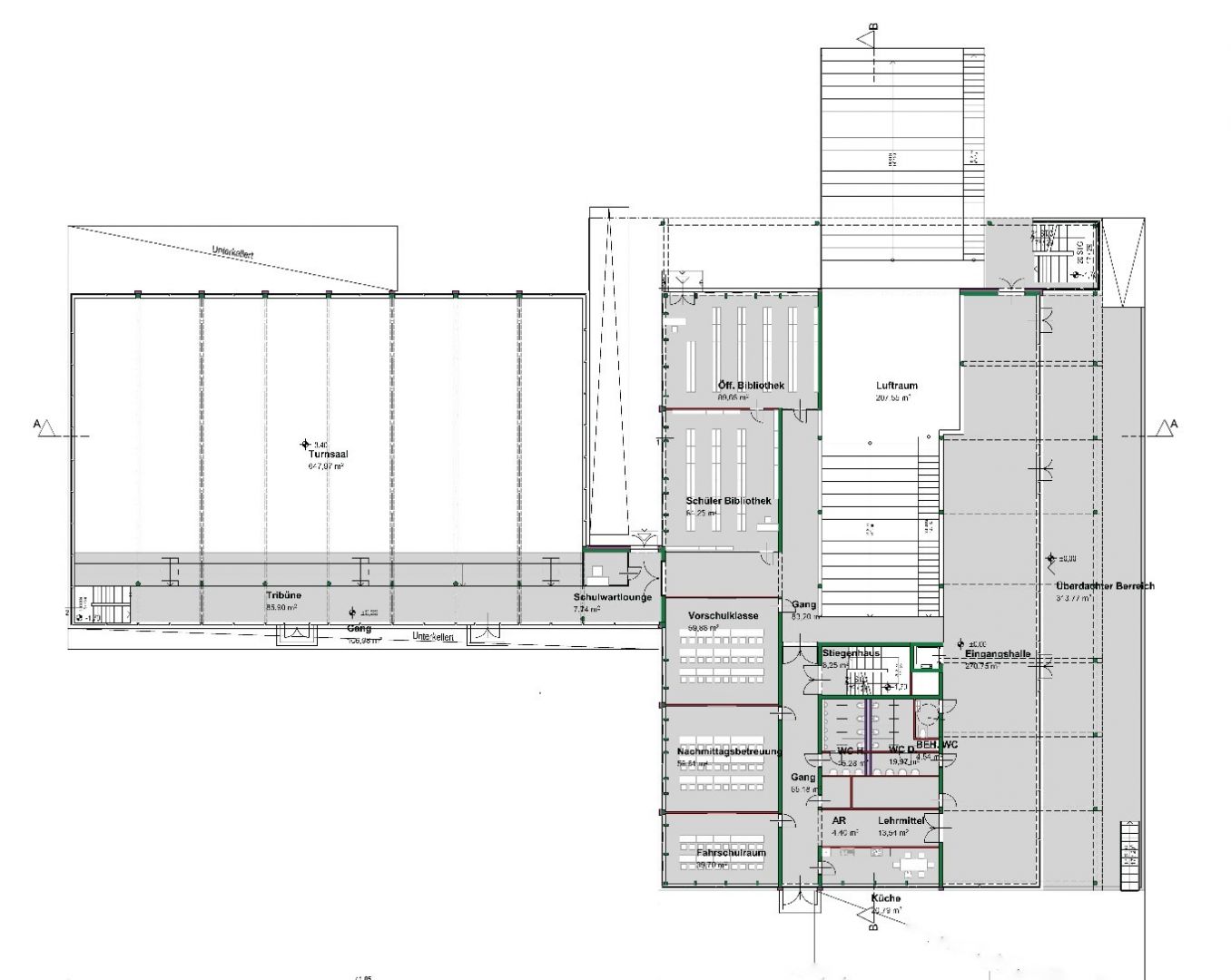 Zur bestehenden Volksschule in Thalgau wurde eine Neuplanung entwickelt. Der Entwurf basiert auf dem Raumprogramm des Architekten-Wettbewerbes von 2010. Hierbei sollten 13 Klassen, 6 Gruppenräume und die dazugehörigen Sonderunterrichtsräume entstehen. In jedem Geschoss befinden sich Sanitäreinrichtungen und Pausenbereiche. Im Keller- und Erdgeschoss ist die zweigeschossige Bühne mit der dazugehörigen Innen- und Außentribüne situiert, die für schulische und externe Veranstaltungen genutzt wird. Weiters wird der Schützenverein im Untergeschoss der Schule untergebracht, das über einen eigenen Zugang erreichbar ist. Zusätzlich wurde eine Dreifachturnhalle geplant, die als eigener Baukörper an die Schule angrenzt und oberirdisch nur eingeschossig wahrgenommen wird, da sie zur Hälfte unterirdisch liegt. Durch das winkelförmige Anschließen des Turnsaales ergibt sich ein geschützter Bereich für Sport- und Pausenflächen. Das Schulgebäude und der anschließende Turnsaal wurden in Massivbauweise mit hinterlüfteter Fassade aus Eternittafeln geplant.