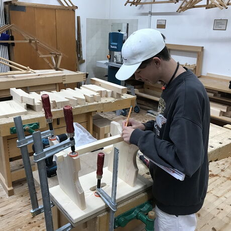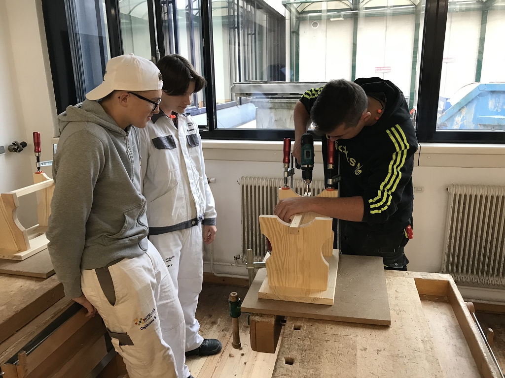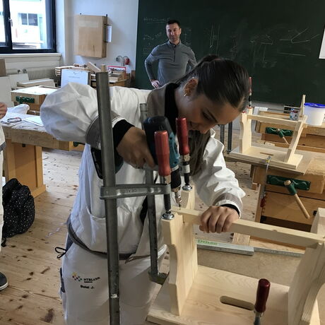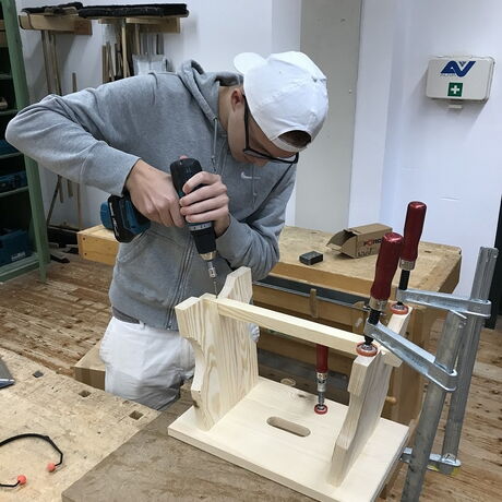 Im Zuge der Ausbildung erstellen die Schülerinnen und Schüler Werkstücke, wobei es auch um das richtige Verleimen, um Holzverbindungen und um den Baustoff Holz geht.