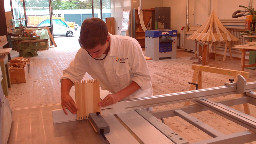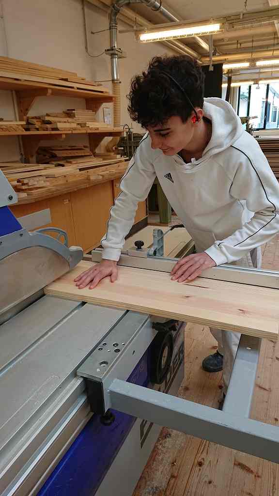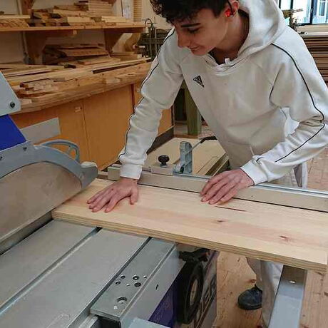 Im zweiten Jahrgang wird im Unterricht in der Zimmereiwerkstätte besonderen Wert auf die Sicherheit bei der Arbeit mit Holzbearbeitungsmaschinen gelegt.