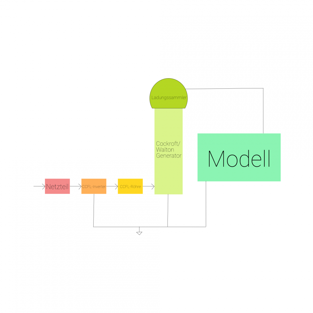 Am Anfang unseres Modells stehen 12V Gleichspannung, die durch einen CCFL-Inverter in eine 1800-2300V Wechselspannung umgewandelt werden und dann durch einen Cockroft/Walton-Generator in eine 24.000 Volt Gleichspannung transformiert werden. Um das elektrische Feld zu erzeugen, wird über einen 100 Mega-Ohm Widerstand eine Blechschüssel mit den 24.000 Volt aufgeladen und somit zu einem Ladungsspeicher.