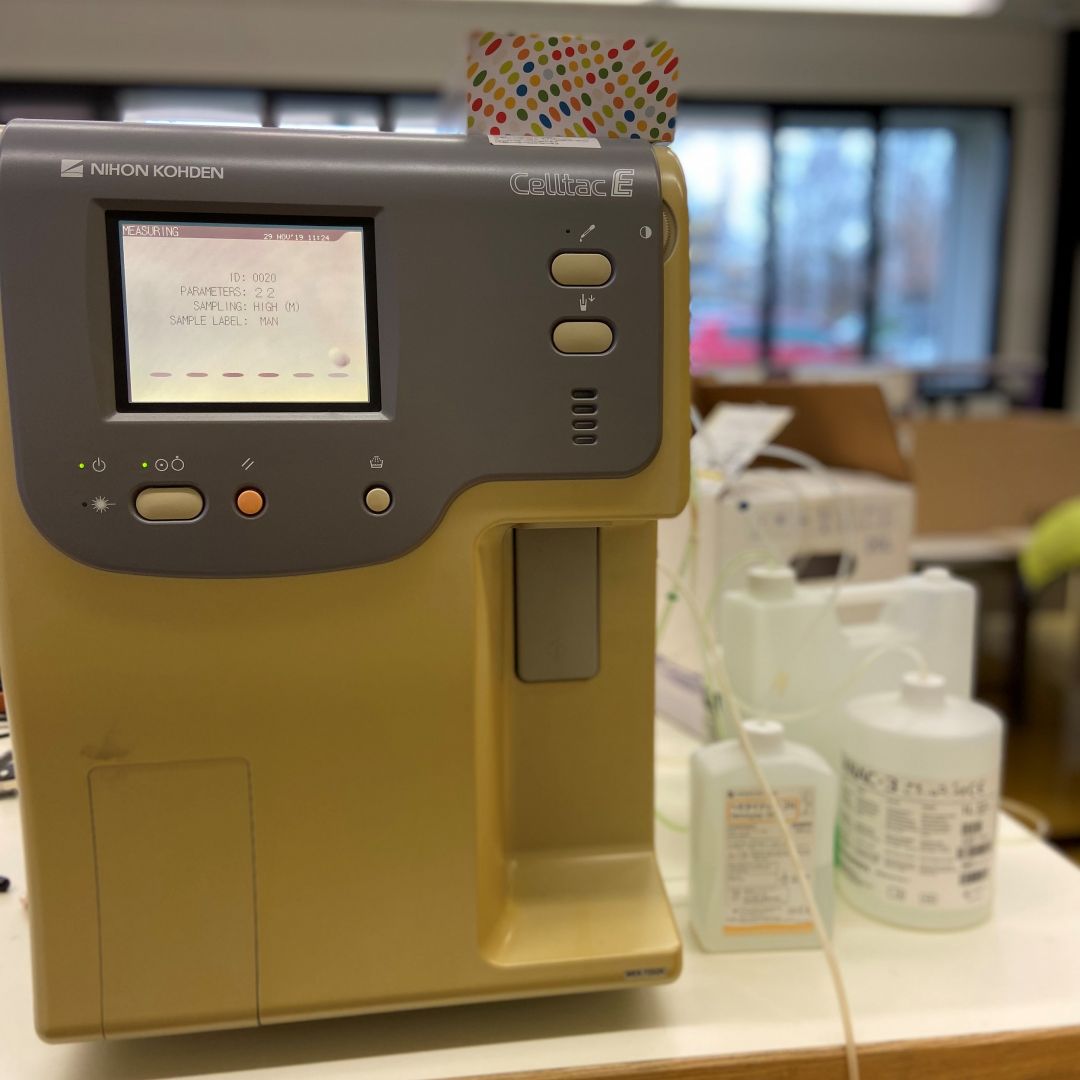 Ein Blutanalysegerät misst relevante Blutwerte, unter anderem die Anzahl von weißen und roten Blutkörperchen sowie die Anzahl von Hämoglobin und Blutplättchen.