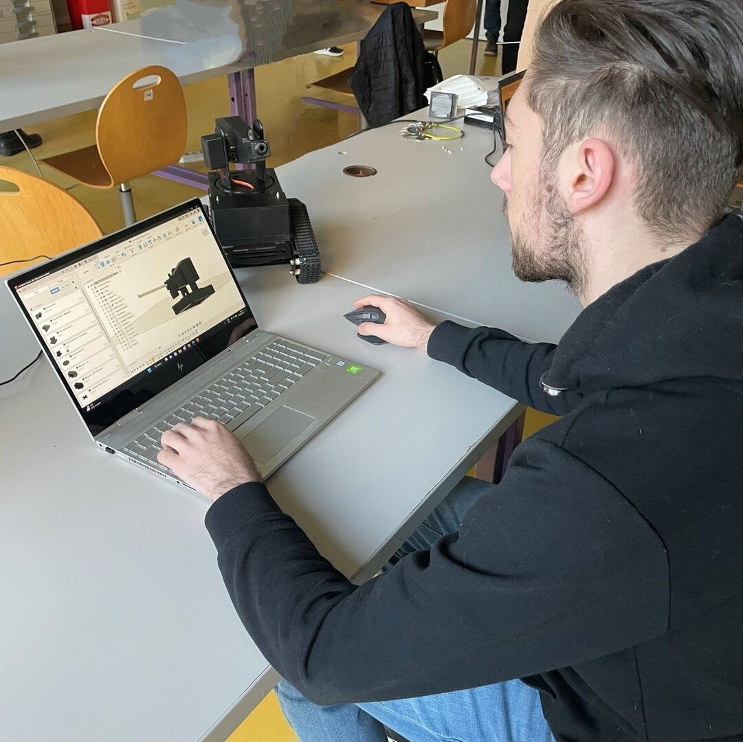 Auf Basis des Chassis eines Modell-Kettenfahrzeuges, dessen Energieversorgung über einen Akku erfolgt, wird eine eigens für dieses Projekt entworfene und in der Schule 3D-gedruckte Befestigung und Halterung der Schussmechanik aufgebaut. Die Ansteuerung der benötigten Motoren erfolgt durch einen Raspberry-Pi 4 und der „Power Control Unit“. Es werden Aufnahmen der Fahrzeugkamera an einen Webserver gestreamt, über welchen auch die Steuerung es Fahrzeuges erfolgt.