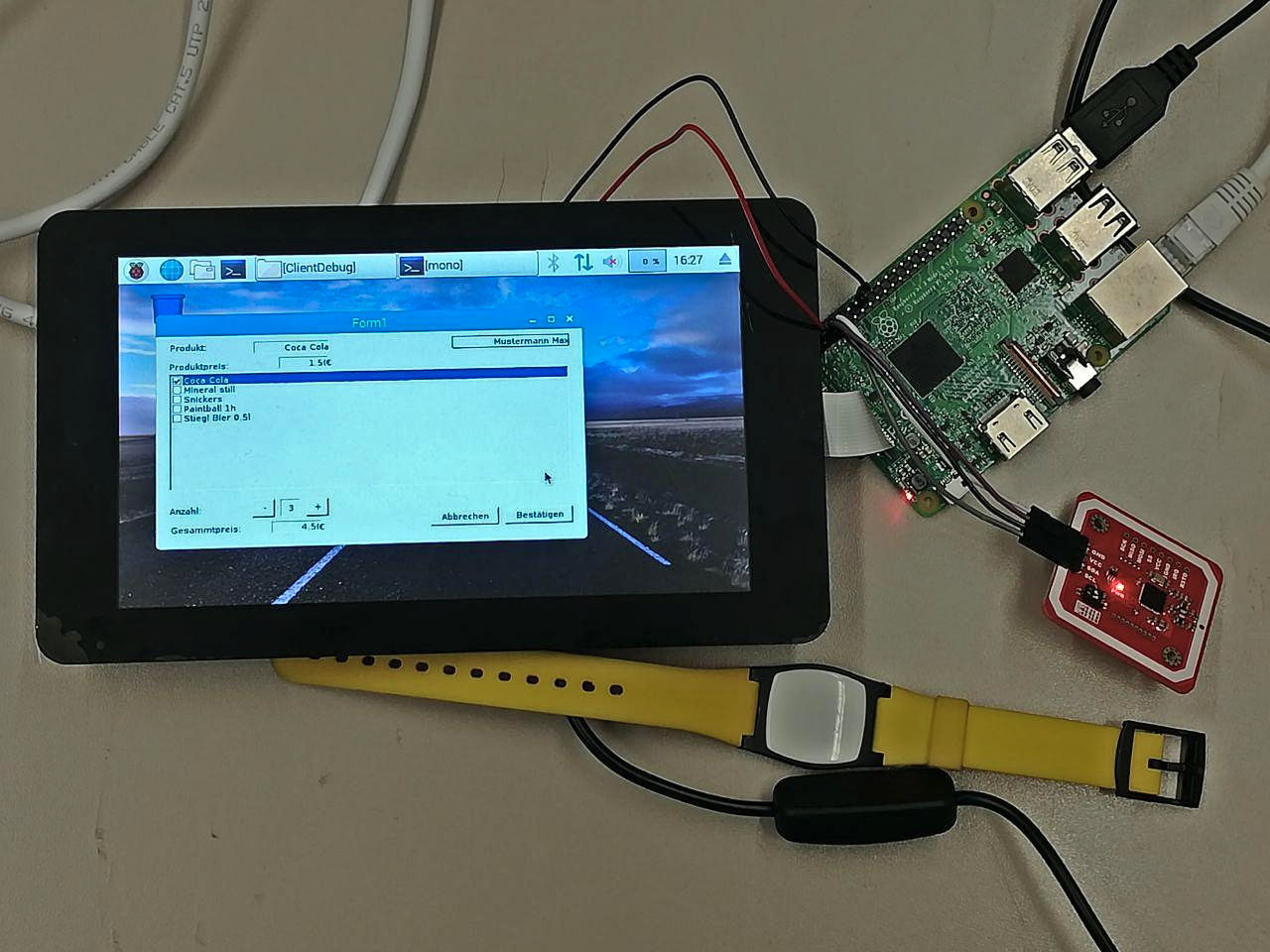 Als Grundbaustein dient ein Raspberry-Pi, an welchen ein NFC-Scanner(PN532) und ein Display angesteckt werden. Die Ansteuerung der Automaten erfolgt über eine sekundäre Platine, die mit den GPIO-Pins des Raspberry Pis angesteuert wird. Der NFC-Scanner wird mit dem SPI-Bus angesteuert und die erhaltenen Daten werden an die GUI weitergeschickt. Die Gui wird mit C# programmiert und mit dem Mono .NET-Framework auf dem Raspberry-Pi ausgeführt. Um den Server anzusteuern, werden von der GUI die erforderten Daten erfragt. Diese Daten werden an das spezielle Dateiformat angepasst und mittels Wifi auf den Server geschickt.