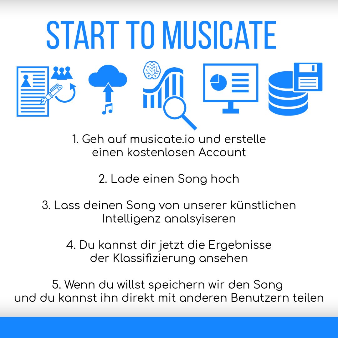 musicate ist die Lösung dieses Problems. Es handelt sich um eine Website, auf der Musikproduzenten ihre fertiggestellten Tracks mit nur ein paar Klicks nach verschiedenen Genres klassifizieren lassen können. Durch die intuitive Benutzeroberfläche ist es dem User möglich, sein eigenes Profil anzulegen und damit automatisch der musicate-Community beizutreten. Anschließend kann er/sie eine mp3-Datei in die musicate-Cloud hochladen und den Analyse-/ Klassifizierungsprozess mittels KI-unterstütztem Modul starten. Die ermittelten Daten und das Genre werden grafisch dargestellt und ebenfalls in der Cloud gespeichert. Dies stellt sicher, dass der Benutzer zu jedem späteren Zeitpunkt über sein musicate-Profil, auf seine bereits hochgeladenen Tracks und die dazugehörigen Informationen zugreifen kann.