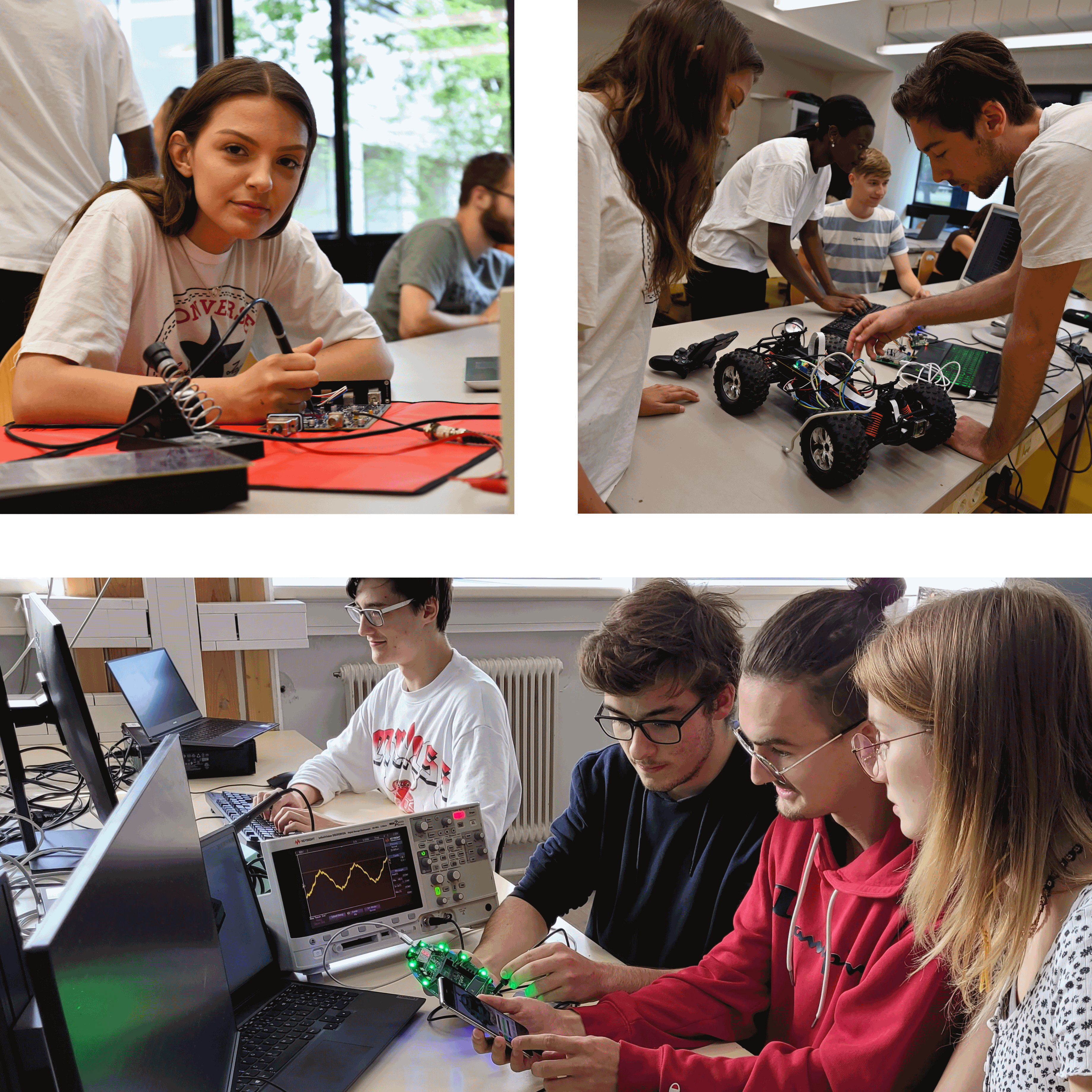 In den Werkstätten erlernen die Schülerinnen und Schüler alle notwendigen Tätigkeiten und handwerklichen sowie feinmotorischen Fertigkeiten, die bei der Herstellung, Inbetriebnahme und Wartung von elektronischen Geräten und IT-Komponenten von Bedeutung sind. Ausgehend von einer Idee wird zunächst ein Prototyp gefertigt, programmiert und in Betrieb genommen. Dem folgen weitere Schritte von der mechanischen Konstruktion über die Gehäusefertigung bis hin zur vollständigen Dokumentation und Serienreife.