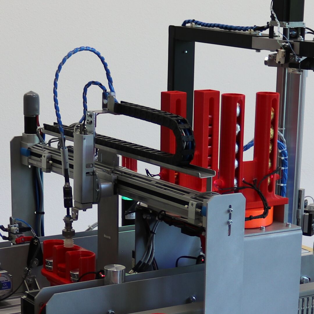 Die eingebaute SPS steuert hierbei die Station, welche individuell auswählbare Komponenten zusammensetzt und nach der Verwendung wieder einsortiert. Die zwei anpassbaren Komponenten, bestehend aus Deckel und Container, sind farblich anpassbar. Außerdem hat der Benutzer die Möglichkeit, aus einer Varietät von Süßigkeiten auszuwählen, welche anschließend beim Fertigungsvorgang im Container verstaut wird.