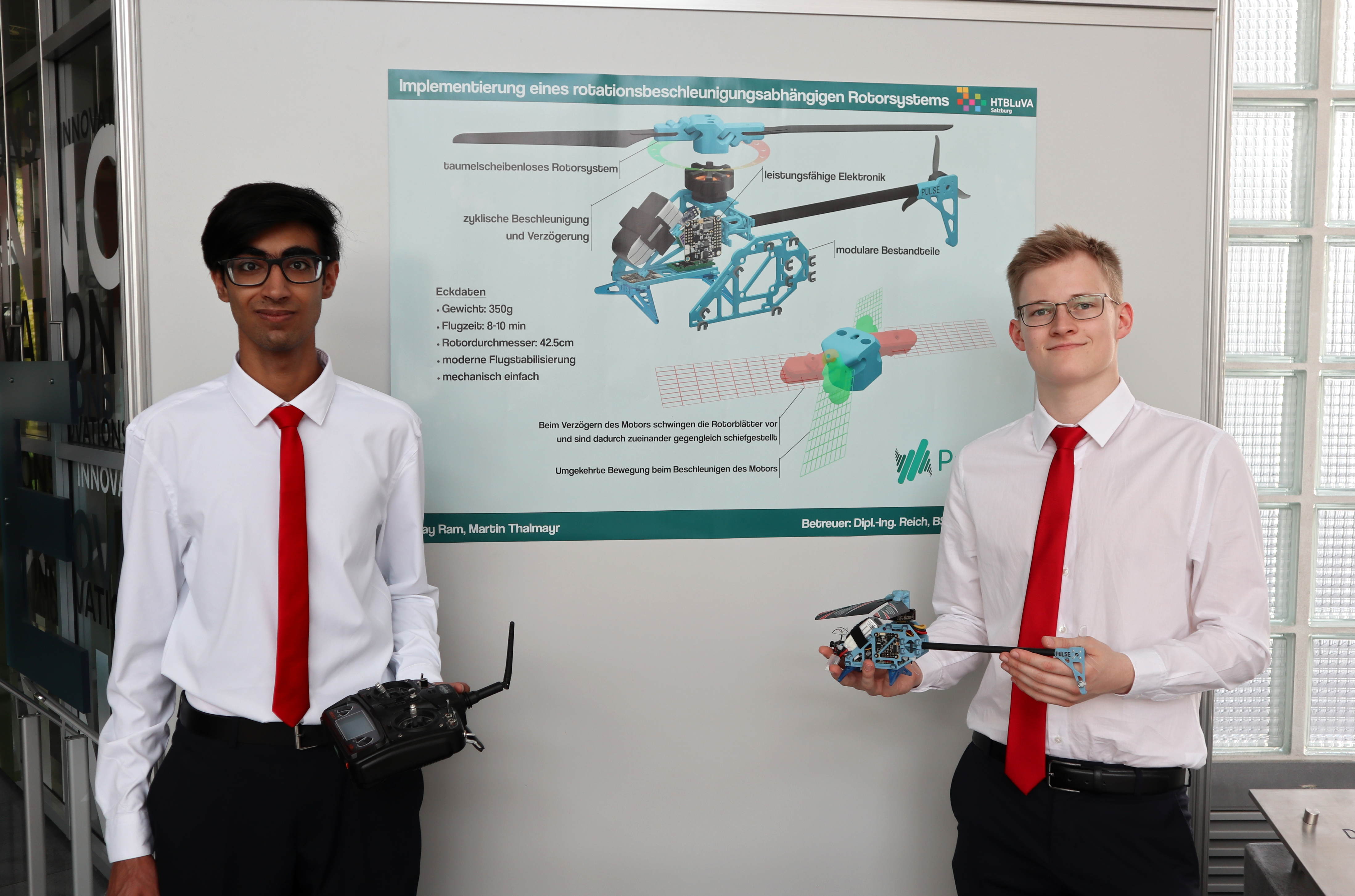 In der Diplomarbeit wurde ein funktionsfähiges Helikoptermodell entwickelt, welches ein taumelscheibenloses Rotorsystem verwendet. Dieses ist mechanisch einfacher aufgebaut als konventionelle Rotorsysteme, ist aber dafür elektronisch und softwaretechnisch komplexer. Die Flugsteuerung erfolgt durch zyklische Beschleunigung und Verzögerung der Rotation, wodurch die Rotorblätter vor und zurück schwingen und dadurch zueinander gegengleich schiefgestellt werden.