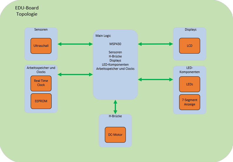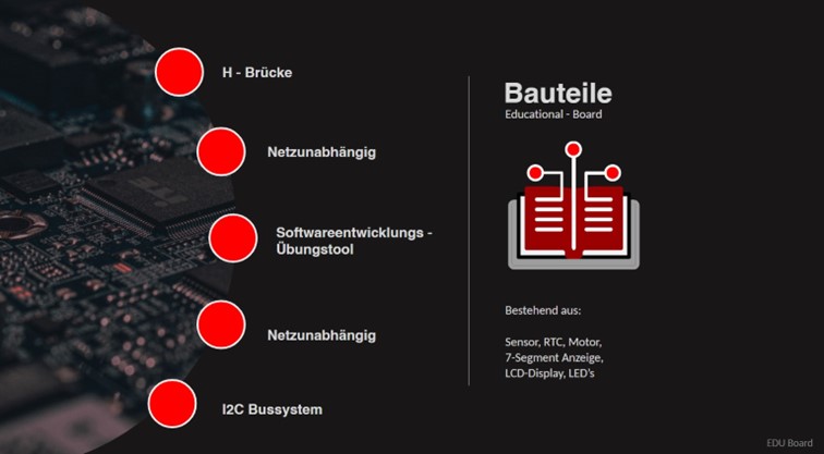 Zweck unseres Education-Boards ist es, ein Übungsinstrument für zukünftige Laborübungen bereitzustellen. Schülerinnen und Schüler sollen damit das Programmieren verschiedener Komponenten anhand eines MC's erlernen.