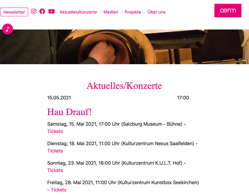 Das Ziel des Projektes war es, dass oenm (österreichische Ensemble für Neue Musik) auch für eine junge Zielgruppe attraktiv zu machen, somit das Konzertpublikum zu erweitern und dabei einen roten Faden durch das gesamte Auftreten des Ensembles zu ziehen. Dies sollte einerseits mit der Gestaltung eines Printprodukts, das Magazin einer Veranstaltungsreihe welches im Frühling stattfinden sollte, und dem Redesign der Website erreicht werden. Zudem war die Erstellung eines Styleguides von Bedeutung, um auch zukünftig für eine klare Linie zu sorgen.