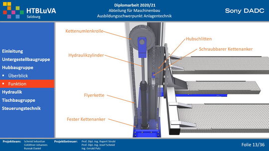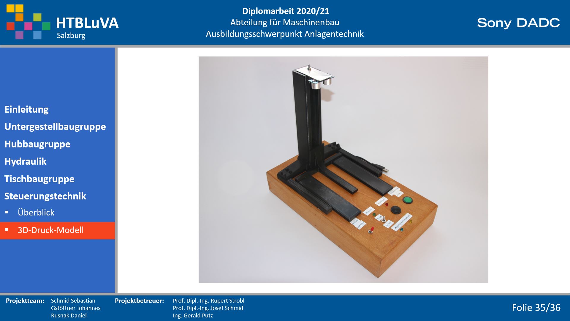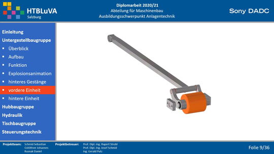 Nach einer gemeinsamen Grundkonzeptfindung wurde das Projekt in drei Teile unterteilt und dafür verschiedene Konzepte ausgewählt. Anschließend wurden die gewählten Konzepte konstruiert und berechnet. Weiters wurde die dazugehörige Steuerung programmiert, welche mittels eines 3D-Druck Modells getestet wurde.