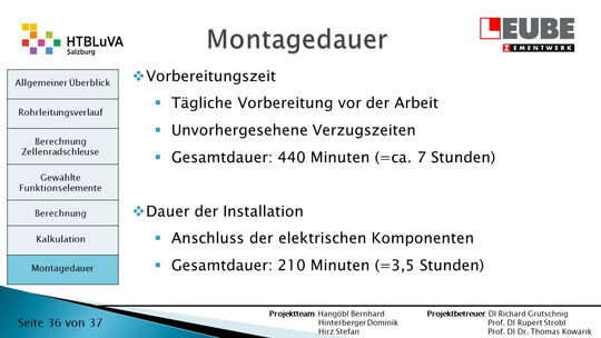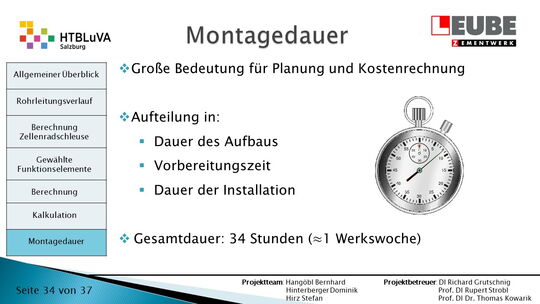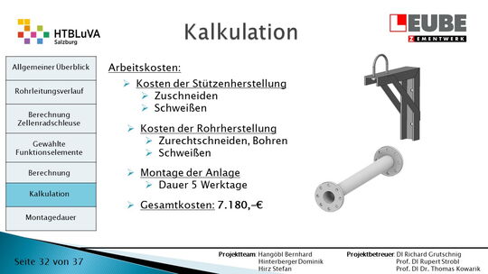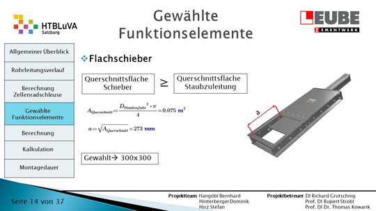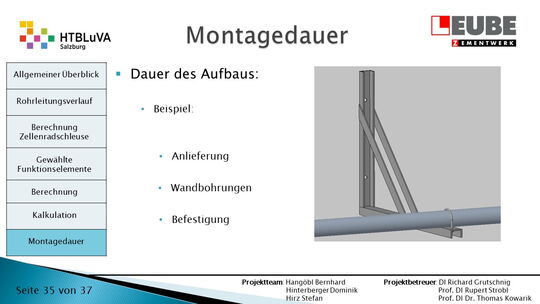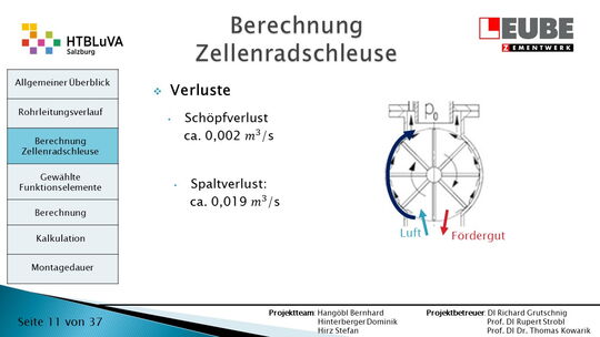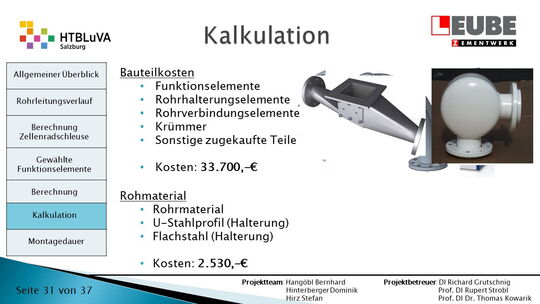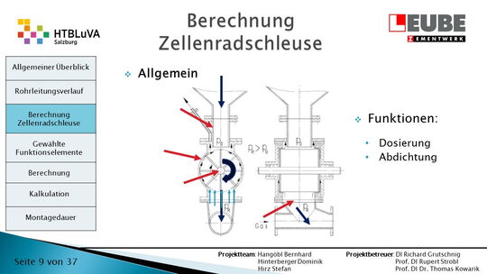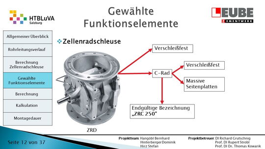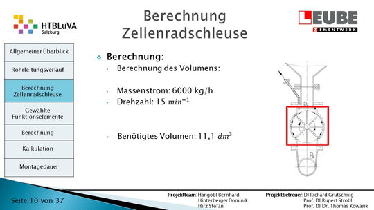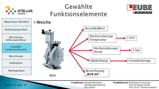 Ausgehend von den Anforderungen wurden als erstes einige Skizzen des Rohrleitungsverlaufes entworfen, um daraus ein CAD-Model erstellen zu können. Währenddessen wurde mit der Auslegung der Zellenradschleuse und des Rohrleitungsdurchmessers begonnen. Durch die erhaltenen Anforderungen konnten die Funktionselemente ausgewählt werden. Anschließend wurde die Montagedauer ermittelt und eine Kostenrechnung erstellt.