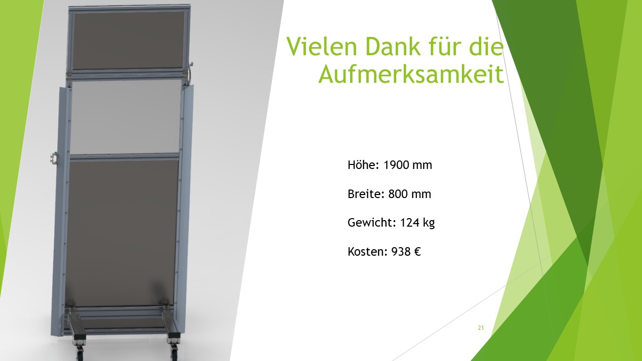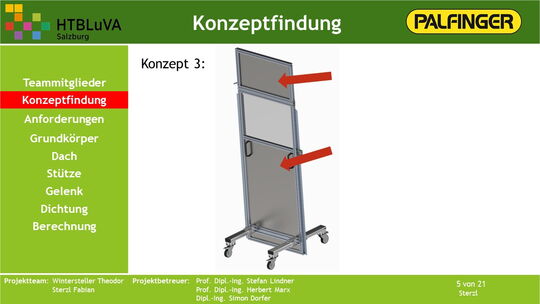 Den Anforderungen entsprechend wurden verschiedene Konzepte erstellt, von denen ein passendes Konzept ausgewählt wurde. Dieses wurde verfeinert und anschließend die Konstruktion und Berechnung der mobilen Sicherheitstrennwand begonnen.