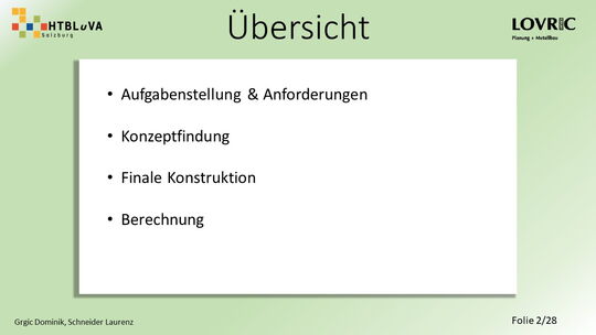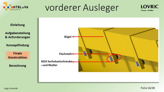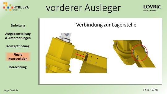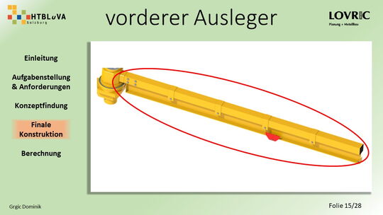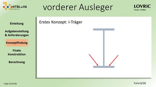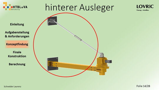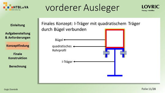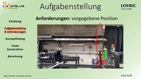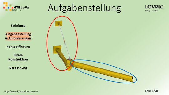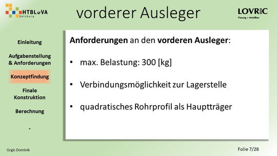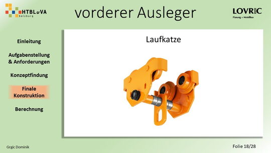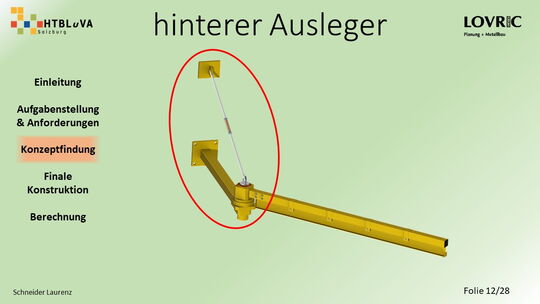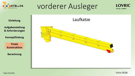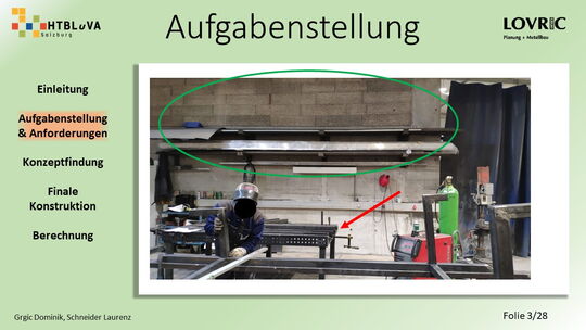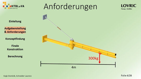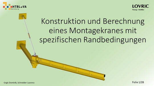 In der Produktion der Firma Lovric GmbH werden täglich Stahlträger unterschiedlichster Dimensionen geschweißt. Um diese Arbeit möglichst ergonomisch zu gestalten, soll ein Montagekran entwickelt werden, der den Transport der zu schweißenden Stahlträger, mit einem Gewicht von bis zu 300 [kg], innerhalb der Arbeitshalle erleichtern soll.
