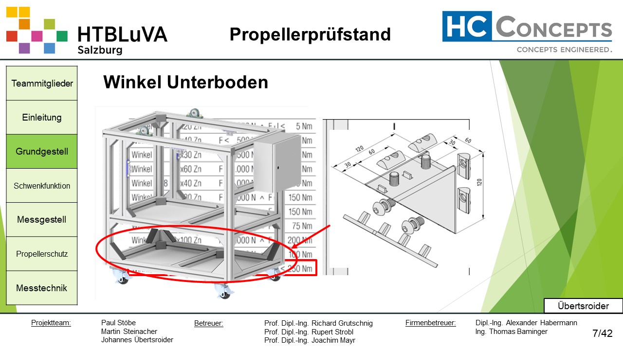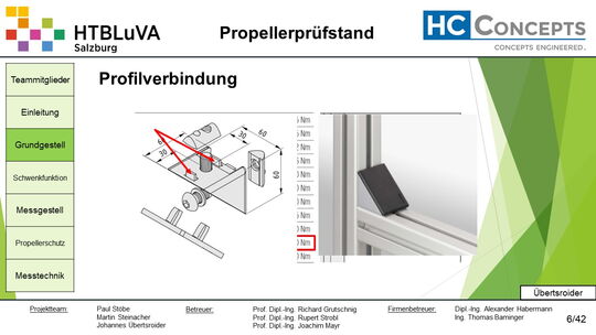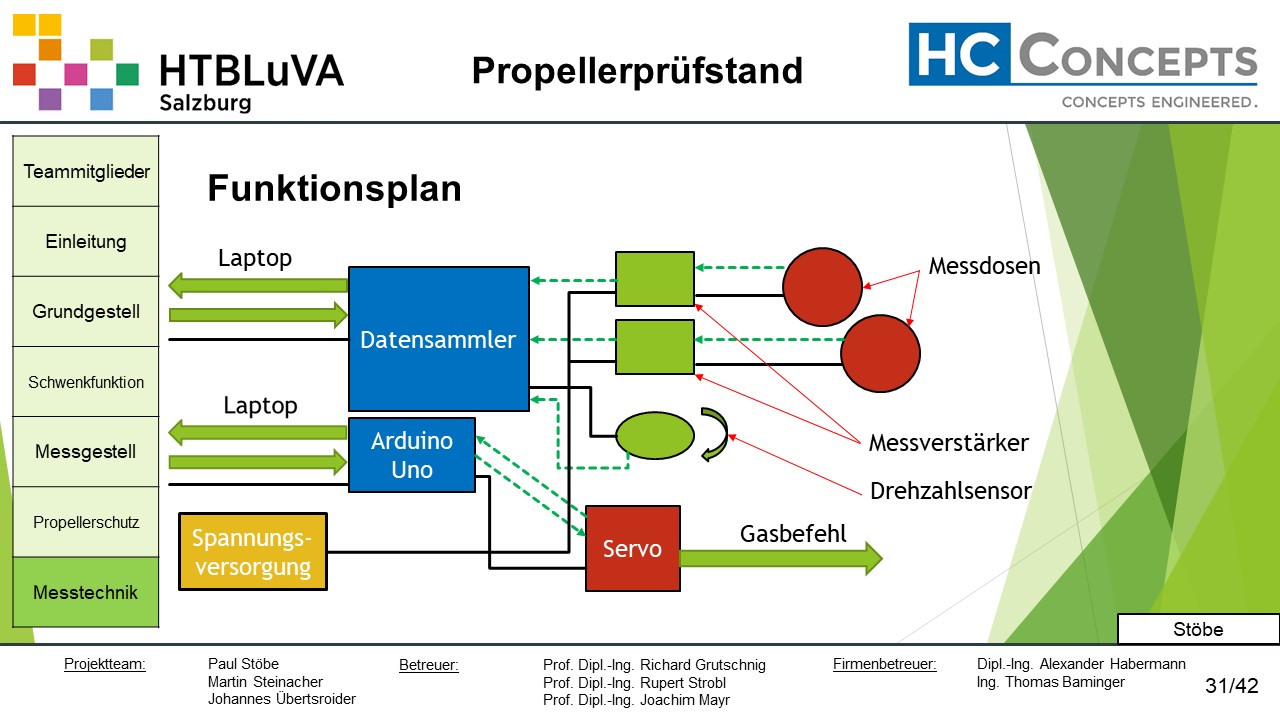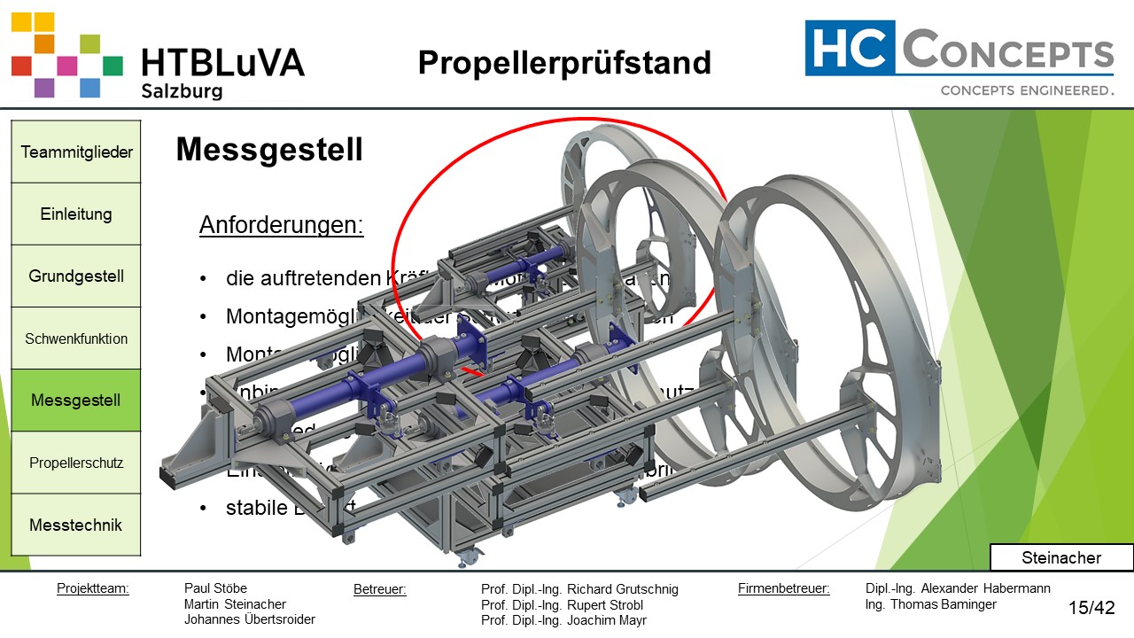 Die Firma HC-Concepts entwickelt unter anderem einen Verbrennungsmotor für Drohnen und für größere Modellflugzeuge. Hierfür wird ein Prüfstand benötigt, auf dem der Motor mit dem zugehörigen Propeller montiert und getestet werden kann. Der Prüfstand soll in der Lage sein, alle wichtigen Motordaten zu loggen und dabei die Schubkraft und das auftretende Kippmoment zu messen.
