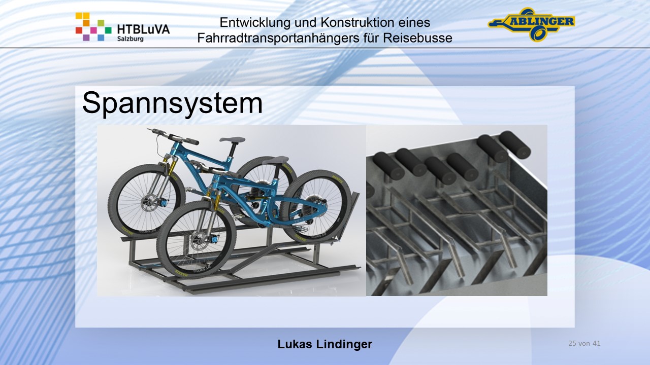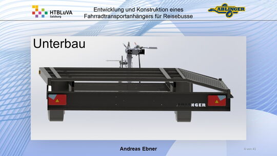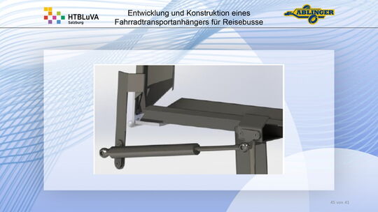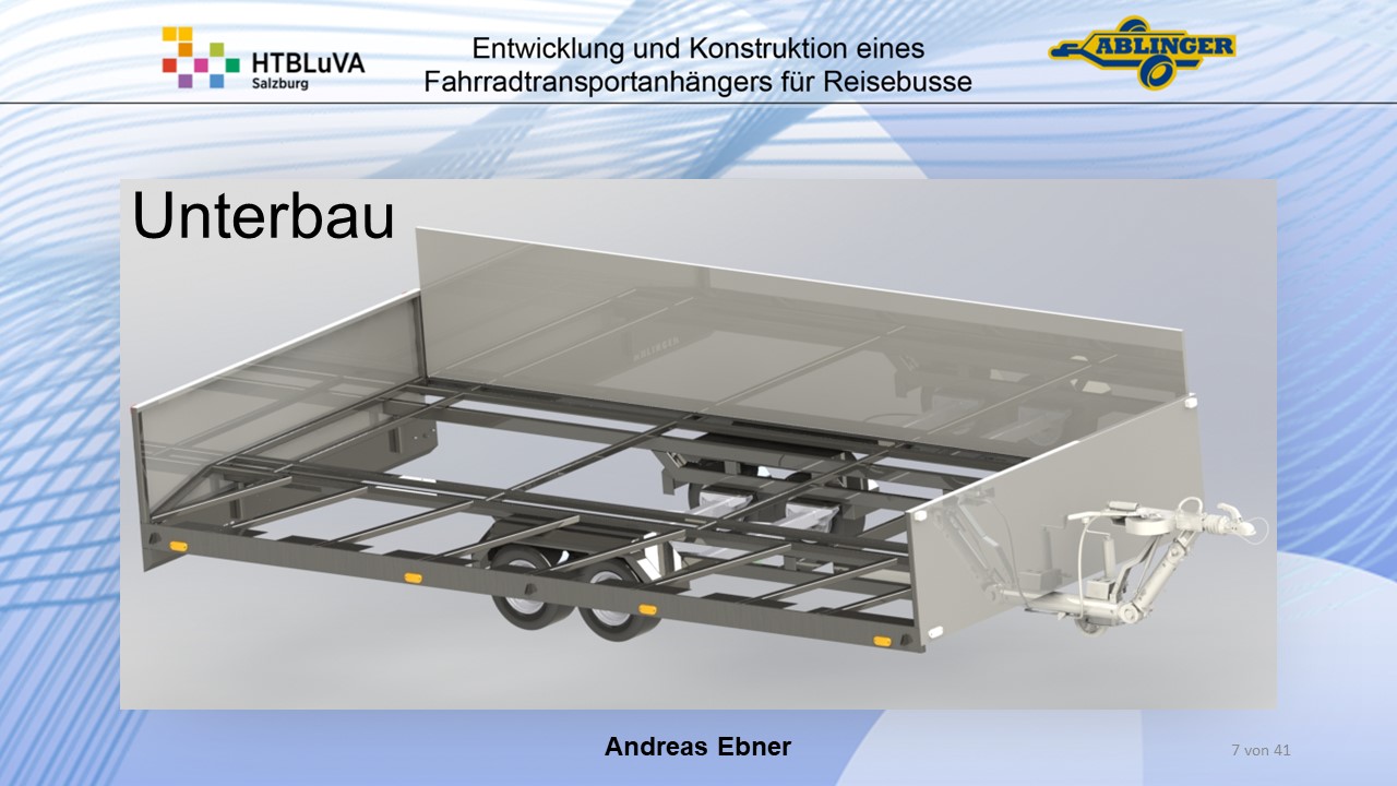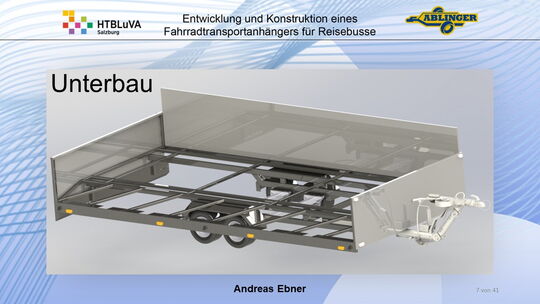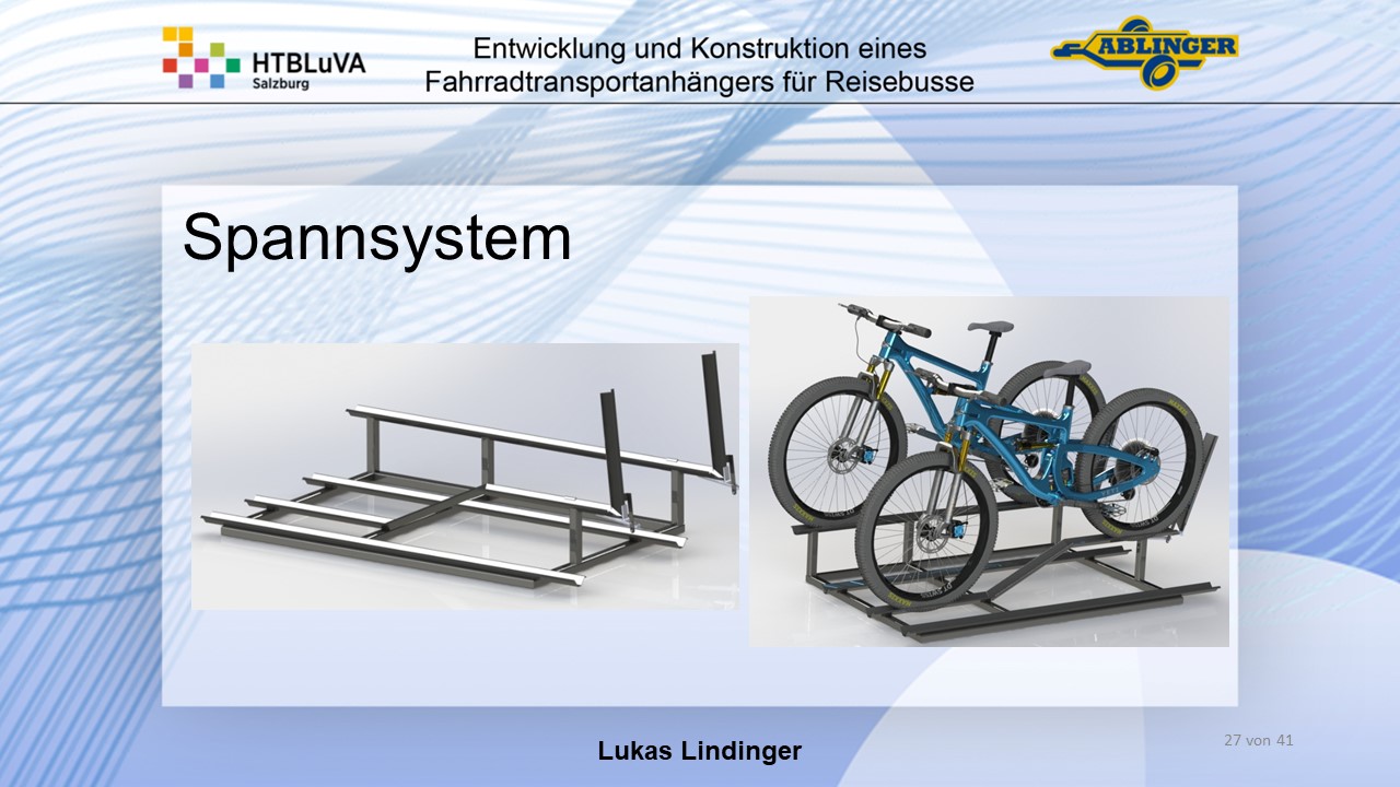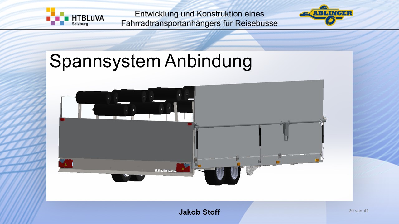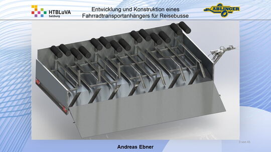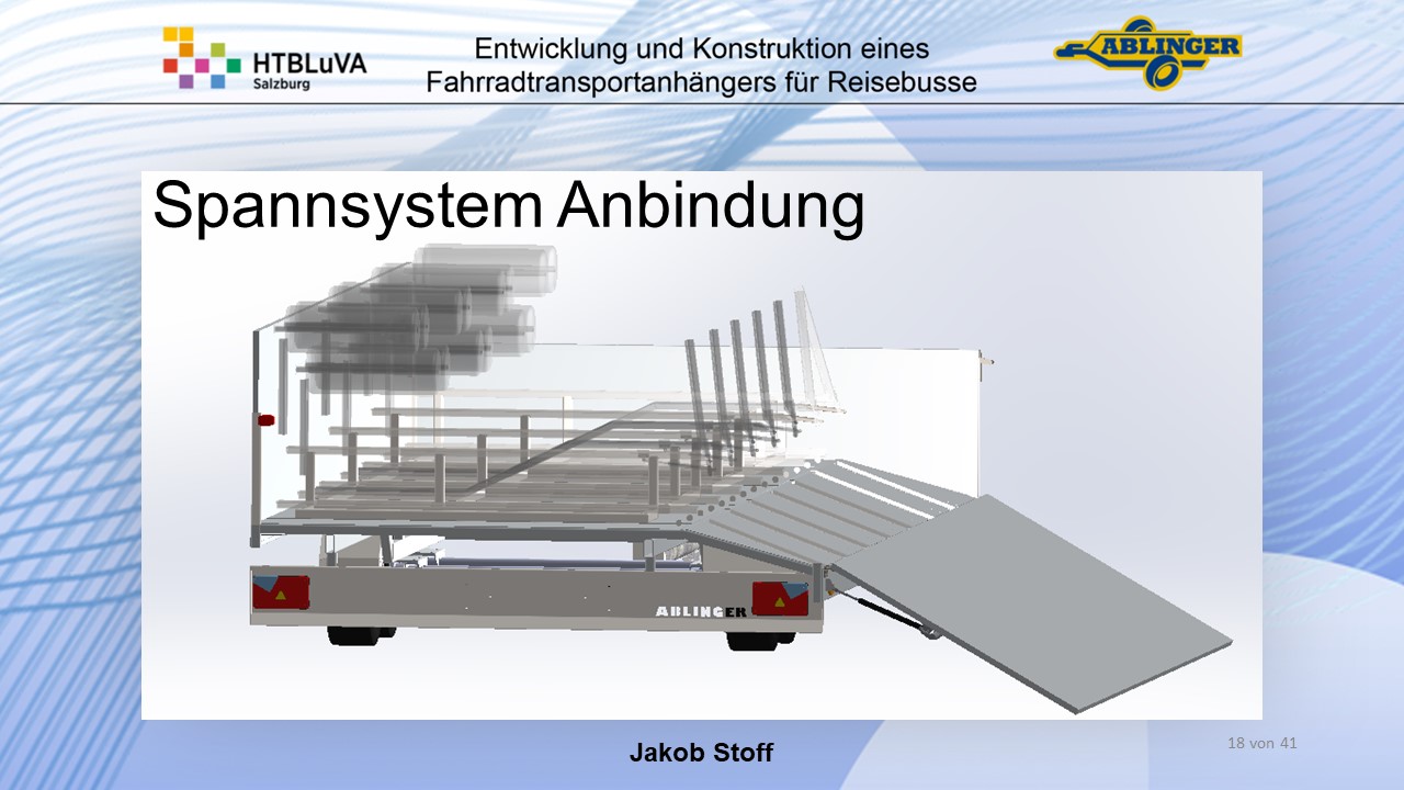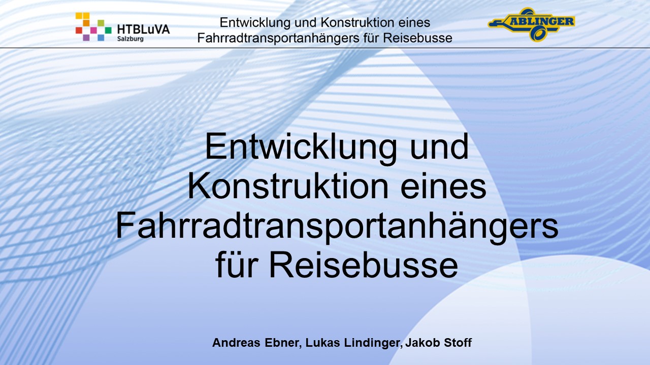 Für die Firma Ablinger Reinhold PKW-Anhänger und Fahrzeugbau GmbH, soll ein Fahrradtransportanhänger mit möglichst benutzerfreundlicher Be- und Entladung entwickelt werden. Bei bisherigen Anhängern ist es nur möglich, die Fahrräder der Reihe nach zu entladen. Bei unserem Anhänger muss die Einzelentnahme, mit minimalem körperlichen Aufwand für den Bediener, möglich sein. Ziel der Diplomarbeit ist ein vollständiges Konzept eines Fahrradtransportanhängers für Reisebusse, inklusive Konstruktion und Dimensionierung, unter Berücksichtigung wirtschaftlicher, fertigungstechnischer und sicherheitsrelevanter Einflüsse zu erstellen.