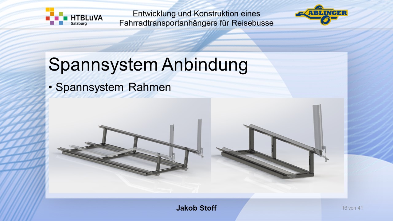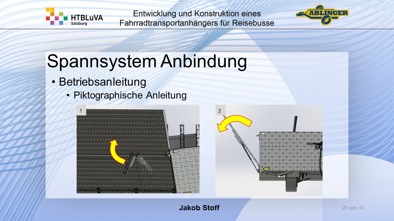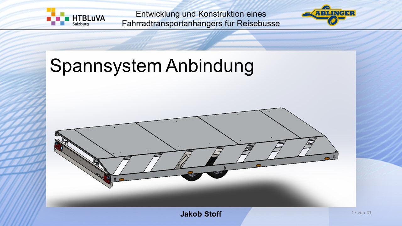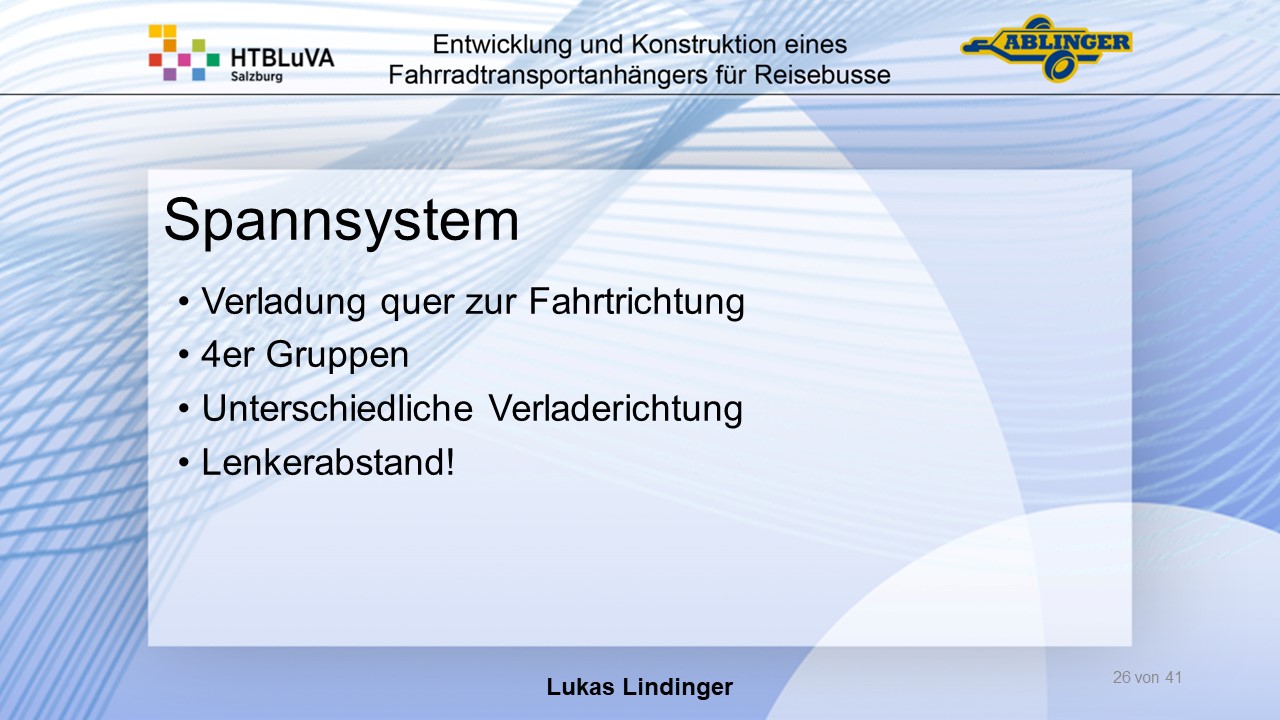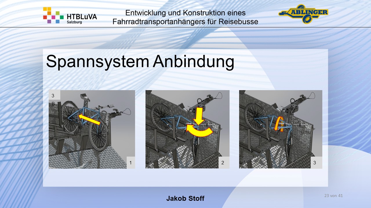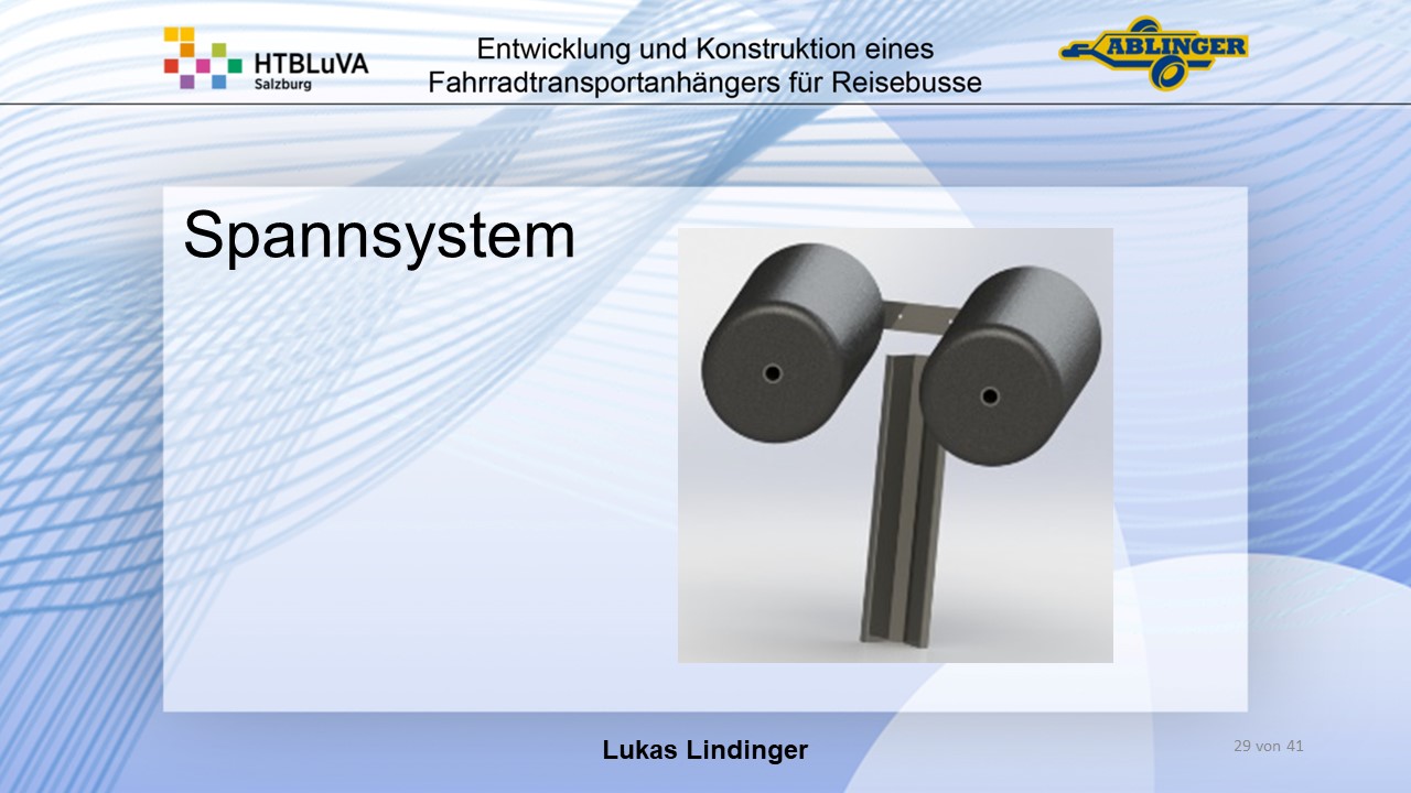 Für die Firma Ablinger Reinhold PKW-Anhänger und Fahrzeugbau GmbH, soll ein Fahrradtransportanhänger mit möglichst benutzerfreundlicher Be- und Entladung entwickelt werden. Bei bisherigen Anhängern ist es nur möglich, die Fahrräder der Reihe nach zu entladen. Bei unserem Anhänger muss die Einzelentnahme, mit minimalem körperlichen Aufwand für den Bediener, möglich sein. Ziel der Diplomarbeit ist ein vollständiges Konzept eines Fahrradtransportanhängers für Reisebusse, inklusive Konstruktion und Dimensionierung, unter Berücksichtigung wirtschaftlicher, fertigungstechnischer und sicherheitsrelevanter Einflüsse zu erstellen.