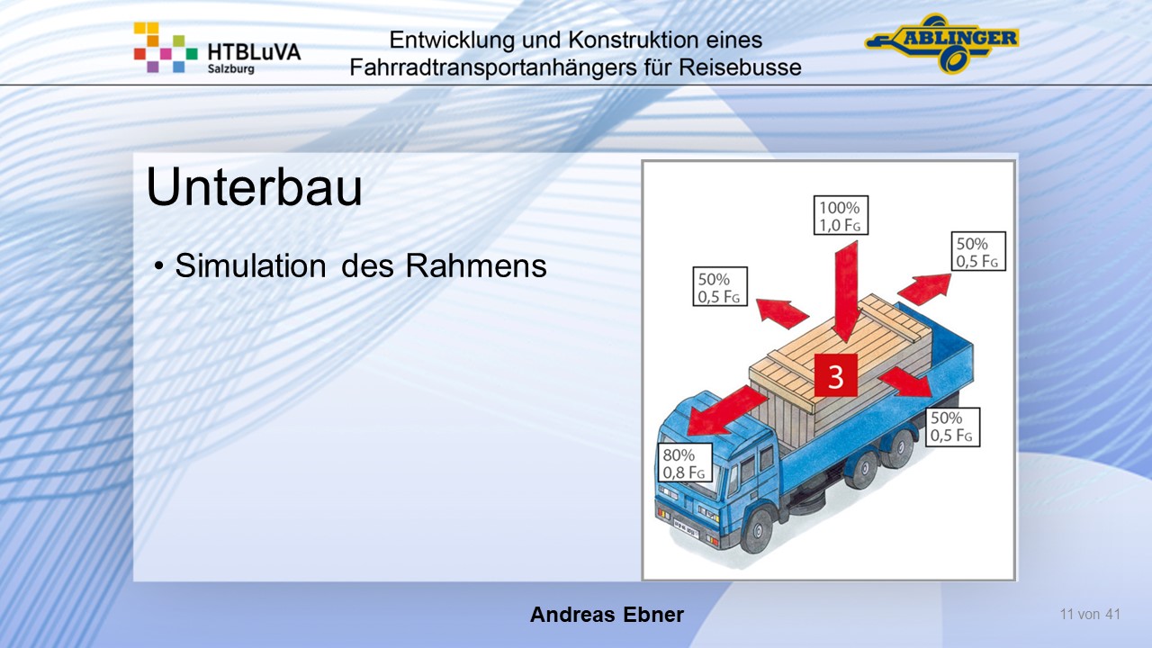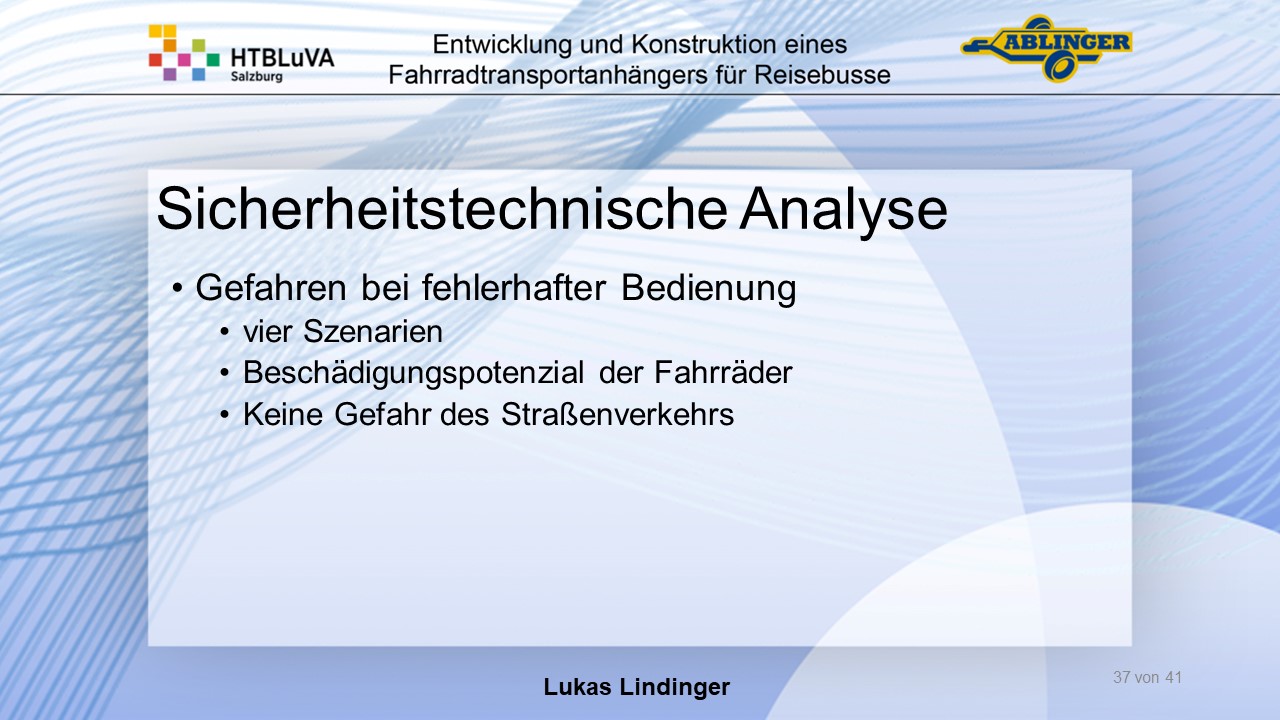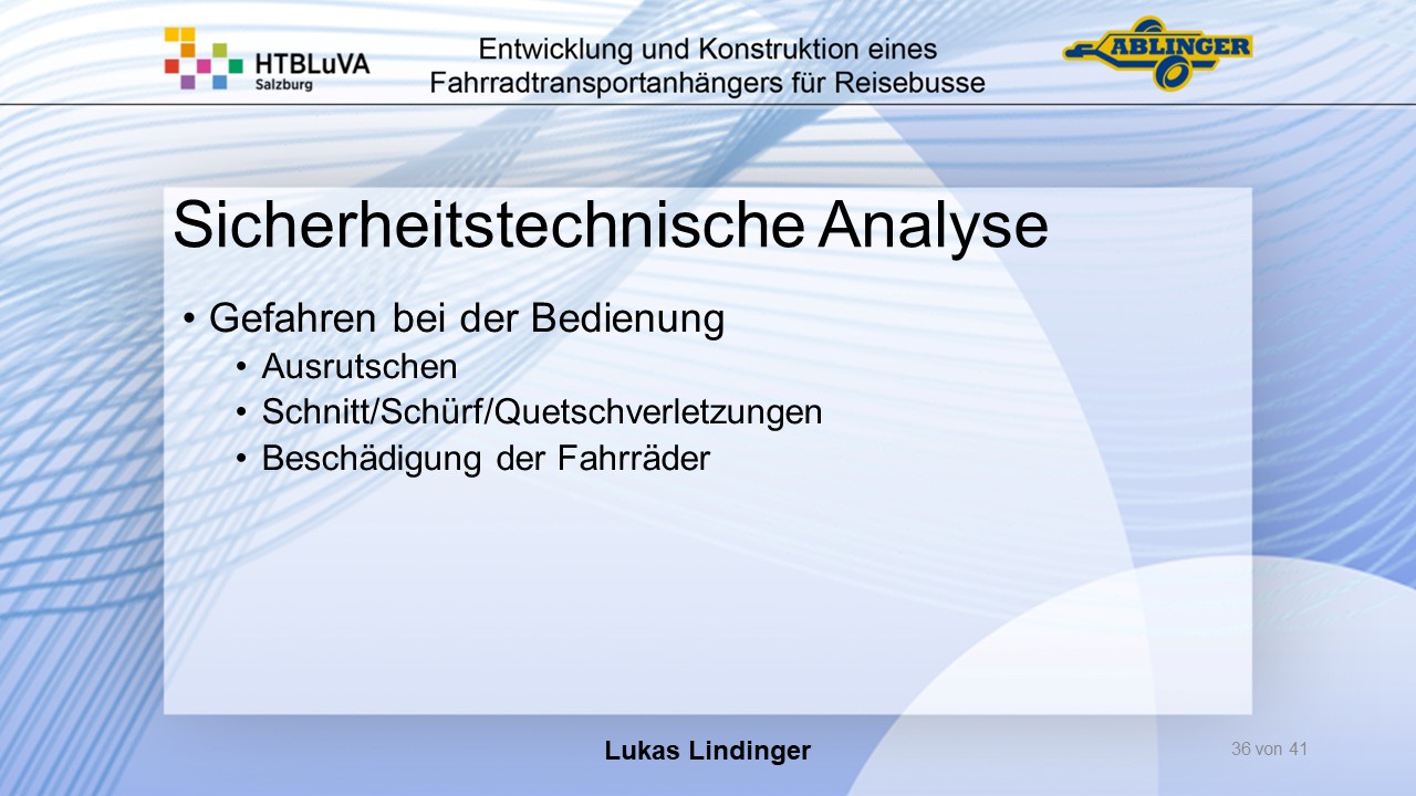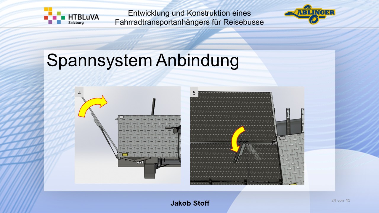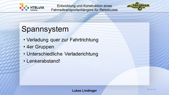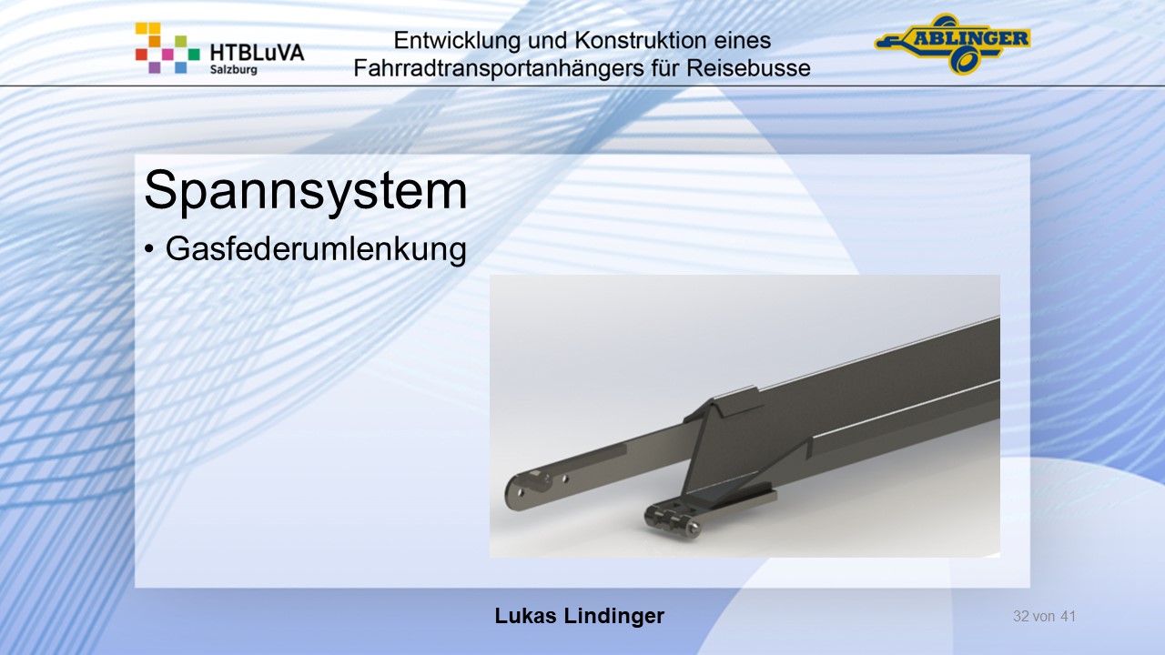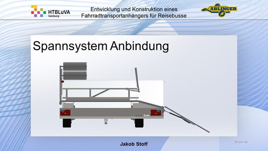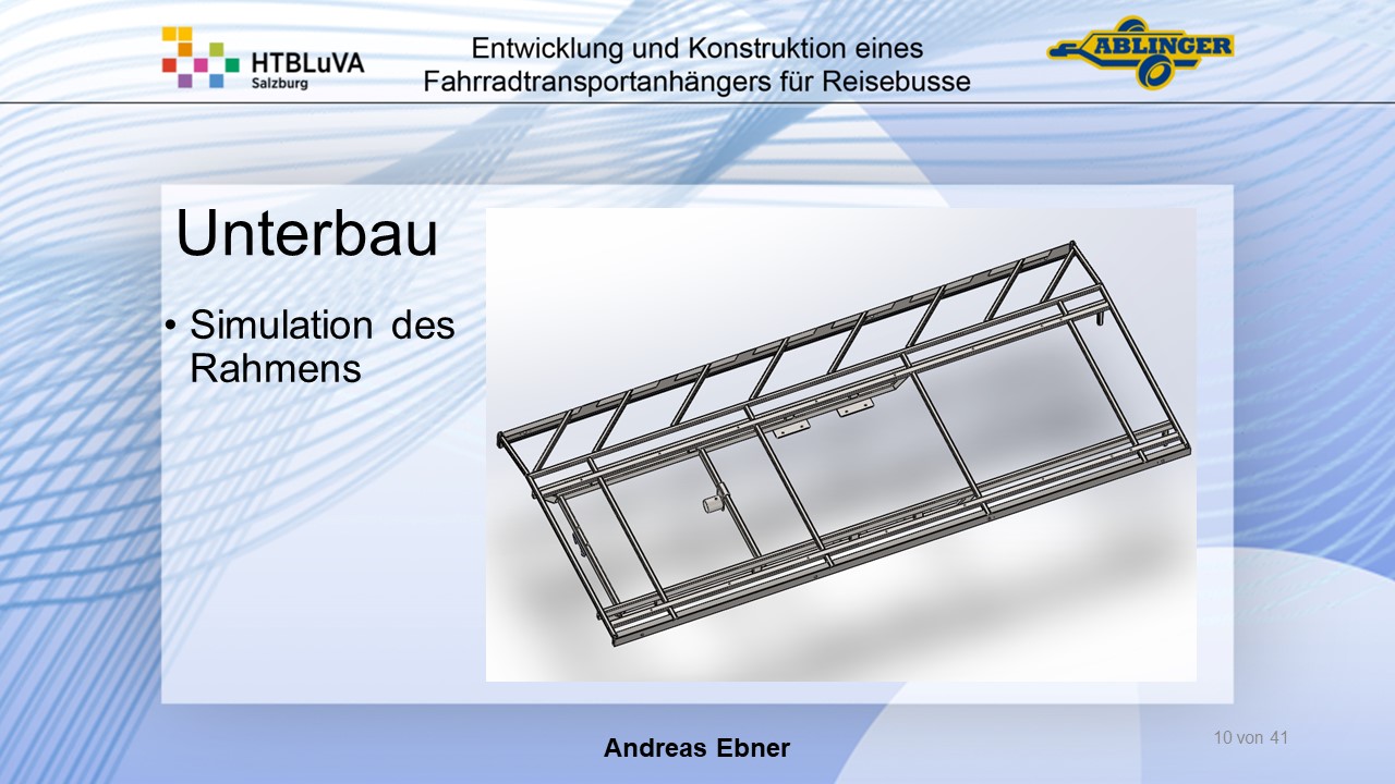 Für die Firma Ablinger Reinhold PKW-Anhänger und Fahrzeugbau GmbH, soll ein Fahrradtransportanhänger mit möglichst benutzerfreundlicher Be- und Entladung entwickelt werden. Bei bisherigen Anhängern ist es nur möglich, die Fahrräder der Reihe nach zu entladen. Bei unserem Anhänger muss die Einzelentnahme, mit minimalem körperlichen Aufwand für den Bediener, möglich sein. Ziel der Diplomarbeit ist ein vollständiges Konzept eines Fahrradtransportanhängers für Reisebusse, inklusive Konstruktion und Dimensionierung, unter Berücksichtigung wirtschaftlicher, fertigungstechnischer und sicherheitsrelevanter Einflüsse zu erstellen.