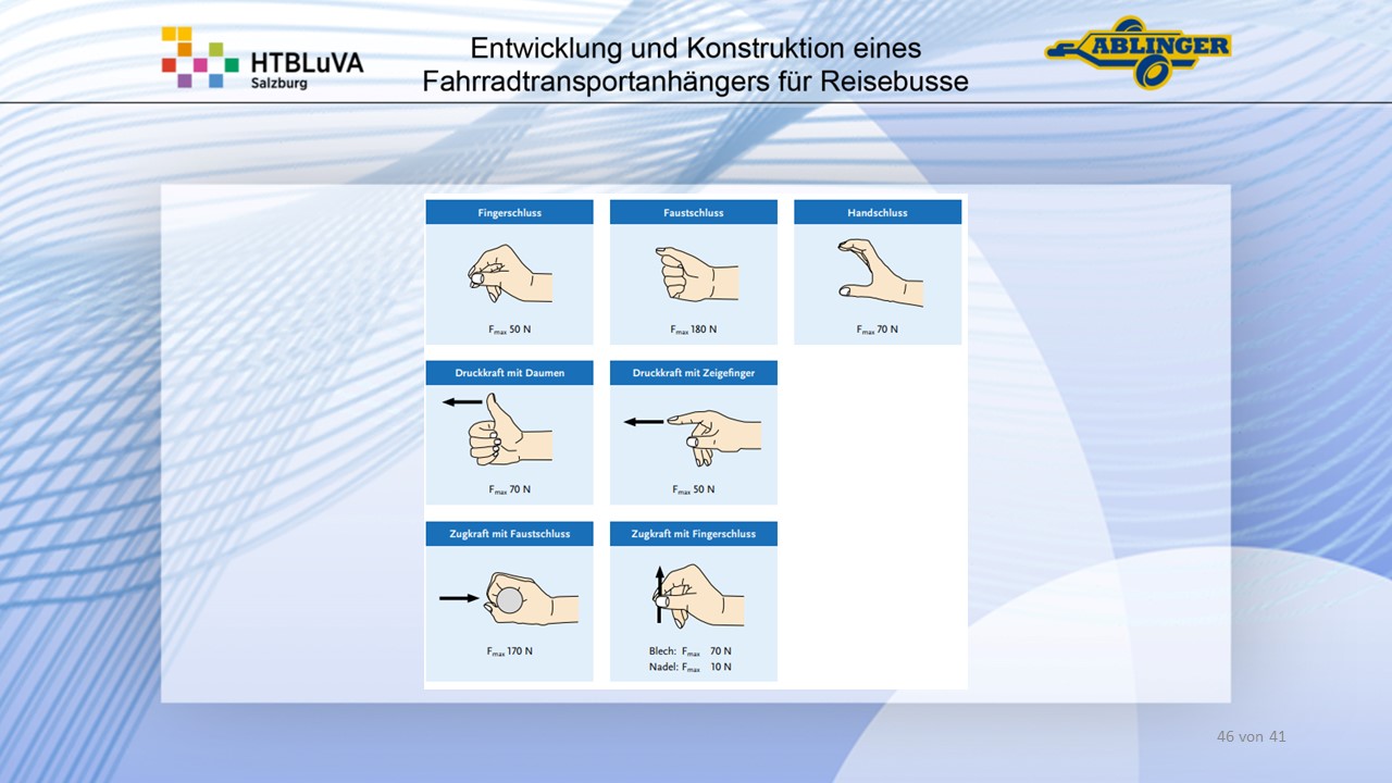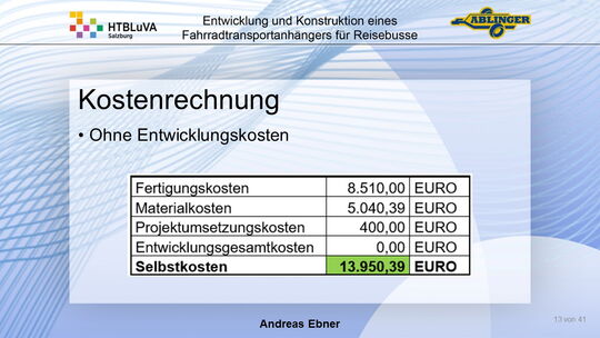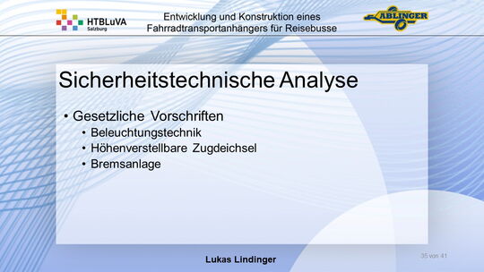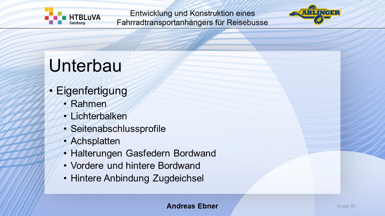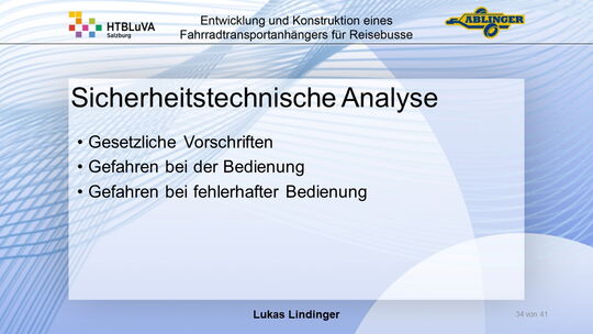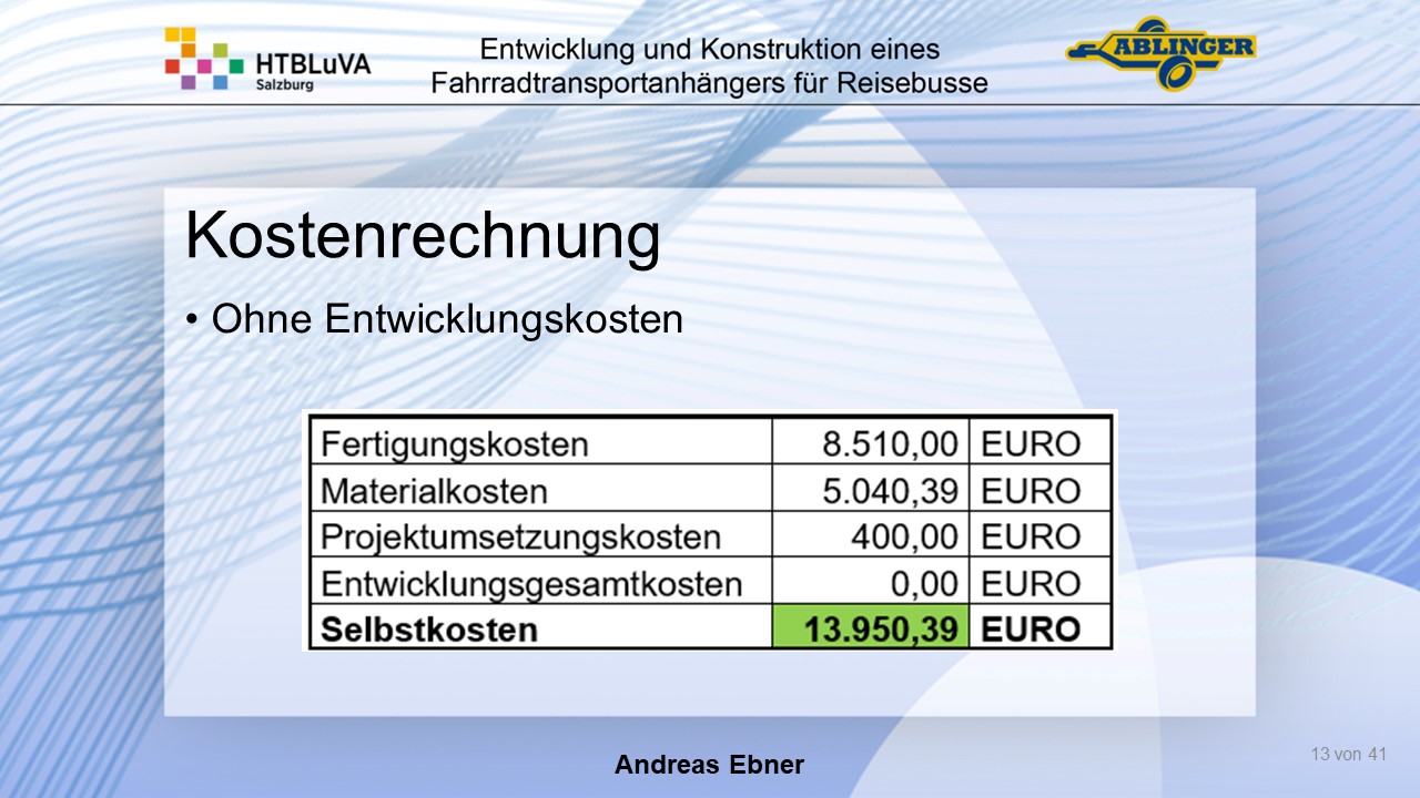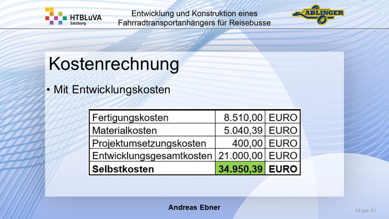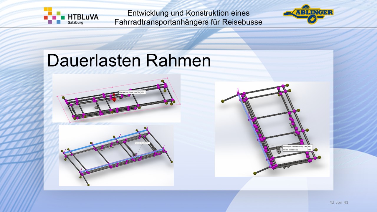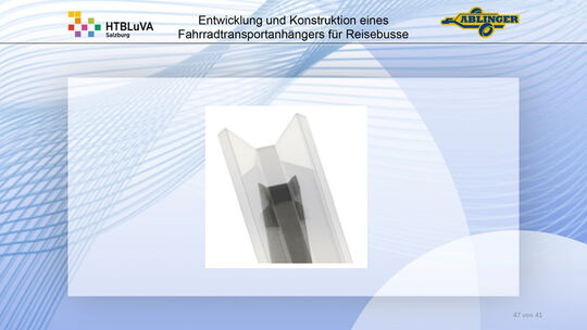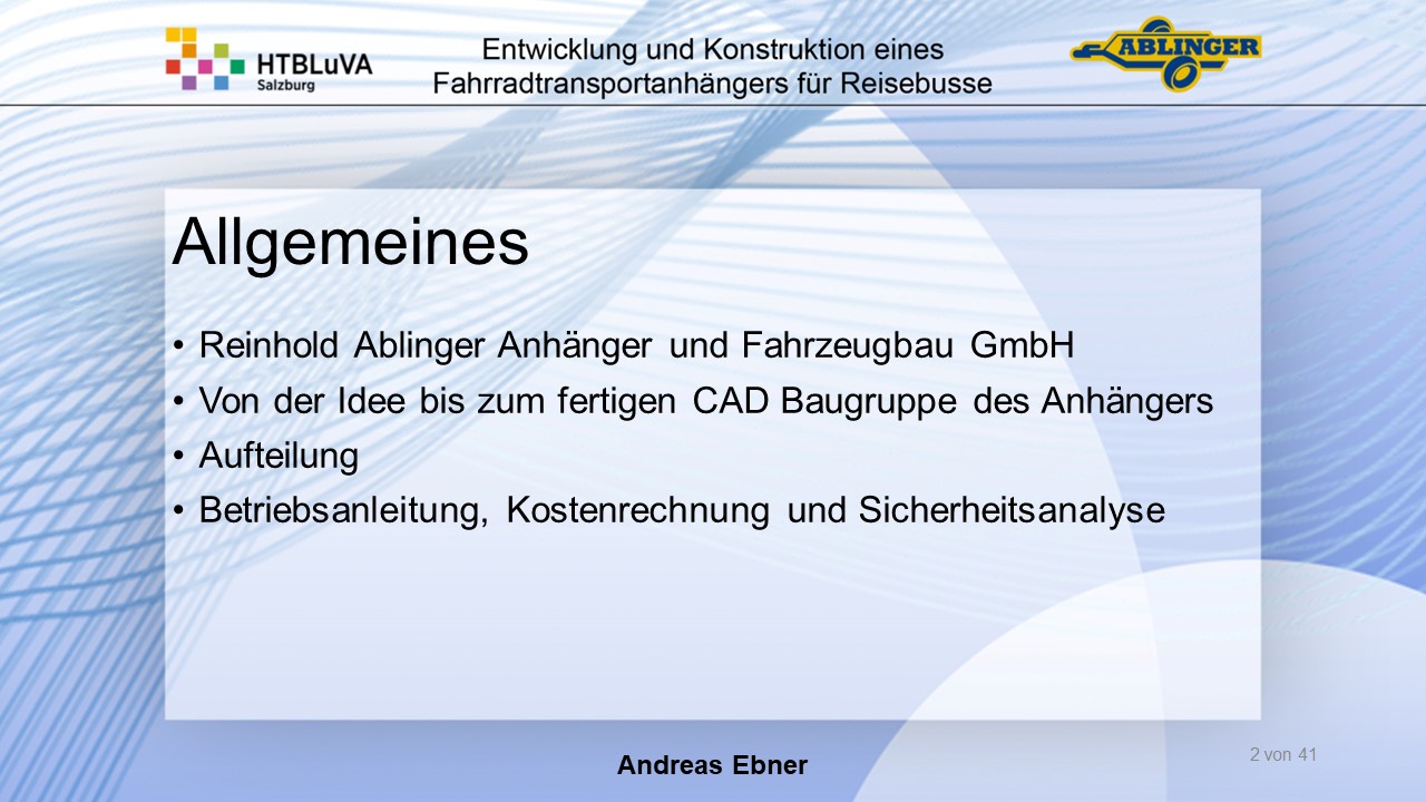 Für die Firma Ablinger Reinhold PKW-Anhänger und Fahrzeugbau GmbH, soll ein Fahrradtransportanhänger mit möglichst benutzerfreundlicher Be- und Entladung entwickelt werden. Bei bisherigen Anhängern ist es nur möglich, die Fahrräder der Reihe nach zu entladen. Bei unserem Anhänger muss die Einzelentnahme, mit minimalem körperlichen Aufwand für den Bediener, möglich sein. Ziel der Diplomarbeit ist ein vollständiges Konzept eines Fahrradtransportanhängers für Reisebusse, inklusive Konstruktion und Dimensionierung, unter Berücksichtigung wirtschaftlicher, fertigungstechnischer und sicherheitsrelevanter Einflüsse zu erstellen.