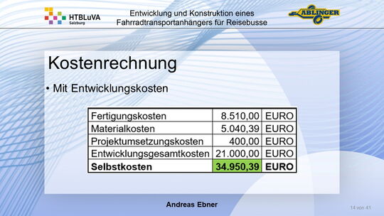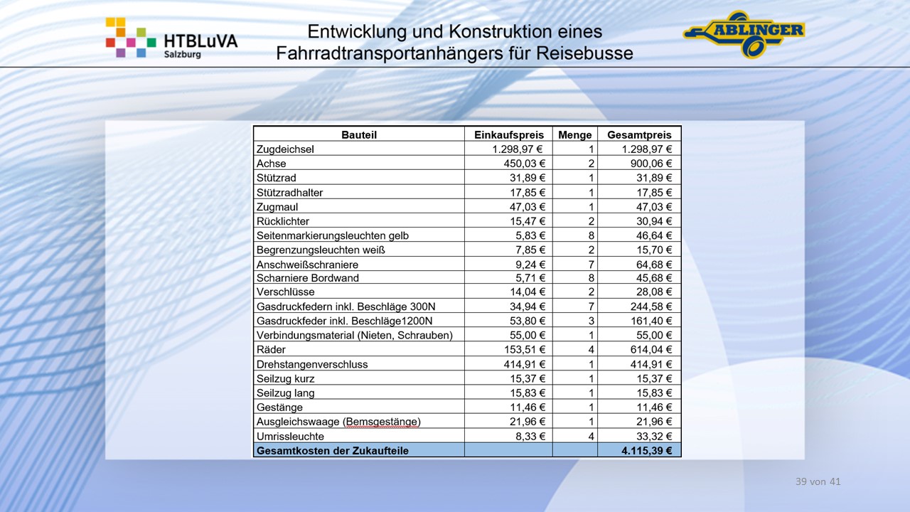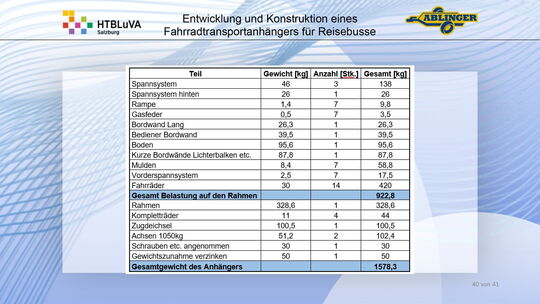 Das Ergebnis ist ein vollständiger Fahrradtransportanhänger, der alle Anforderungen erfüllt. Die Arbeit wurde der Firma Ablinger im Februar 2021 übergeben. Zur Zeit der