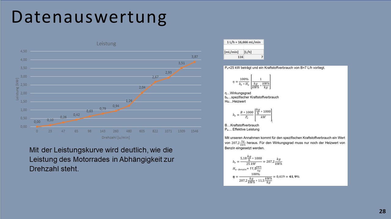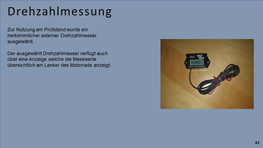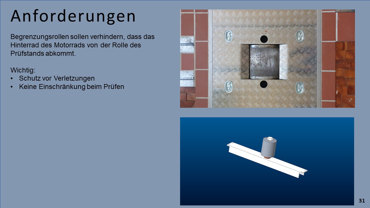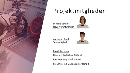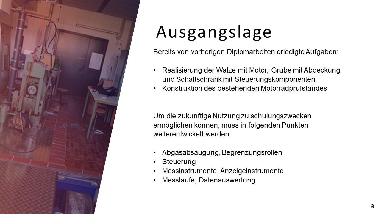 Ein, sich bereits in der HTBLuVA Salzburg befindender Motorradprüfstand, soll für die zukünftige Nutzung bei Laborübungen weiterentwickelt werden. Einerseits wurde sich zur Aufgabe gemacht, fehlende Komponenten des Rollenprüfstandes zu Entwickeln und Verwirklichen. Des Weiteren lag ein Augenmerk auf der Datenerfassung und Auswertung während Messläufen.