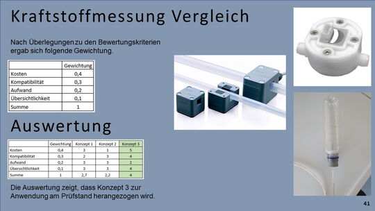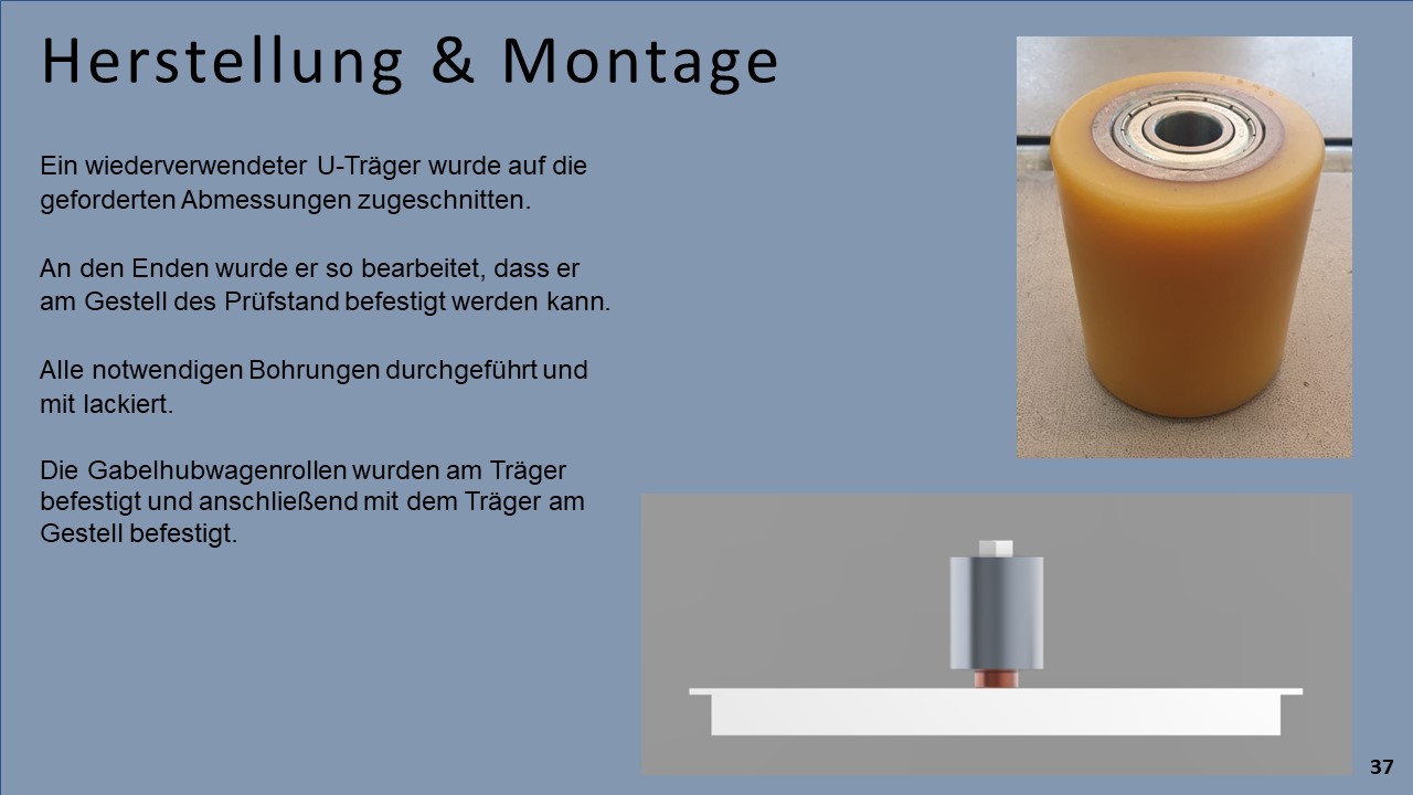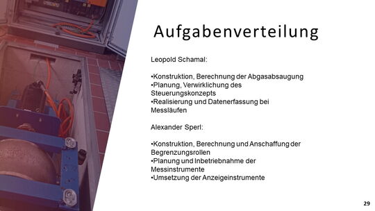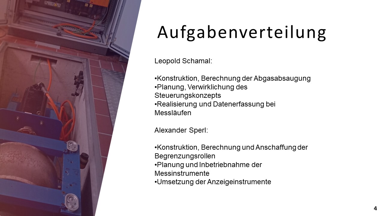 Um eine volle Funktionsfähigkeit und korrekte Messabläufe zu erlangen, mussten Arbeiten aus vielen Bereichen der Technik durchgeführt werden. Für die Umsetzung der Abgasabsaugung, der Begrenzungsrollen und der Anzeigevorrichtung waren konstruktive Tätigkeiten notwendig. Zudem kamen Arbeiten im Bereich der Elektrotechnik für die Steuerung und Datenauswertung. Weiteres wurden praktische Dinge, wie die Verkabelung oder der Motorausbau durchgeführt.