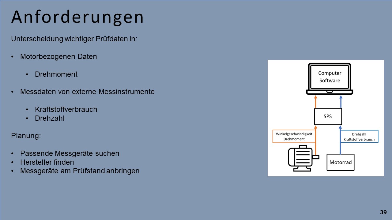 Das Ergebnis dieses Projekts soll ein Motorradprüfstand sein, der alle Sicherheitsanforderungen einhält und eine einfache Bedienung gewährleistet. Hinzu kommen die Dokumentation und strukturierte Darstellung der Messdaten.