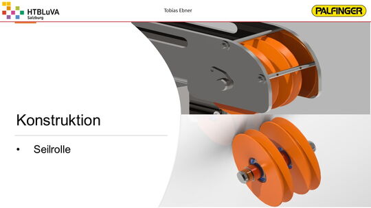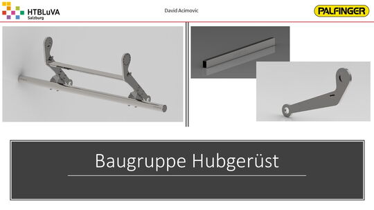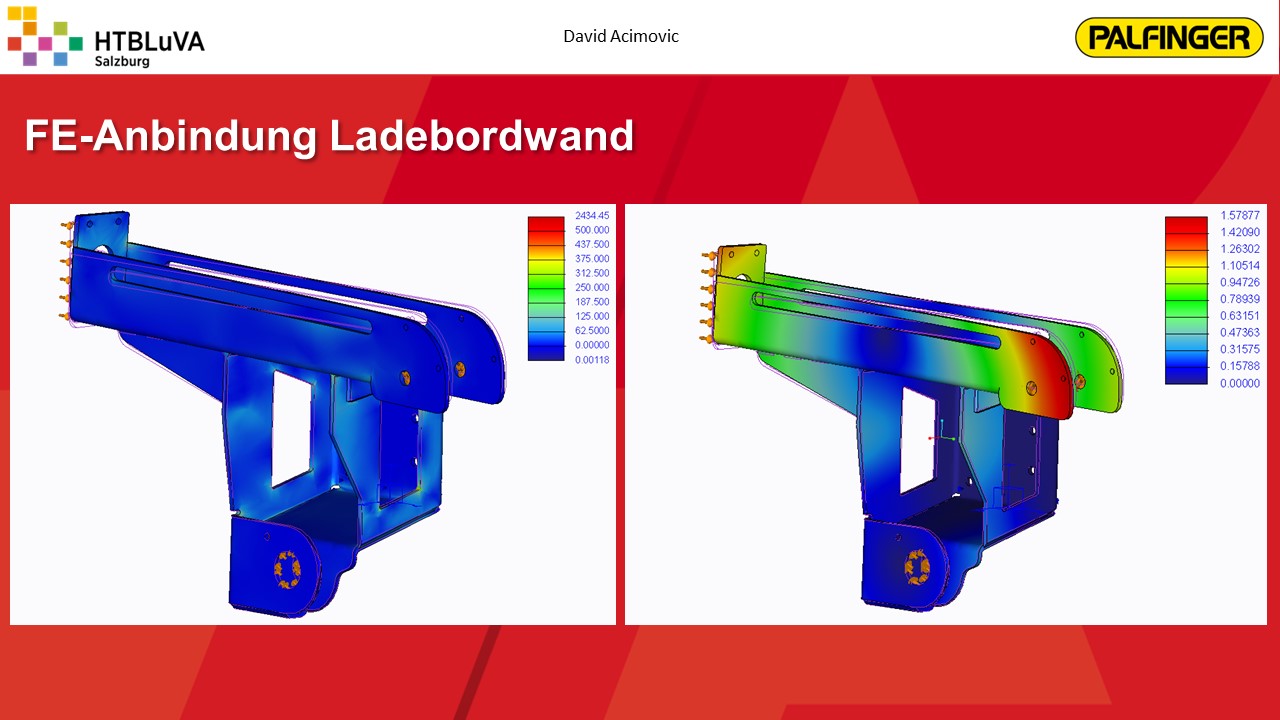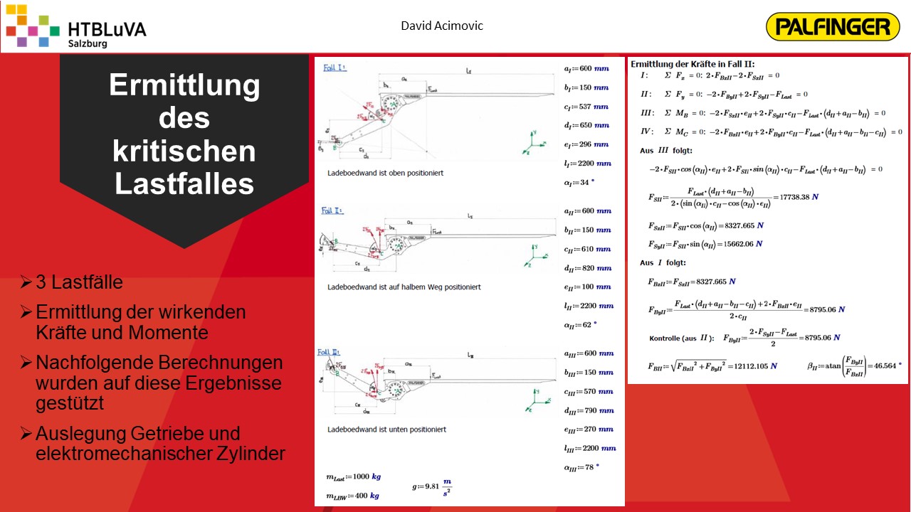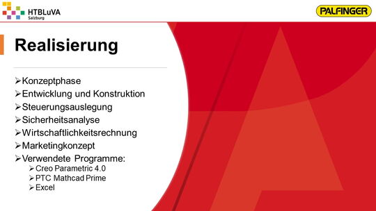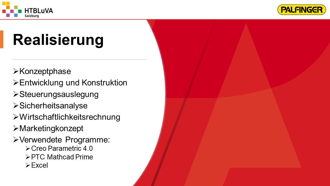 Nach einer sehr intensiven Konzeptphase wurde mithilfe der Firmenbetreuer aus mehreren Konzepten die beste Lösung erarbeitet. Es handelt sich hierbei um eine Kombination aus Seilzugsystem und Drehantrieb, welche die Bewegung der Ladebordwand bewerkstelligen soll. Anschließend wurde das Projekt in drei Hauptbereiche unterteilt. Jedes Teammitglied übernahm die Verantwortung für eines dieser Bereiche. Für die Realisierung der Gesamtkonstruktion und die Finite-Elemente-Analyse wurde ,,Creo Parametric 4.0‘‘ verwendet. Für Berechnungen und die Darstellung von Diagrammen war ,,PTC Mathcad Prime‘‘ sehr hilfreich.