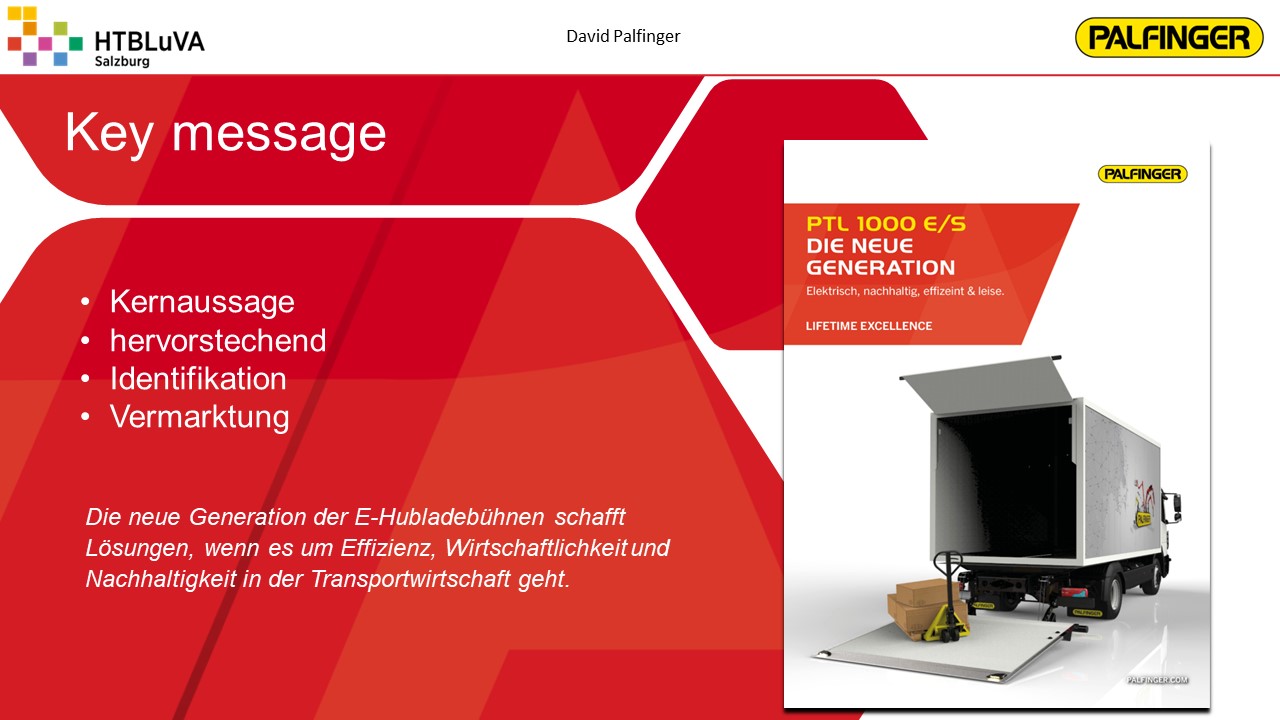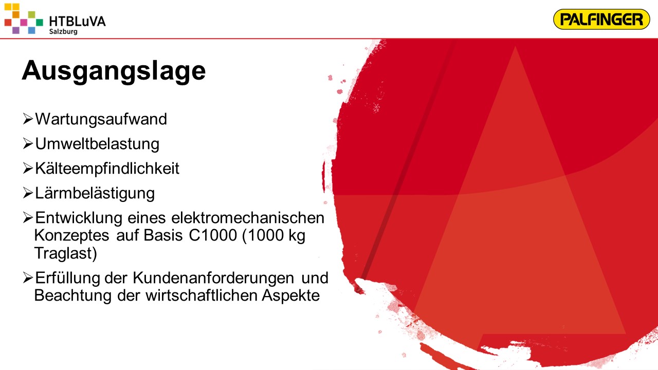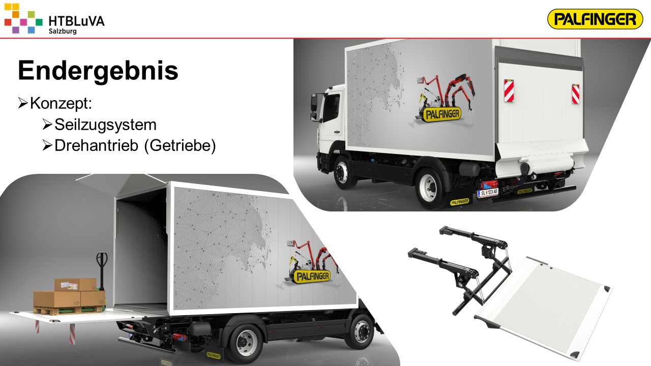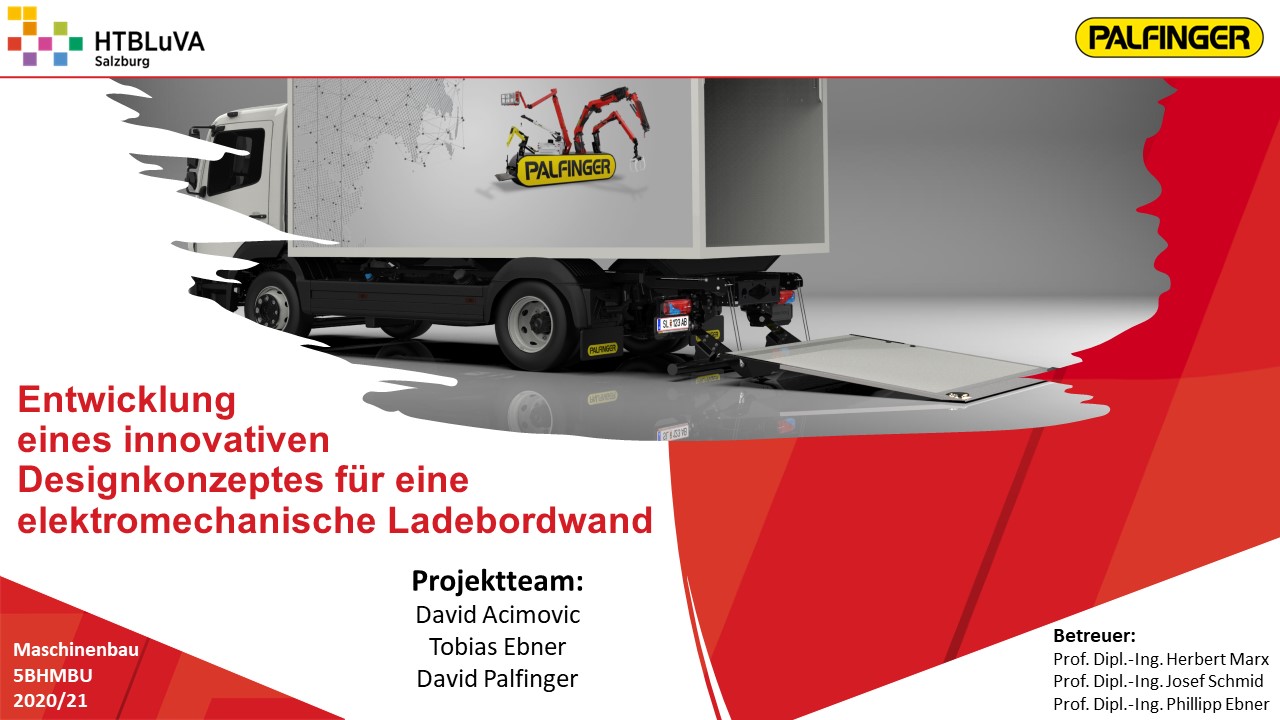 Ladebordwände werden üblicherweise über einen elektrohydraulischen Antrieb angetrieben. Da hydraulische Antriebe einige Nachteile aufweisen, soll für die Firma Palfinger ein kostengünstiges elektromechanisches Konzept auf Basis C1000 (1000 kg Traglast) entwickelt werden. Dabei sollen neben der technischen Lösung die Erfüllung der Kundenanforderungen sowie die wirtschaftlichen Aspekte beachtet werden, um das Produkt erfolgreich am Markt anbieten zu können.