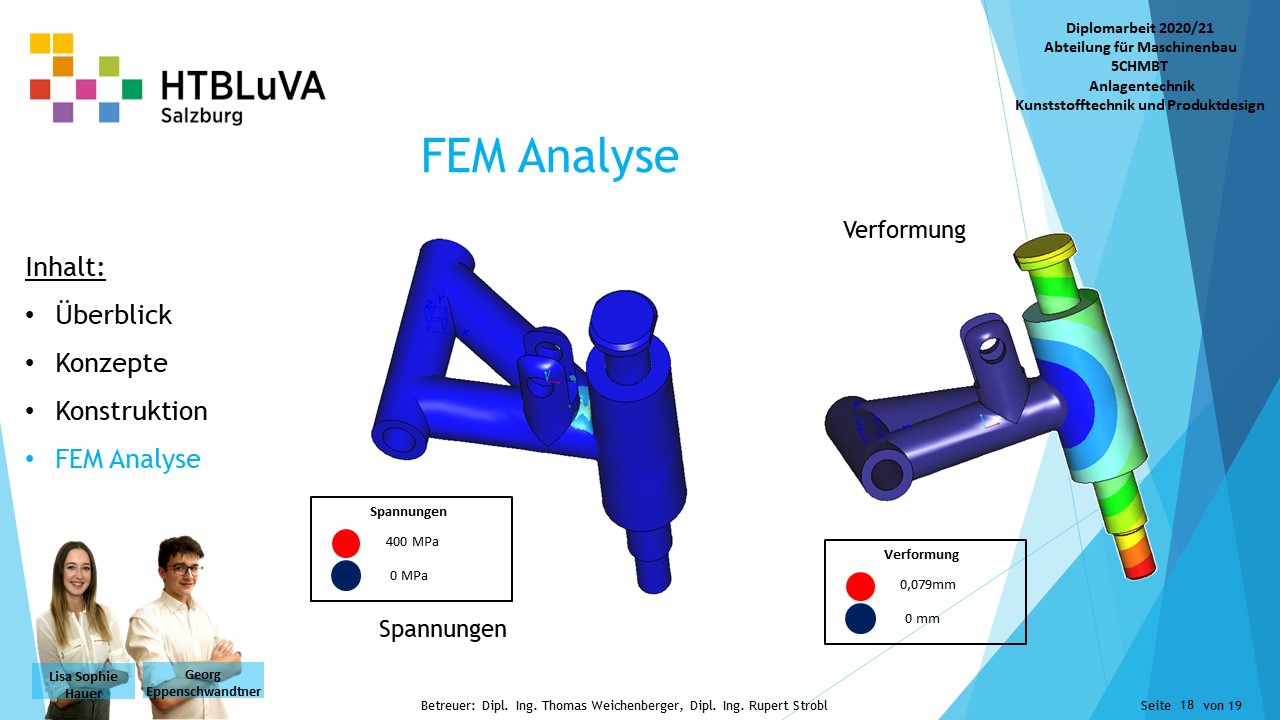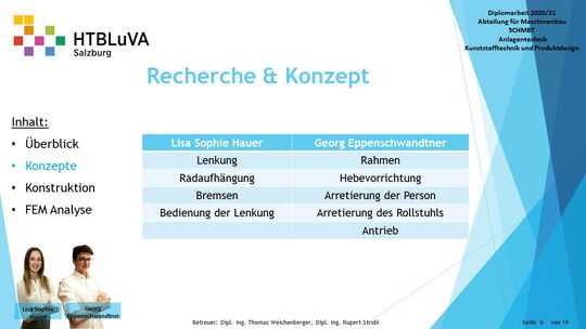 Nach dem Entwurf verschiedener Konzepte wurden diese bewertet um so das beste Konzept zu finden. Anschließend wurden relevante Komponenten vordimensioniert und anhand der gewonnenen Daten konstruierten wir den Fahruntersatz. Außerdem wurde eine Antriebseinheit ausgelegt, sowie ein Festigkeitsnachweiß mit Hilfe der FEM Analyse durchgeführt. Abschließend wurde eine Leistungsberechnung und eine Beurteilung der unterschiedlichen Fertigungsverfahren der einzelnen Komponenten erarbeitet.