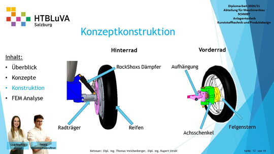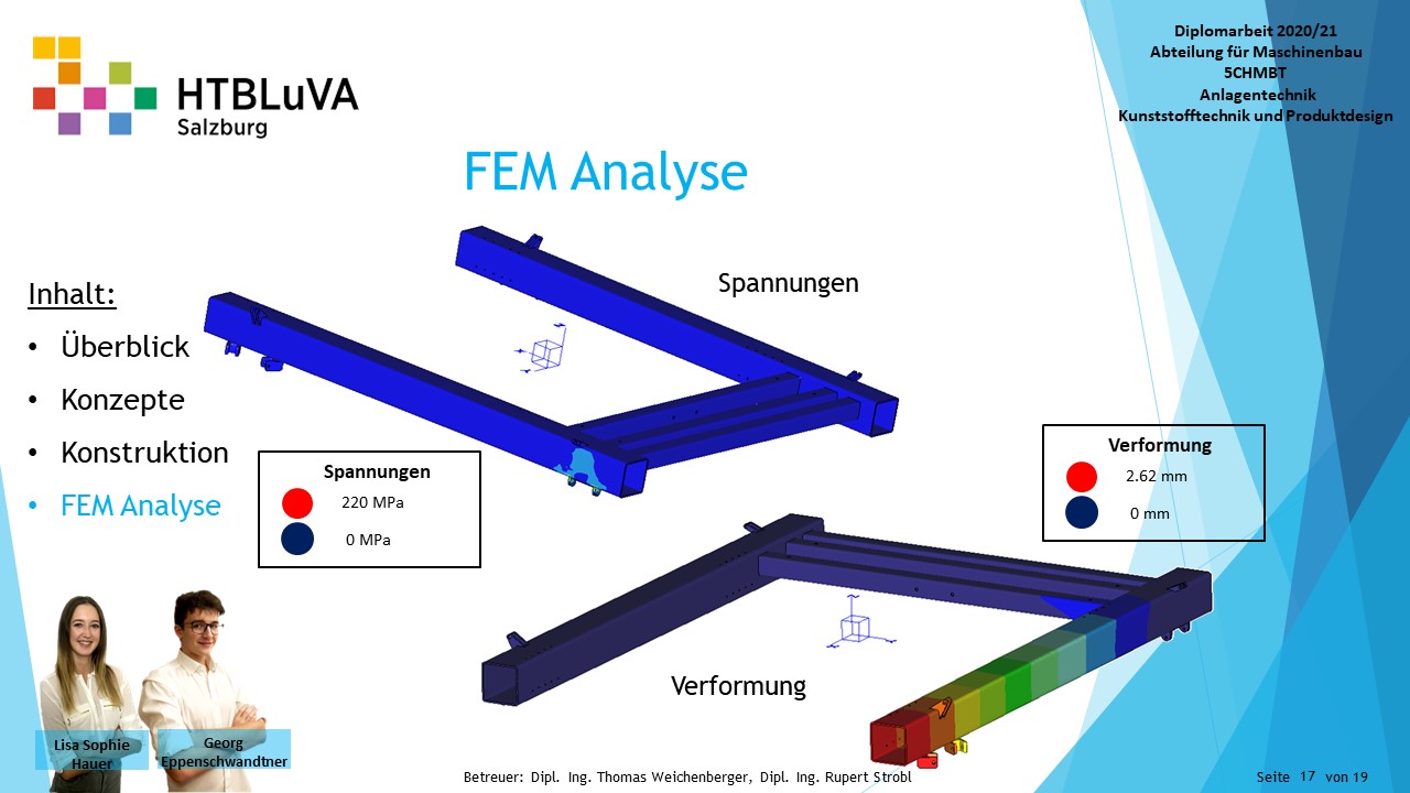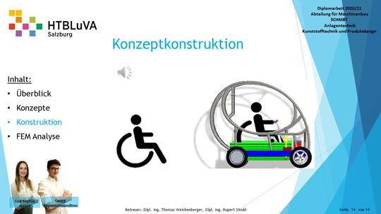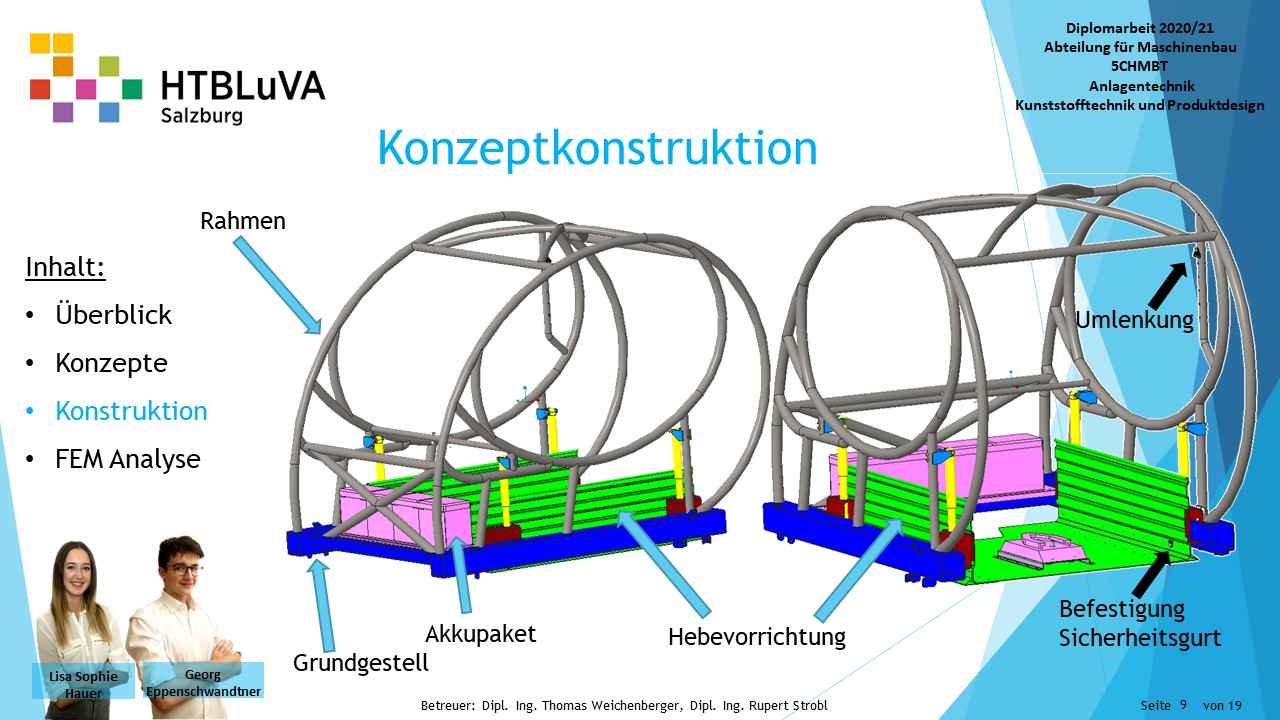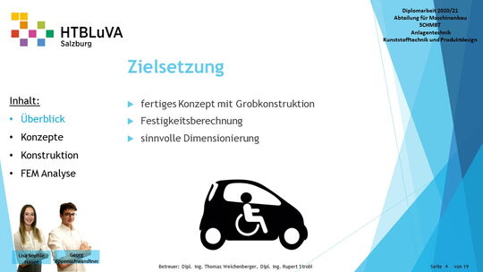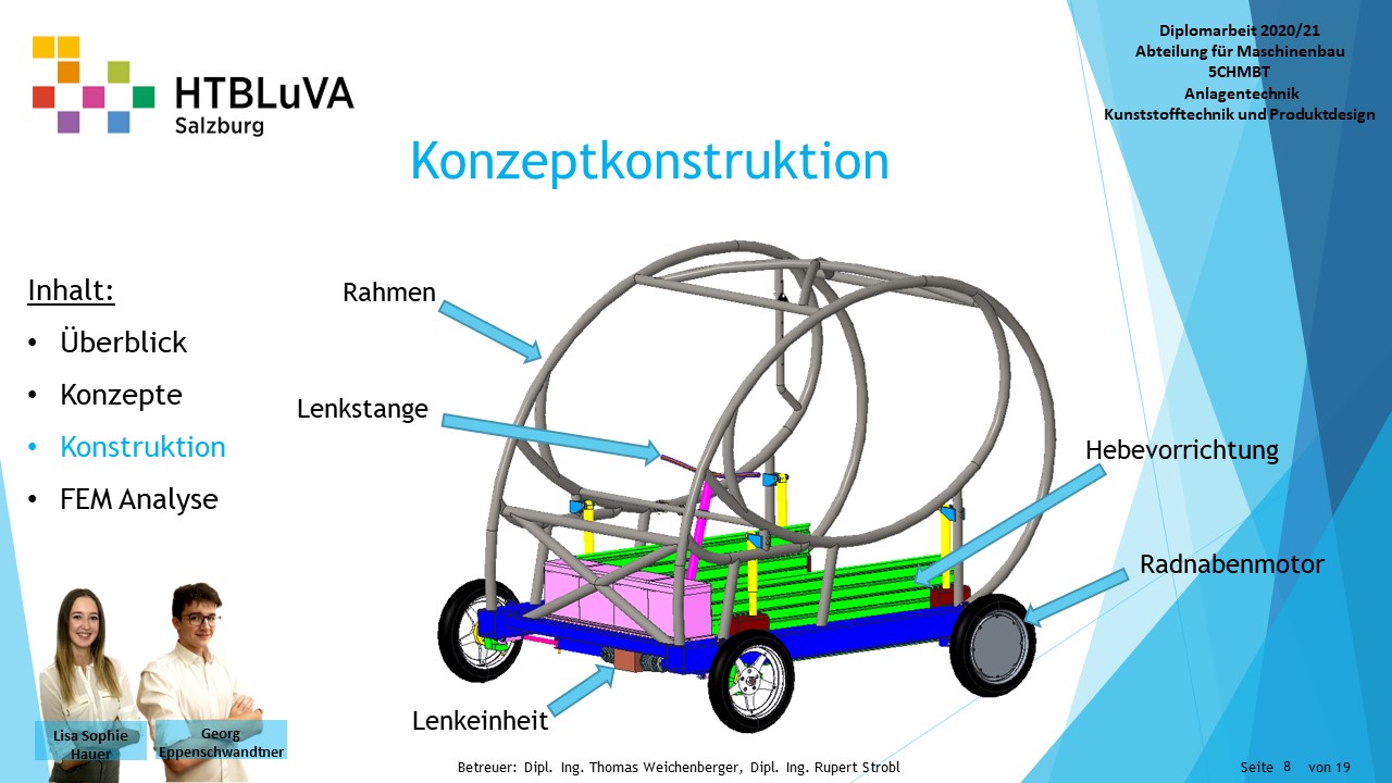 Das Ergebnis der Diplomarbeit ist ein fertiges Konzept mit vorliegender Grobkonstruktion des gesamten Fahrzeuges unter Berücksichtigung der gestellten Anforderungen werden. Alle relevanten Komponenten wurden hinsichtlich Festigkeit und unter Berücksichtigung von fertigungstechnischen und wirtschaftlichen Einflussgrößen dimensioniert.