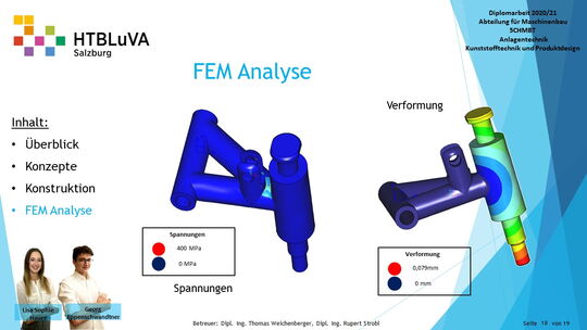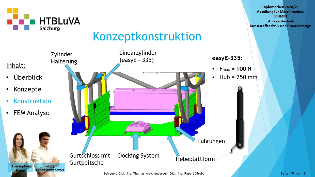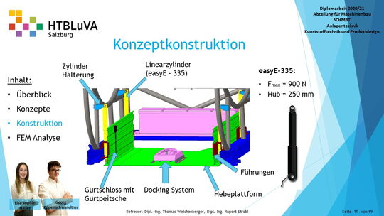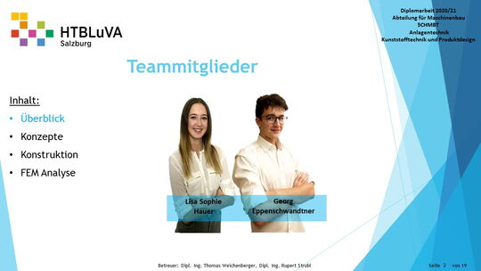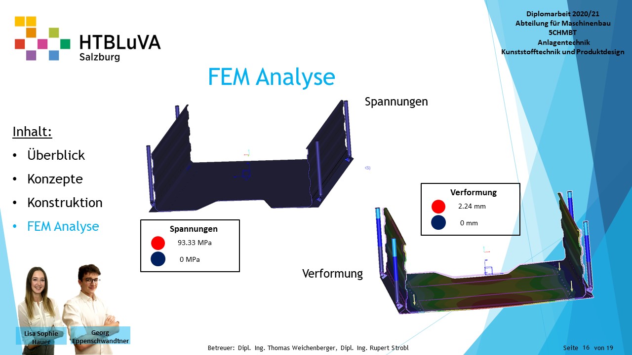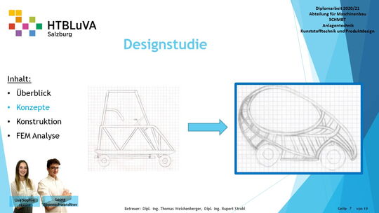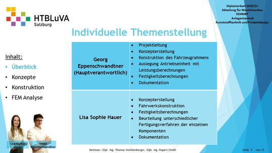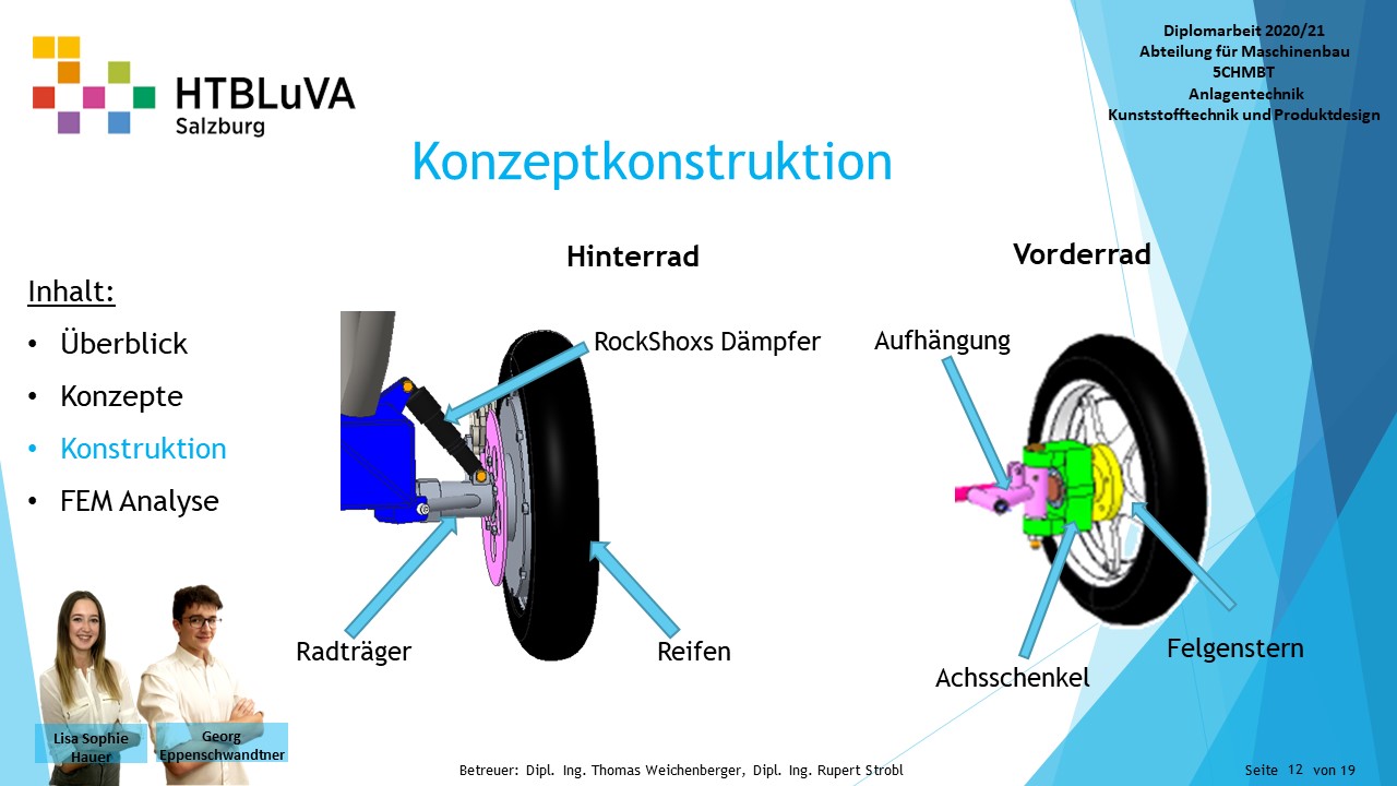 Das Ergebnis der Diplomarbeit ist ein fertiges Konzept mit vorliegender Grobkonstruktion des gesamten Fahrzeuges unter Berücksichtigung der gestellten Anforderungen werden. Alle relevanten Komponenten wurden hinsichtlich Festigkeit und unter Berücksichtigung von fertigungstechnischen und wirtschaftlichen Einflussgrößen dimensioniert.
