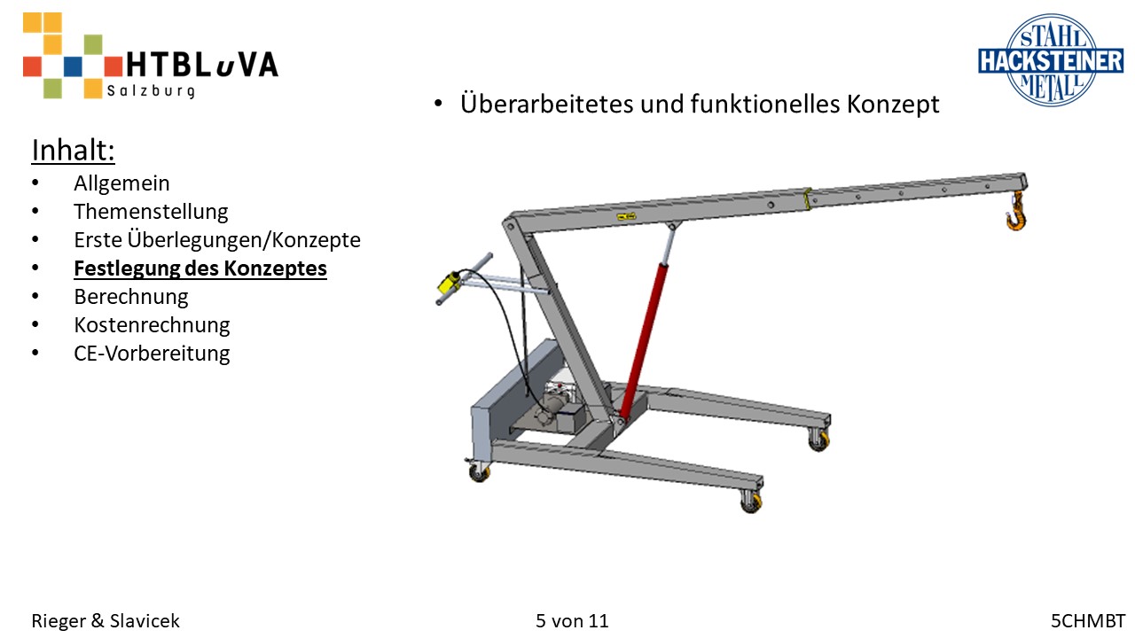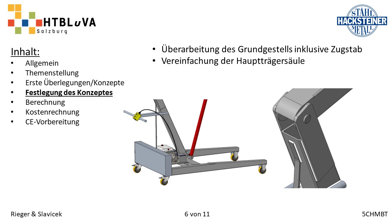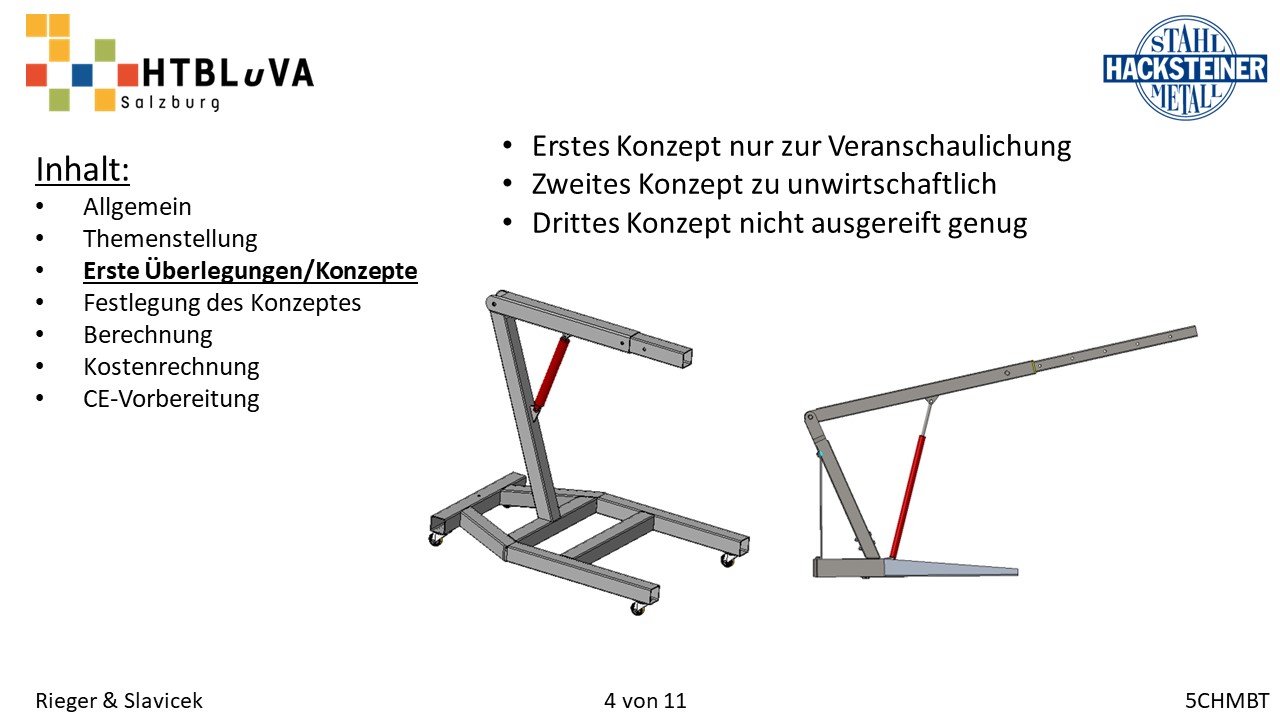 Im Rahmen des Abschlussschuljahres 2020/21 haben wir uns dazu entschlossen als Diplomarbeit im Auftrag der Firma Hacksteiner Metall GmbH eine universell einsetzbare Hebehilfe zu konstruieren. Diese muss speziell an die Bedürfnisse der Firma angepasst werden (siehe 2.2 Anforderungen und Besonderheiten), um Mitarbeiter zu entlasten und Produktionszeiten zu verkürzen. Sie soll hauptsächlich eingesetzt werden, um Biegeteile ohne Einsatz des Hallenkrans zu und von der Biegemaschine zu befördern. Jedoch soll es auch möglich sein, Fahrzeuge zu be- und entladen, folglich ist die Mobilität und schnelle Einsatzzeit der Hebehilfe ein nicht unwichtiges Kriterium.