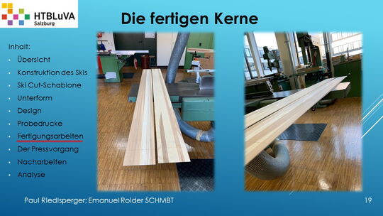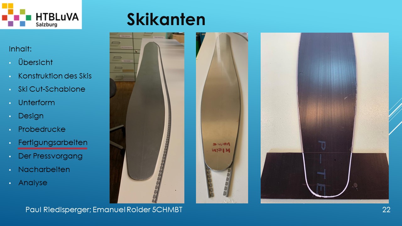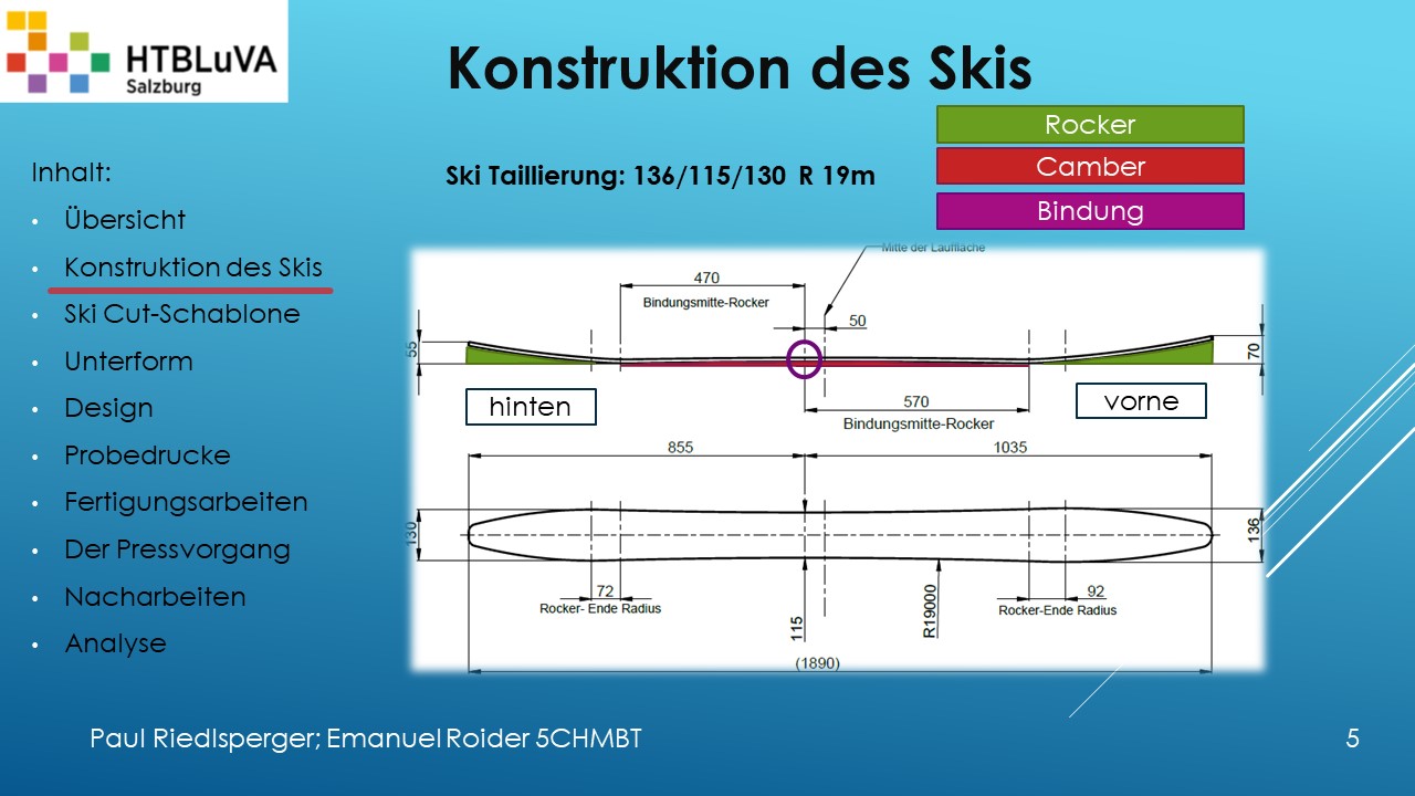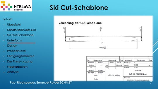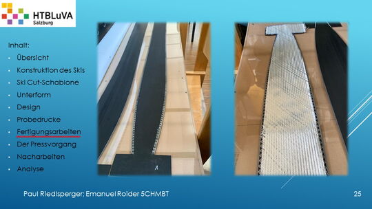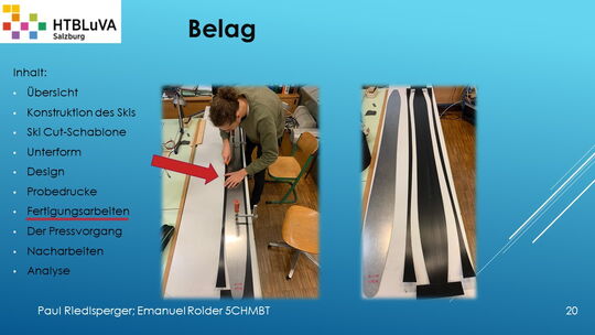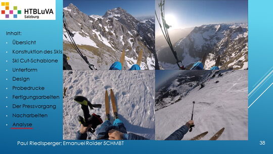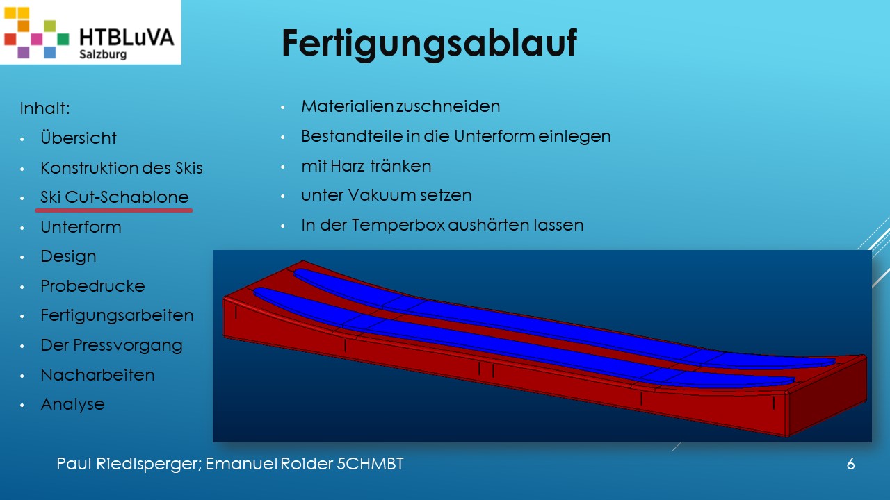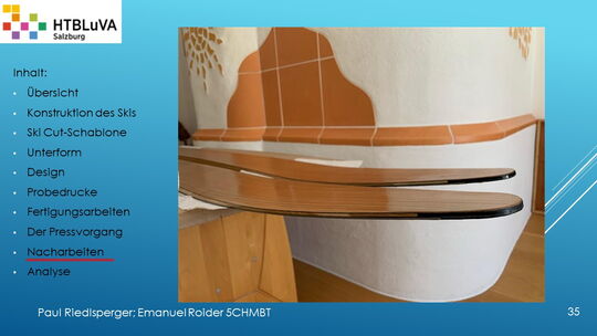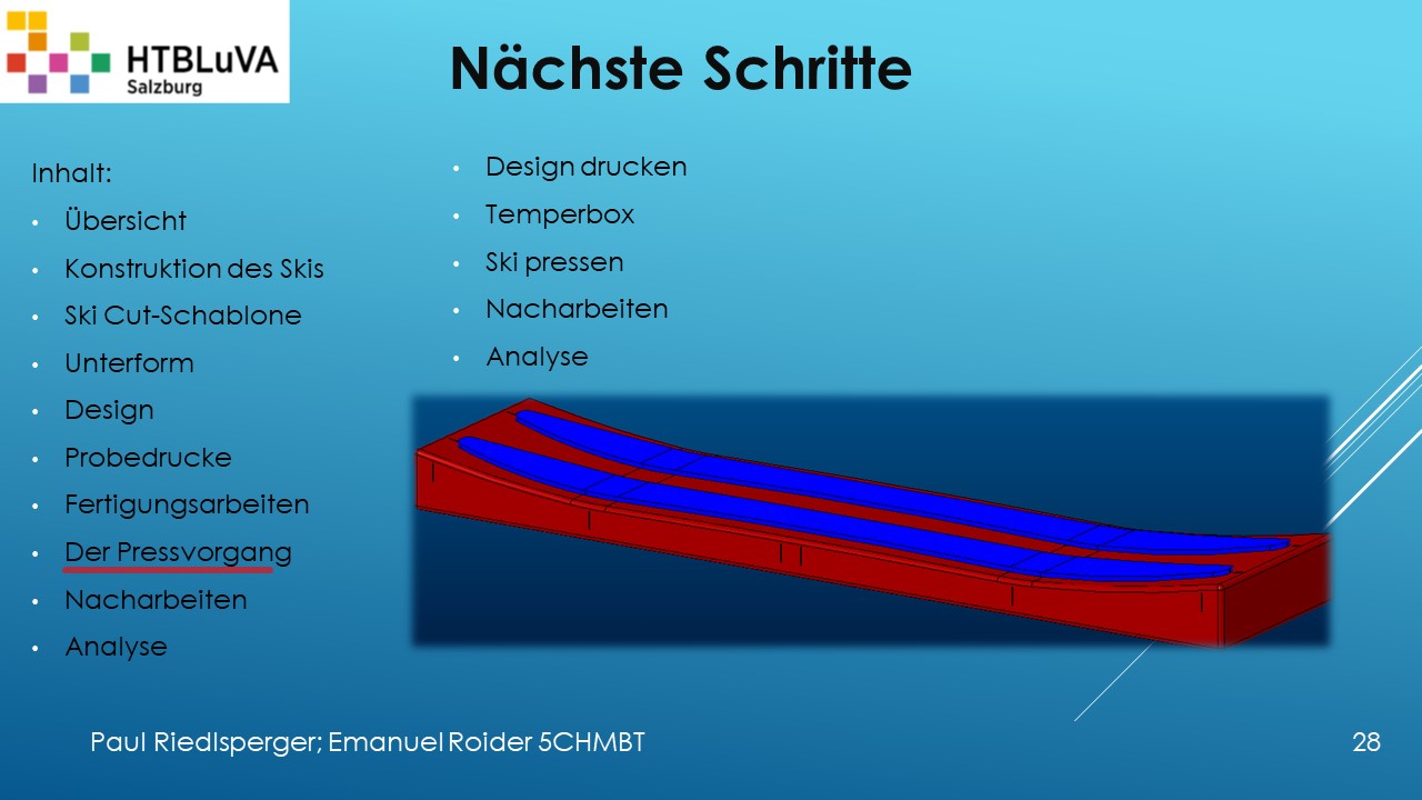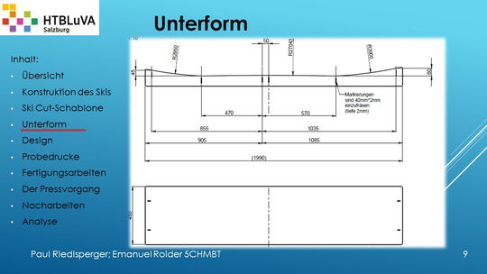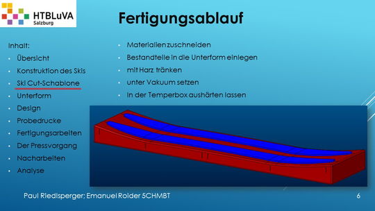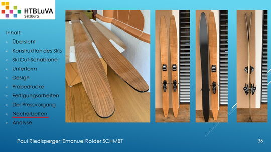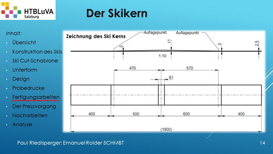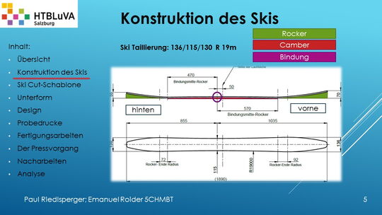 Hauptaufgabe unserer Diplomarbeit ist es, einen Ski in Zusammenarbeit mit Prof. Mag. Daniel Feichtinger von Grund auf zu planen, zu fertigen und zu analysieren. Um einen flexiblen und gleichzeitig sehr strapazierfähigen Ski entwerfen zu können, sind der Aufbau, das Material und die Form entscheidend für das optimale Verhalten im freien Gelände. All diese komplexen Konstruktions-, Planungs- und Fertigungsschritte werden wir anhand der Diplomarbeit umfangreich behandeln und optimieren.