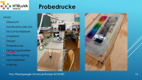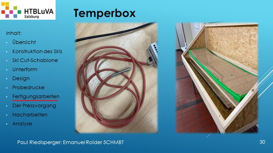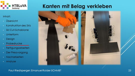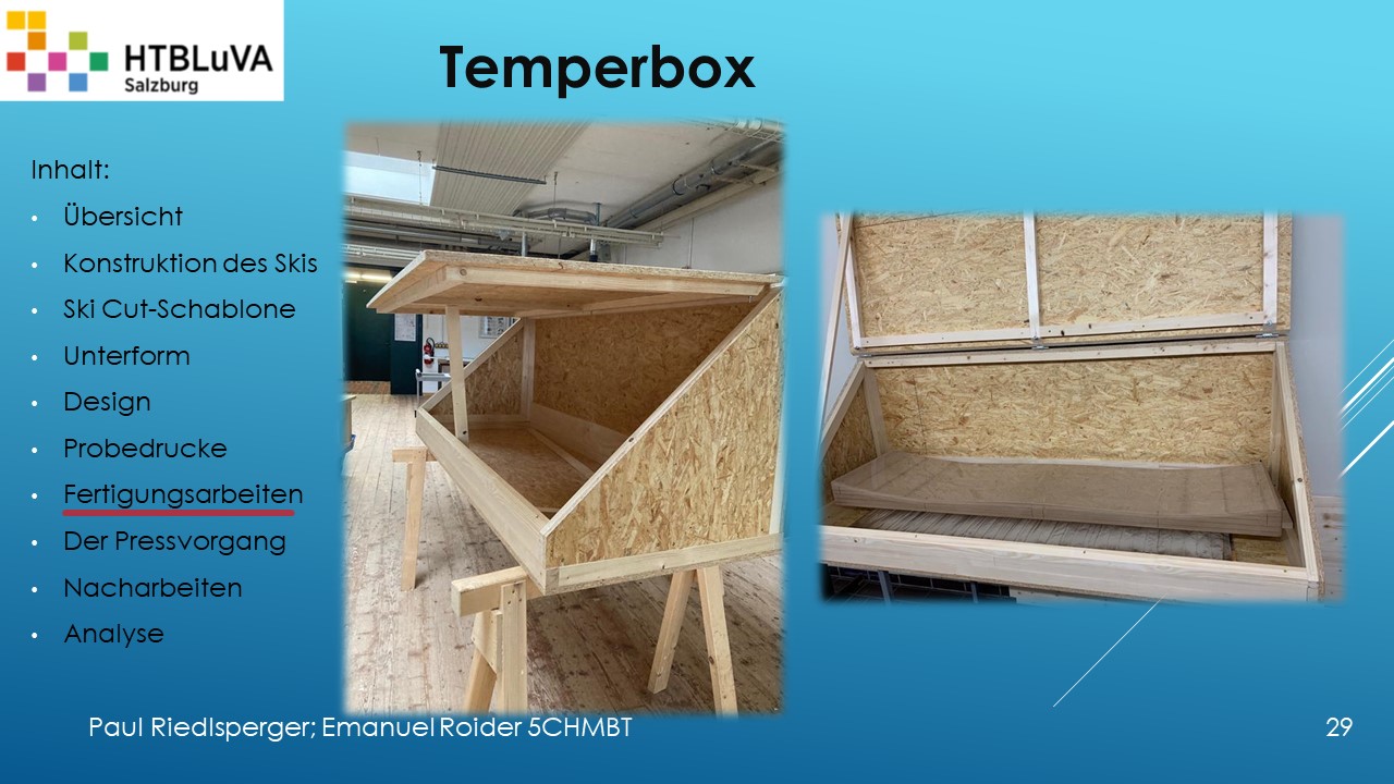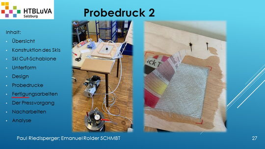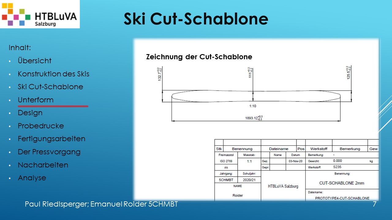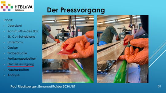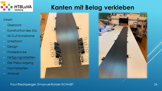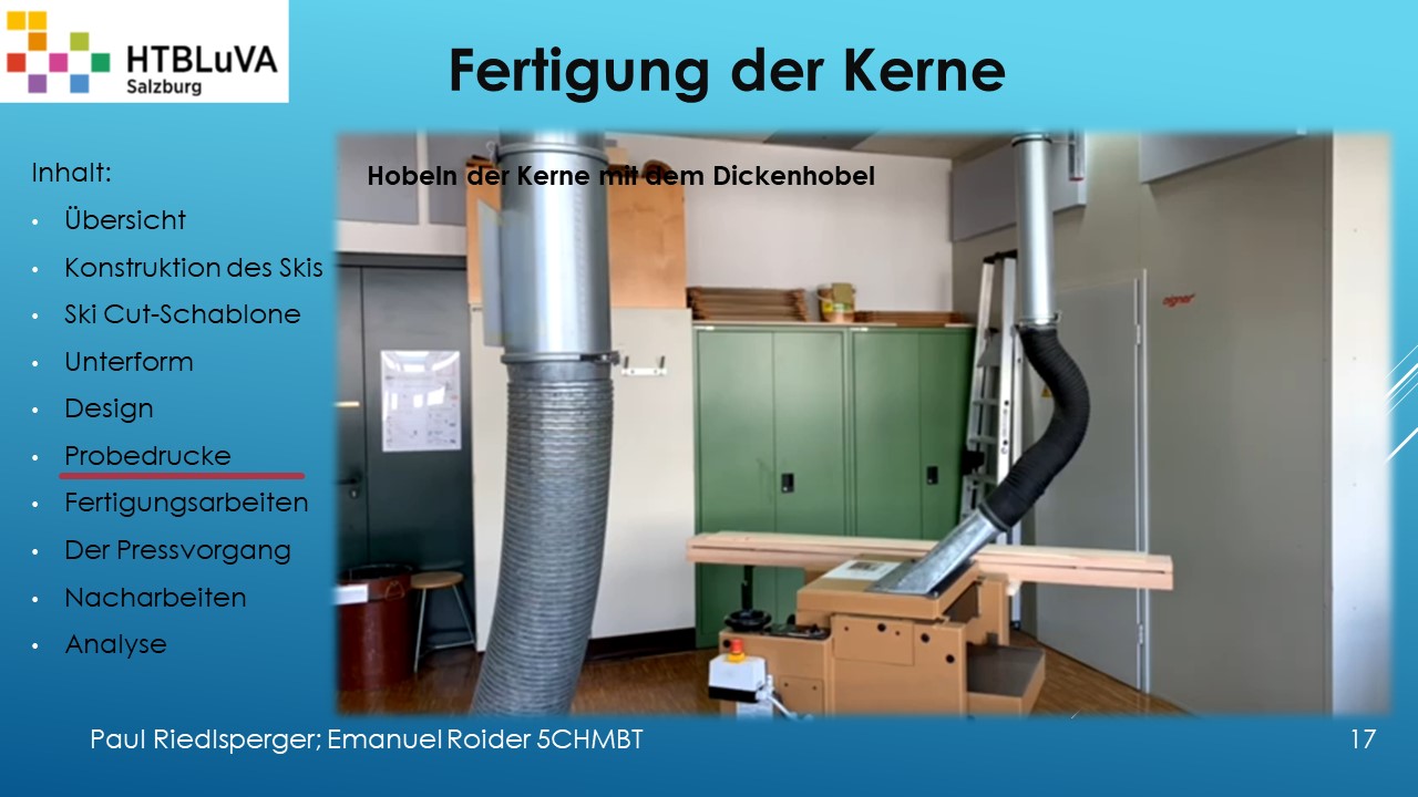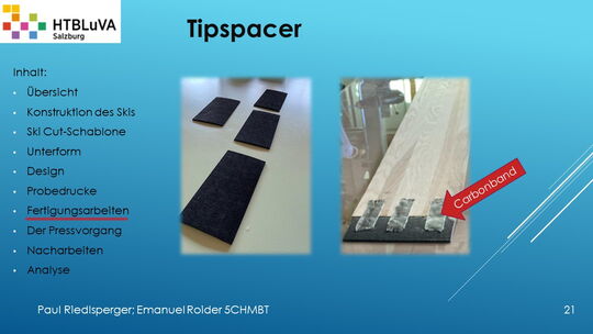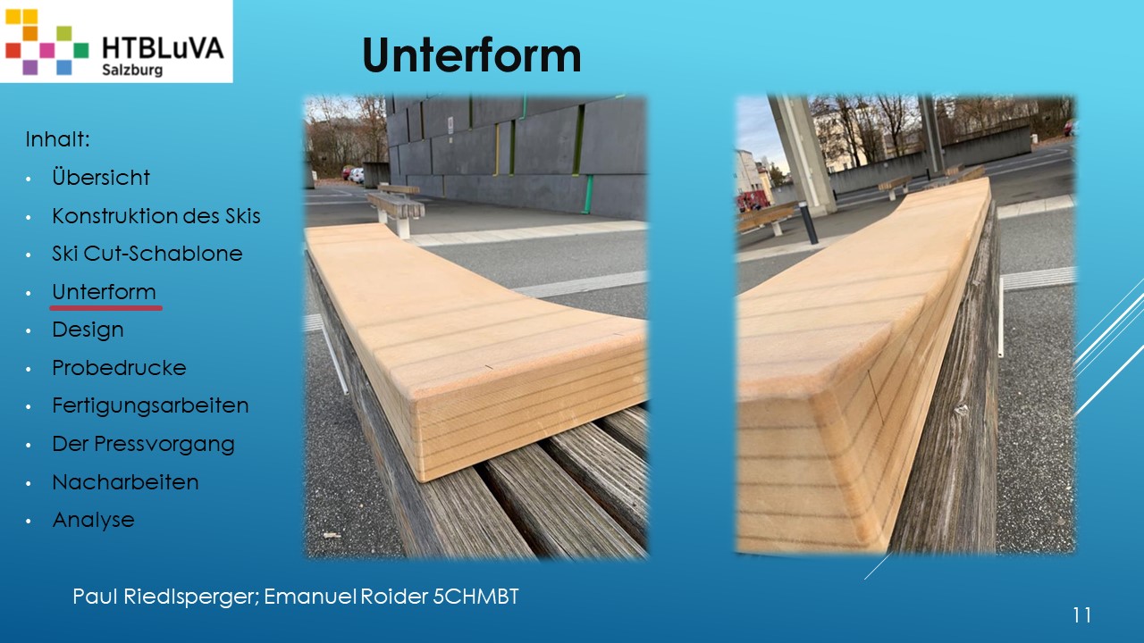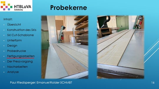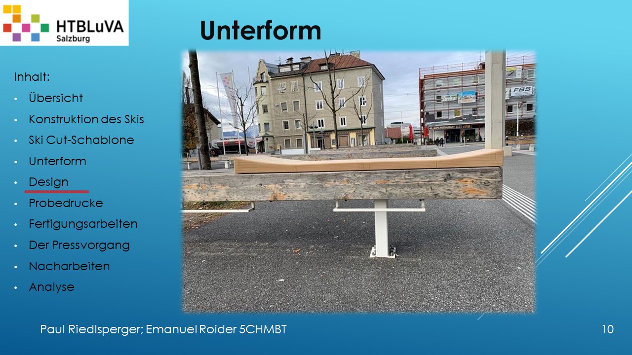 Hauptaufgabe unserer Diplomarbeit ist es, einen Ski in Zusammenarbeit mit Prof. Mag. Daniel Feichtinger von Grund auf zu planen, zu fertigen und zu analysieren. Um einen flexiblen und gleichzeitig sehr strapazierfähigen Ski entwerfen zu können, sind der Aufbau, das Material und die Form entscheidend für das optimale Verhalten im freien Gelände. All diese komplexen Konstruktions-, Planungs- und Fertigungsschritte werden wir anhand der Diplomarbeit umfangreich behandeln und optimieren.