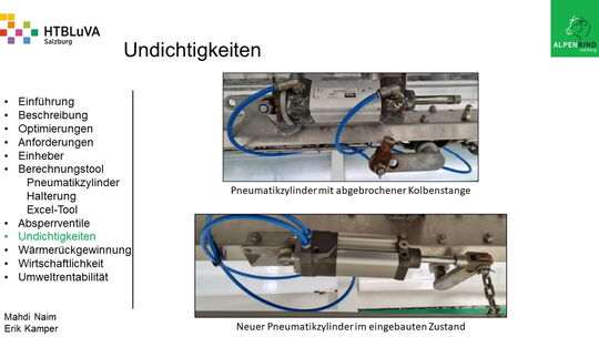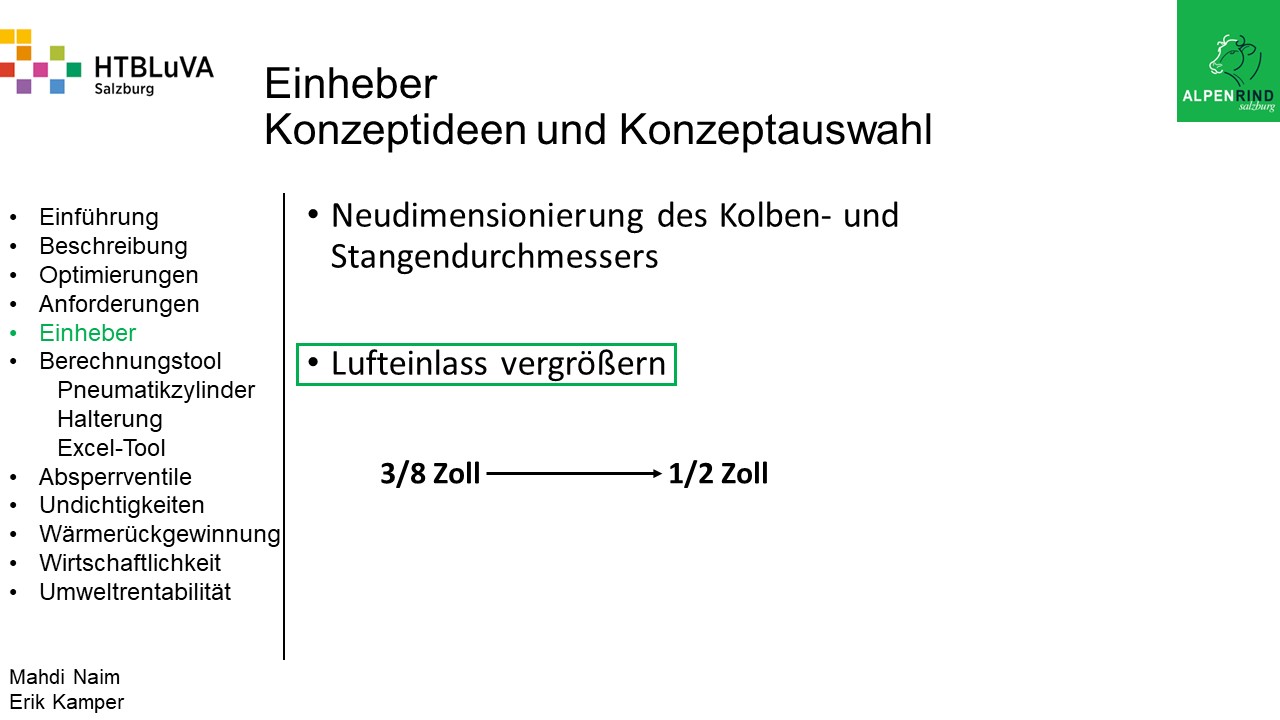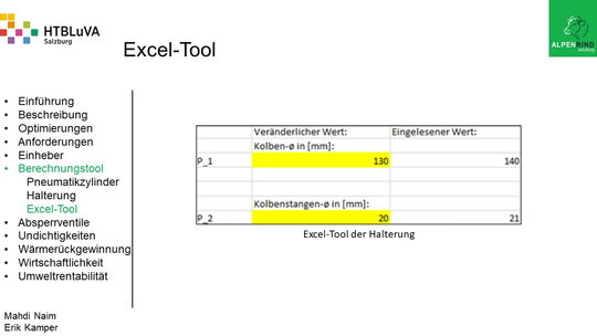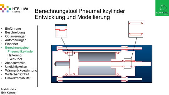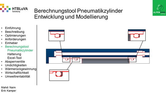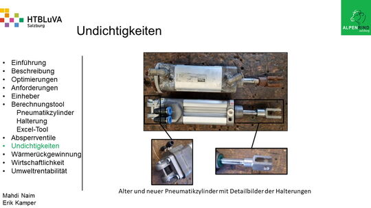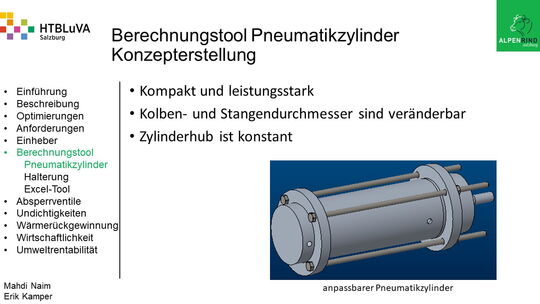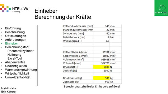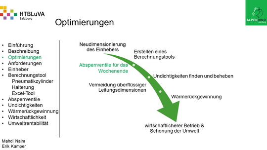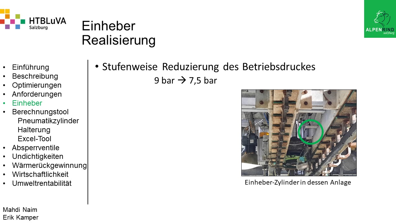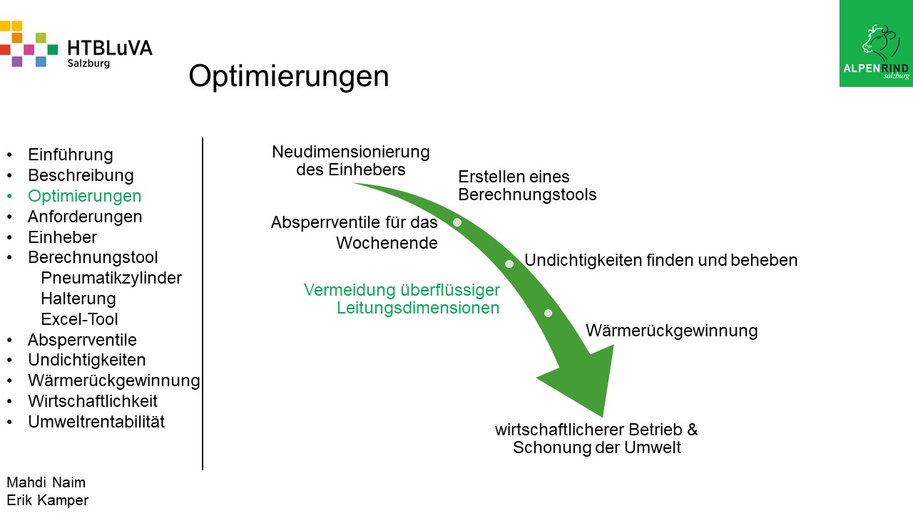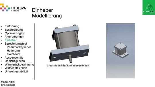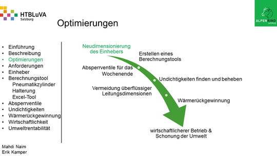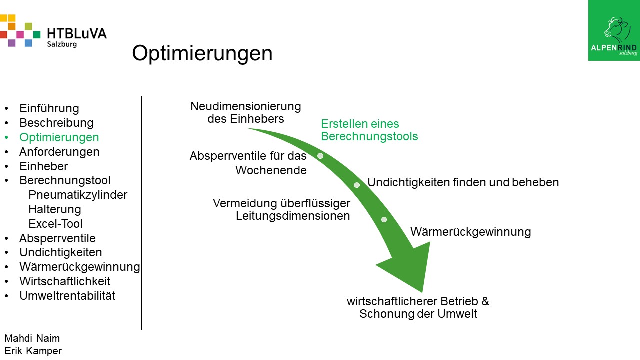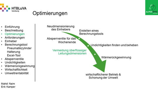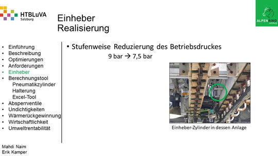 Um der Firma einen rentablen Betrieb zu gewähren, waren Tätigkeiten aus vielen Bereichen der Technik notwendig. Zur Senkung des Betriebsdruckes wurde der Einheber-Zylinder optimiert, da diese Anlage mehr Druck als alle anderen Anlagen benötigte. Durch unsere Optimierung wird der gesamte abgegebene Betriebsdruck gesenkt und somit werden die Drosseln an den anderen Maschinen hinunter geregelt. Weiters werden durch einen niedrigeren Druck die Maschinen geschont und dadurch gäbe es weniger Reparaturarbeiten und somit auch geringere Materialkosten, jedoch liegt unsere Motivation in der Schonung der Umwelt. Außerdem wurden weitere Optimierungen durchgeführt, um einen rentablen