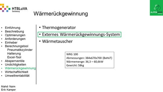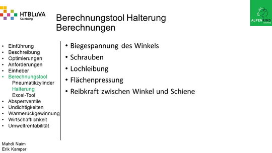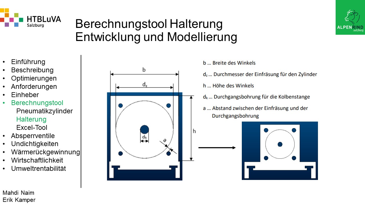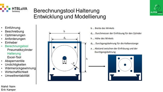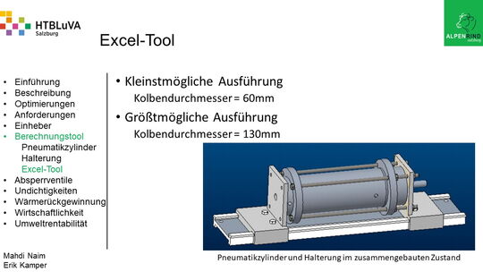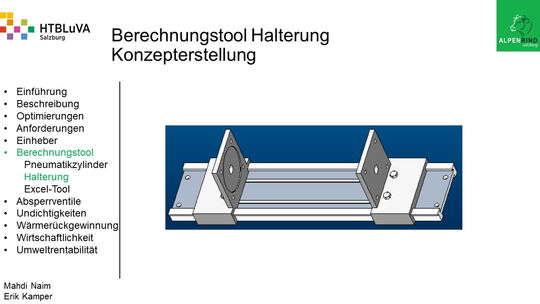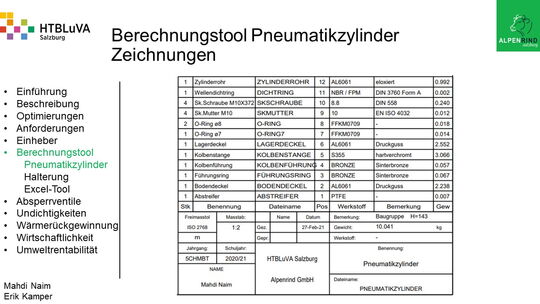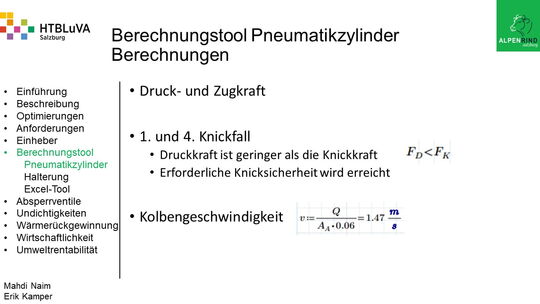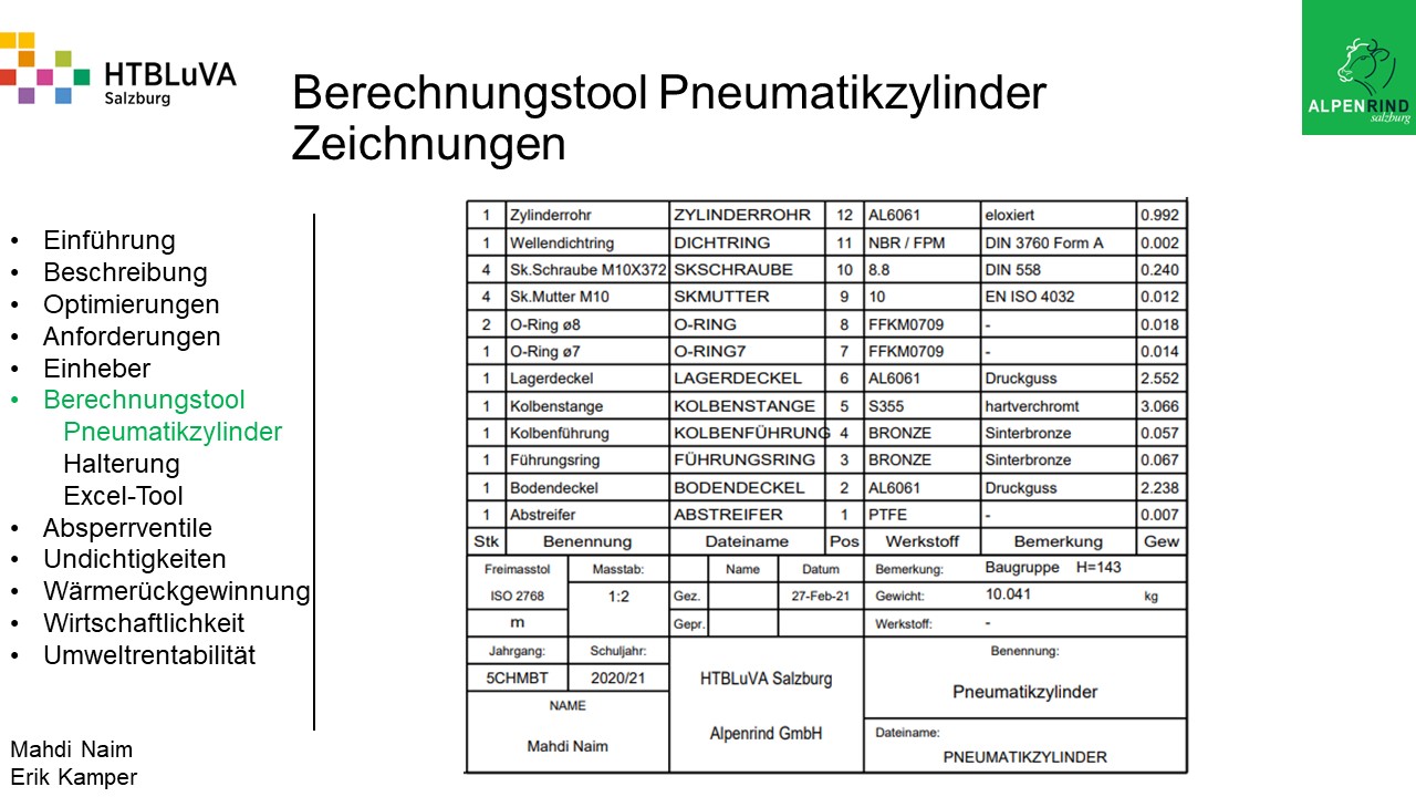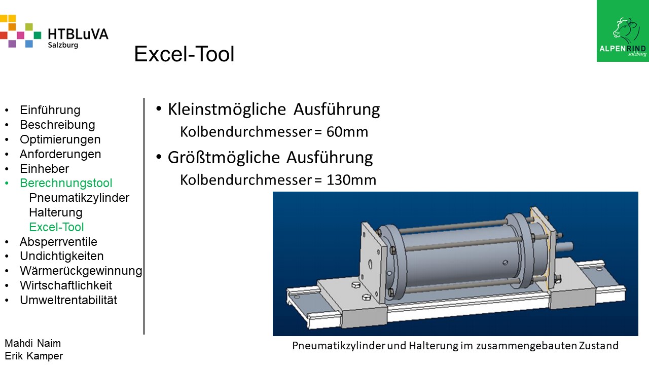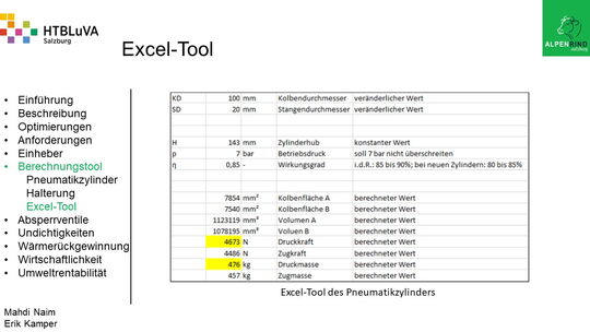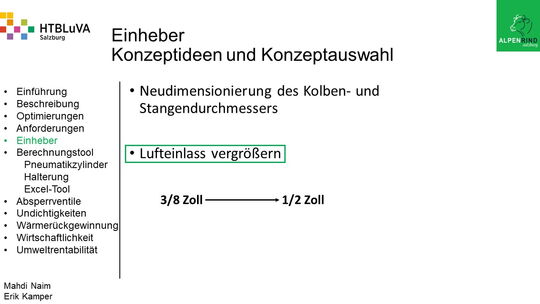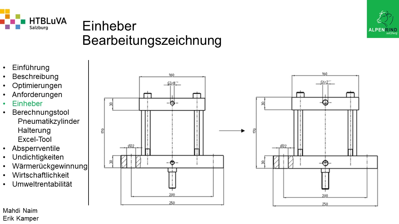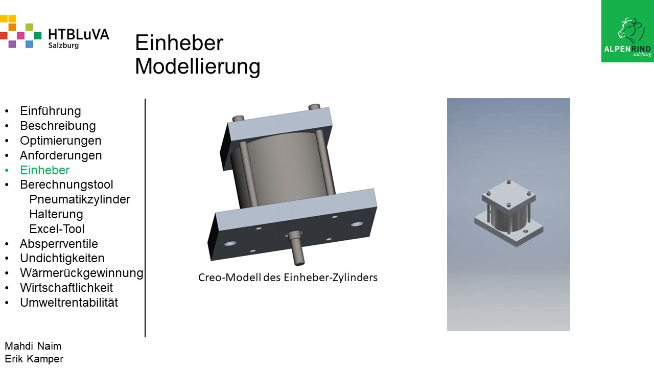 Um der Firma einen rentablen Betrieb zu gewähren, waren Tätigkeiten aus vielen Bereichen der Technik notwendig. Zur Senkung des Betriebsdruckes wurde der Einheber-Zylinder optimiert, da diese Anlage mehr Druck als alle anderen Anlagen benötigte. Durch unsere Optimierung wird der gesamte abgegebene Betriebsdruck gesenkt und somit werden die Drosseln an den anderen Maschinen hinunter geregelt. Weiters werden durch einen niedrigeren Druck die Maschinen geschont und dadurch gäbe es weniger Reparaturarbeiten und somit auch geringere Materialkosten, jedoch liegt unsere Motivation in der Schonung der Umwelt. Außerdem wurden weitere Optimierungen durchgeführt, um einen rentablen