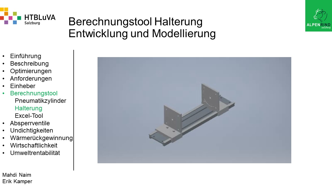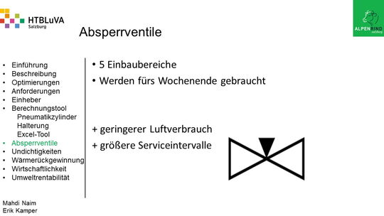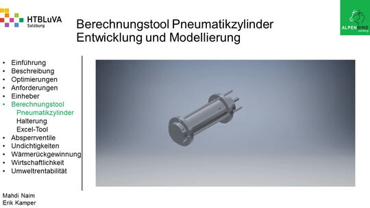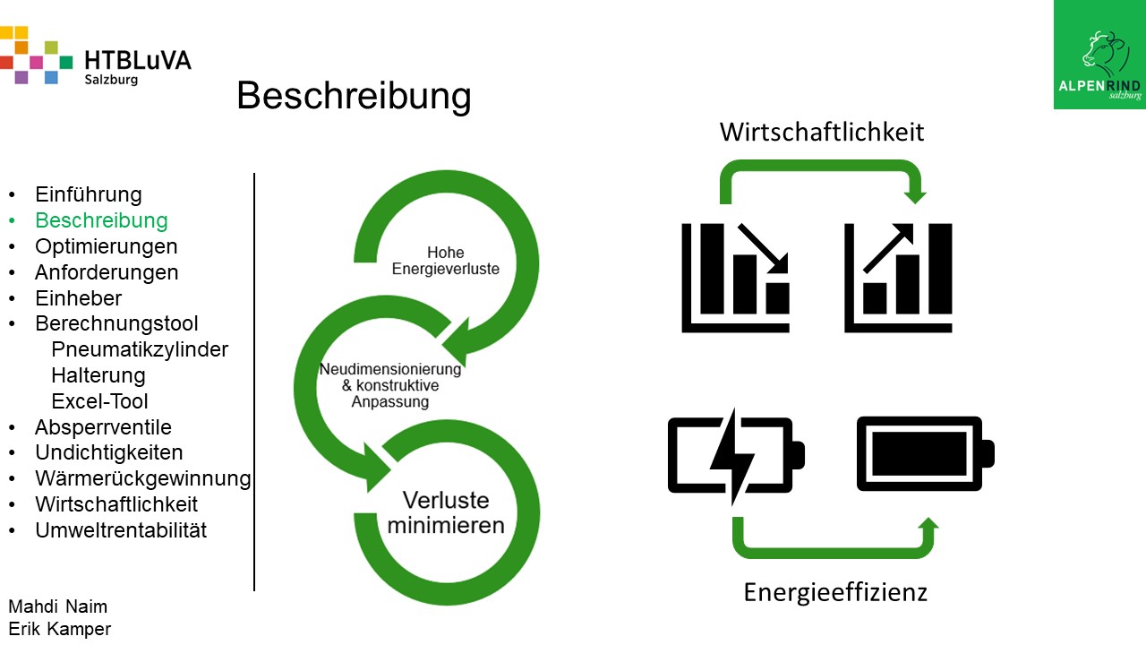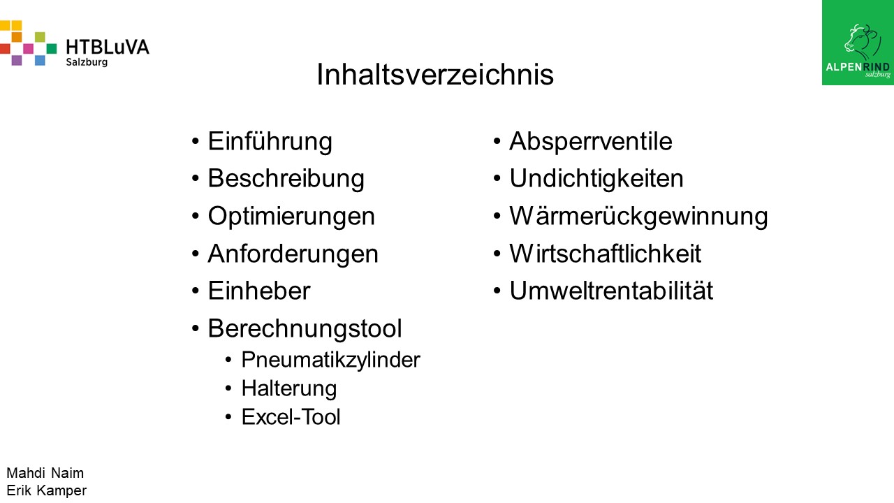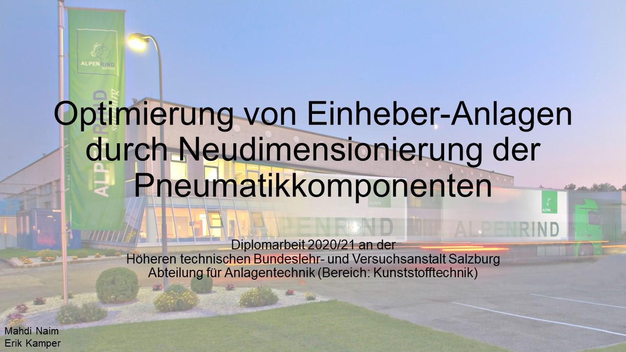 Die Firma Alpenrind betreibt verschiedene Pneumatik Anlagen. Dabei tritt das Problem auf, dass durch unterschiedlich hohe Druckniveaus hohe Energieverluste auftreten. Die Aufgabe ist es, die Pneumatik Anlagen neu zu dimensionieren und konstruktiv anzupassen, um die Verluste zu minimieren.